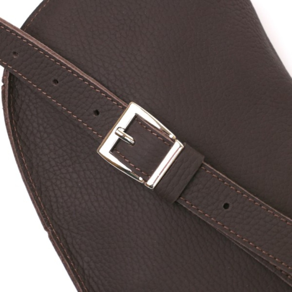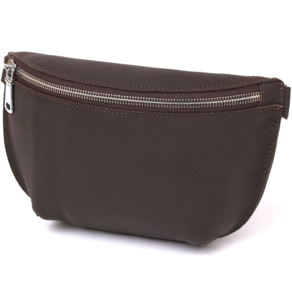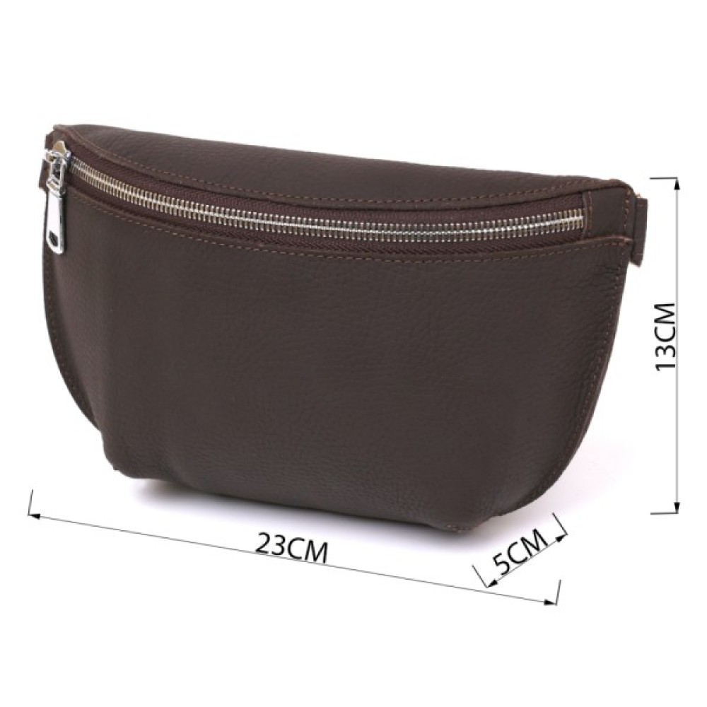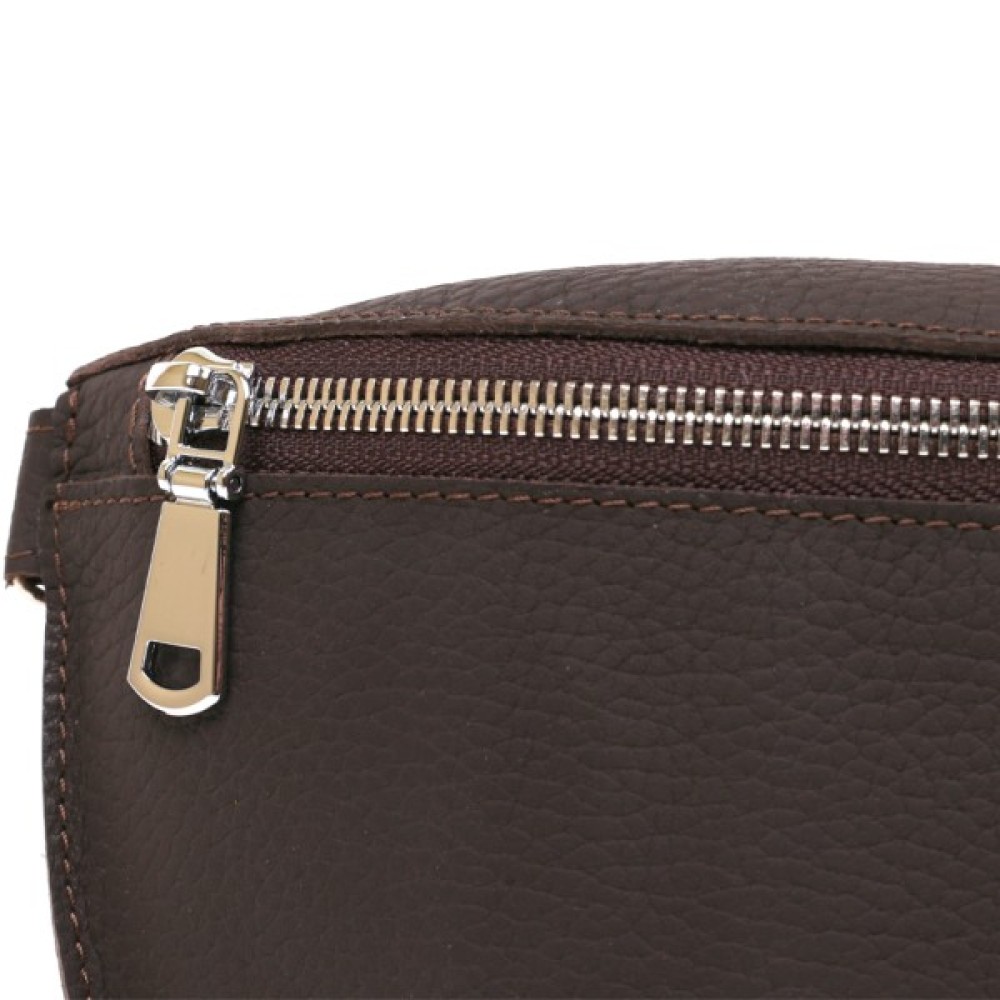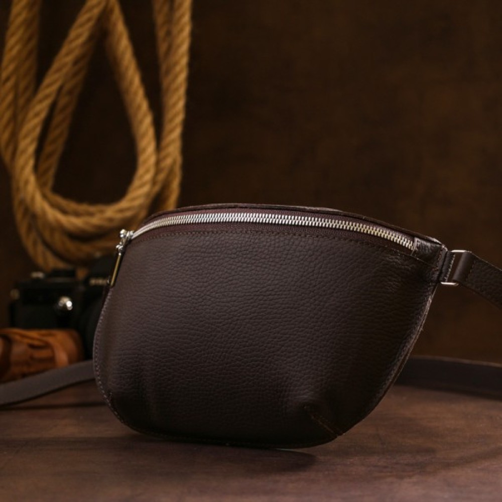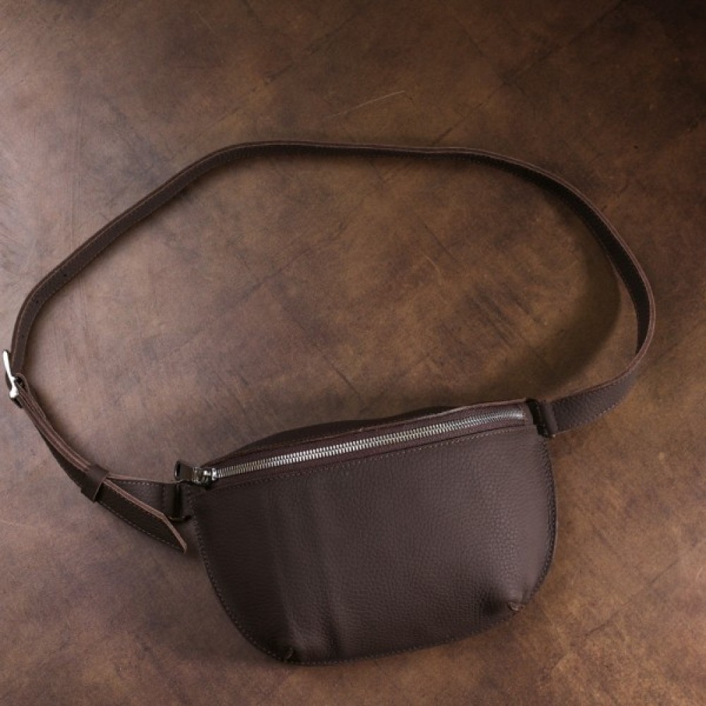Чудова жіноча бананка в коричневому матовому кольорі, що виглядає дуже стильно і красиво. Виконано виріб з натуральної шкіри високої якості та покращеними показниками міцності. Фактура – зерниста і дуже приємна на дотик. З такою сумкою можна і в дорогу, і на навчання, і роботу. Ремінь регулюється по довжині та виготовлений також з натуральної шкіри.