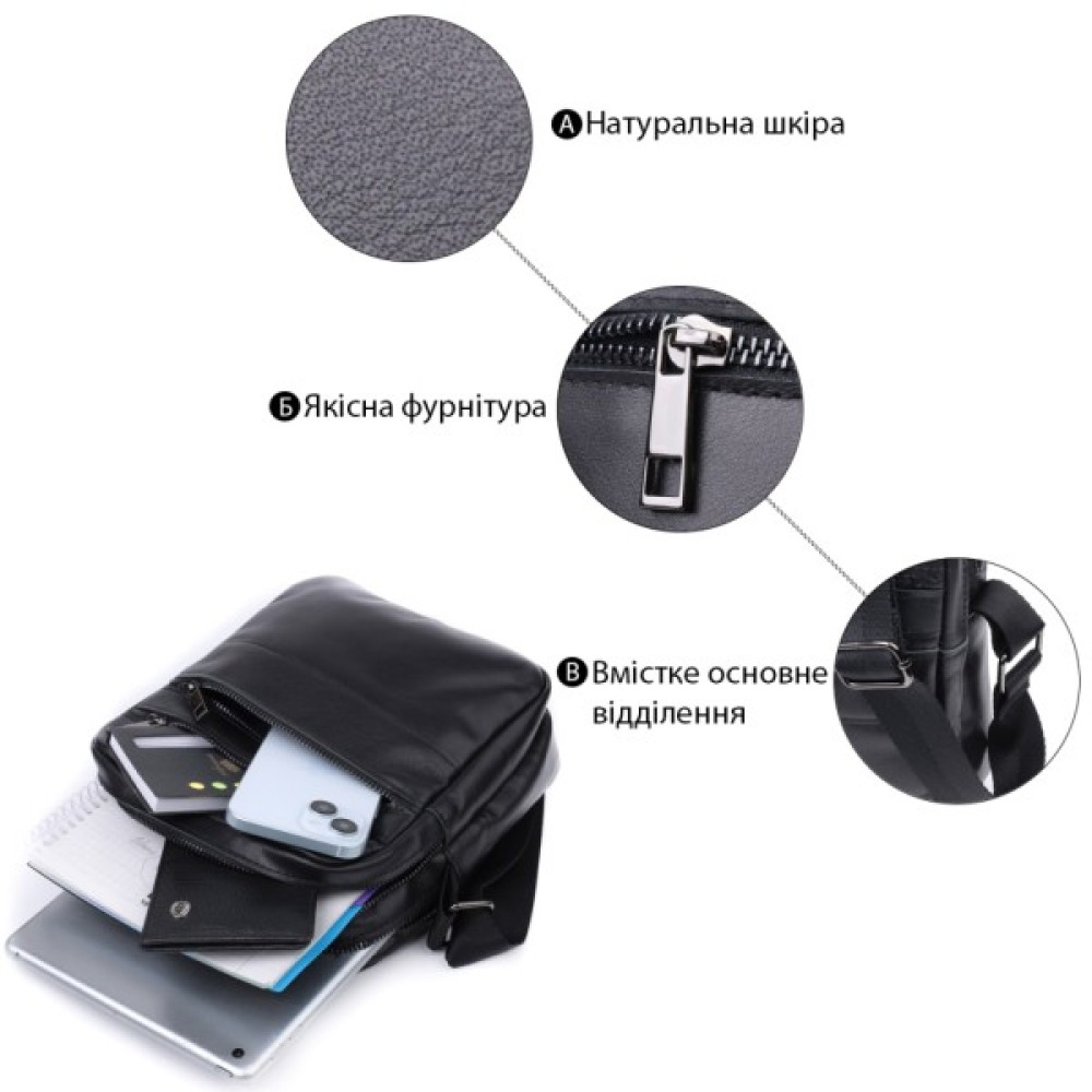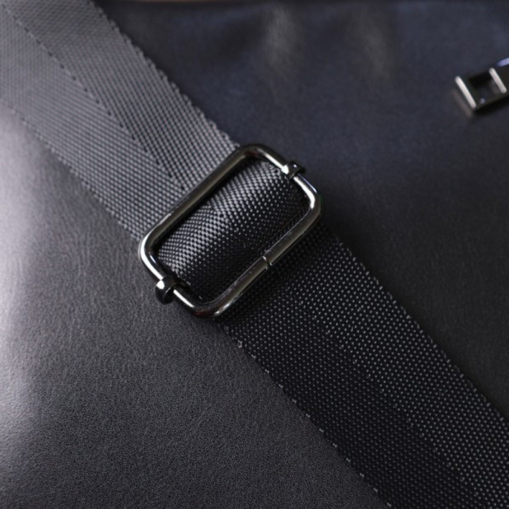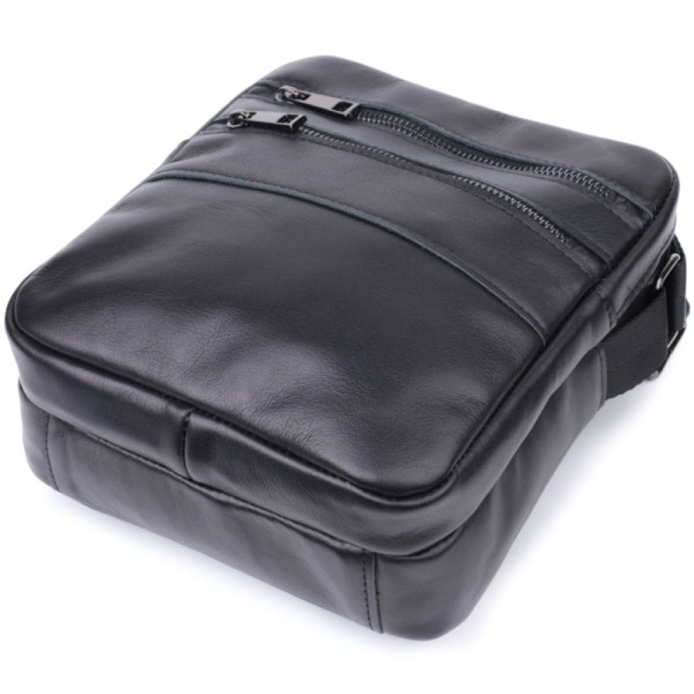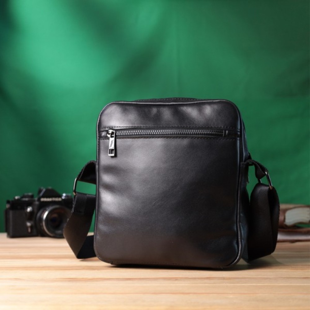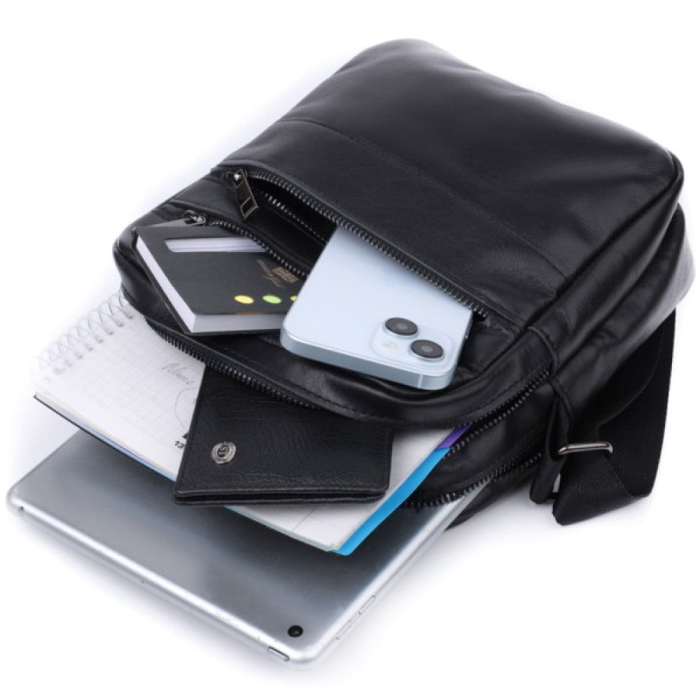 Чудова чоловіча сумка вертикального формату, виготовлена з натуральної гладкої шкіри чорного кольору.