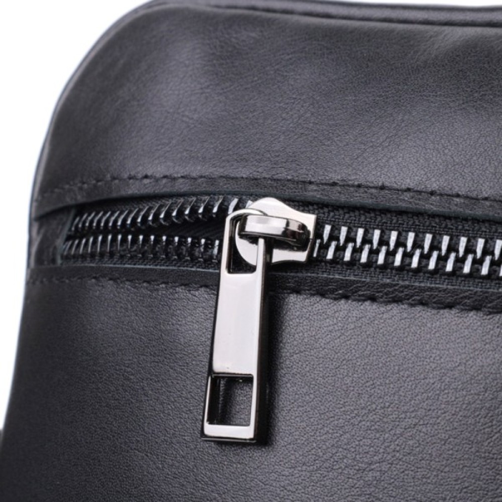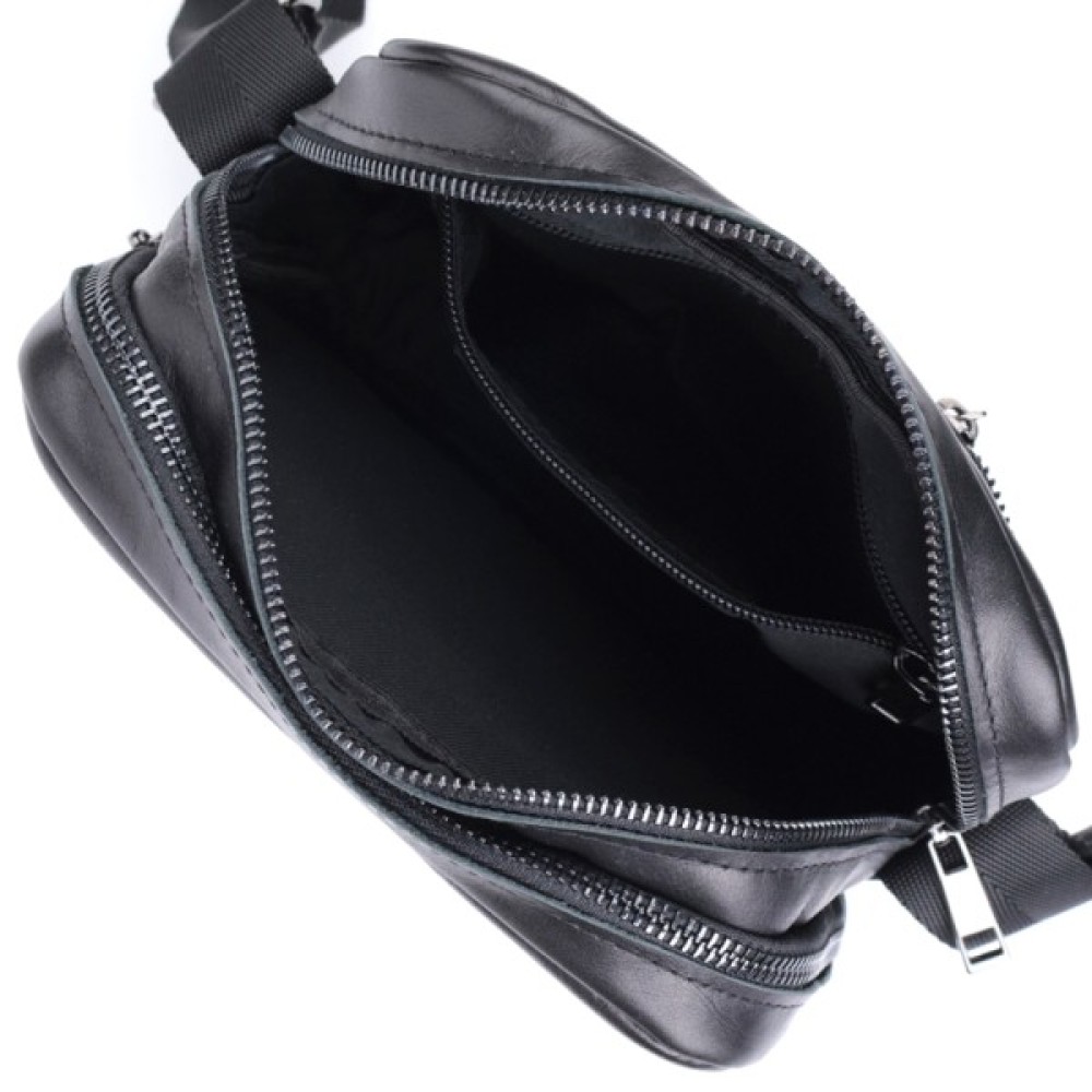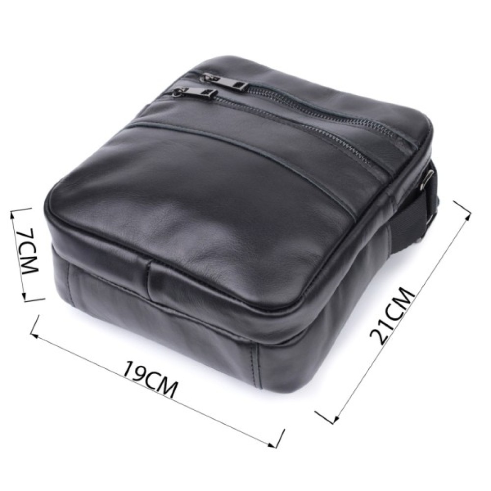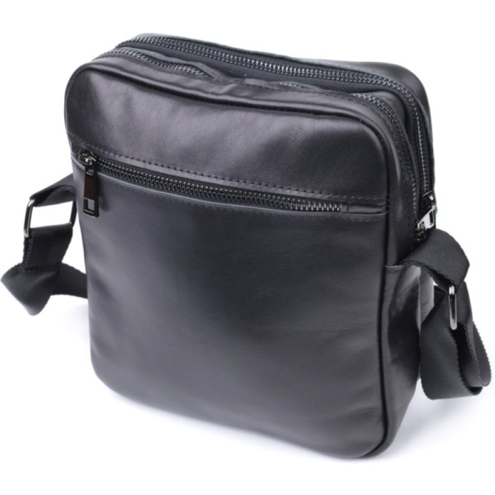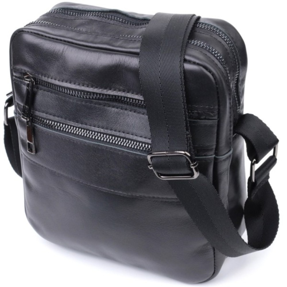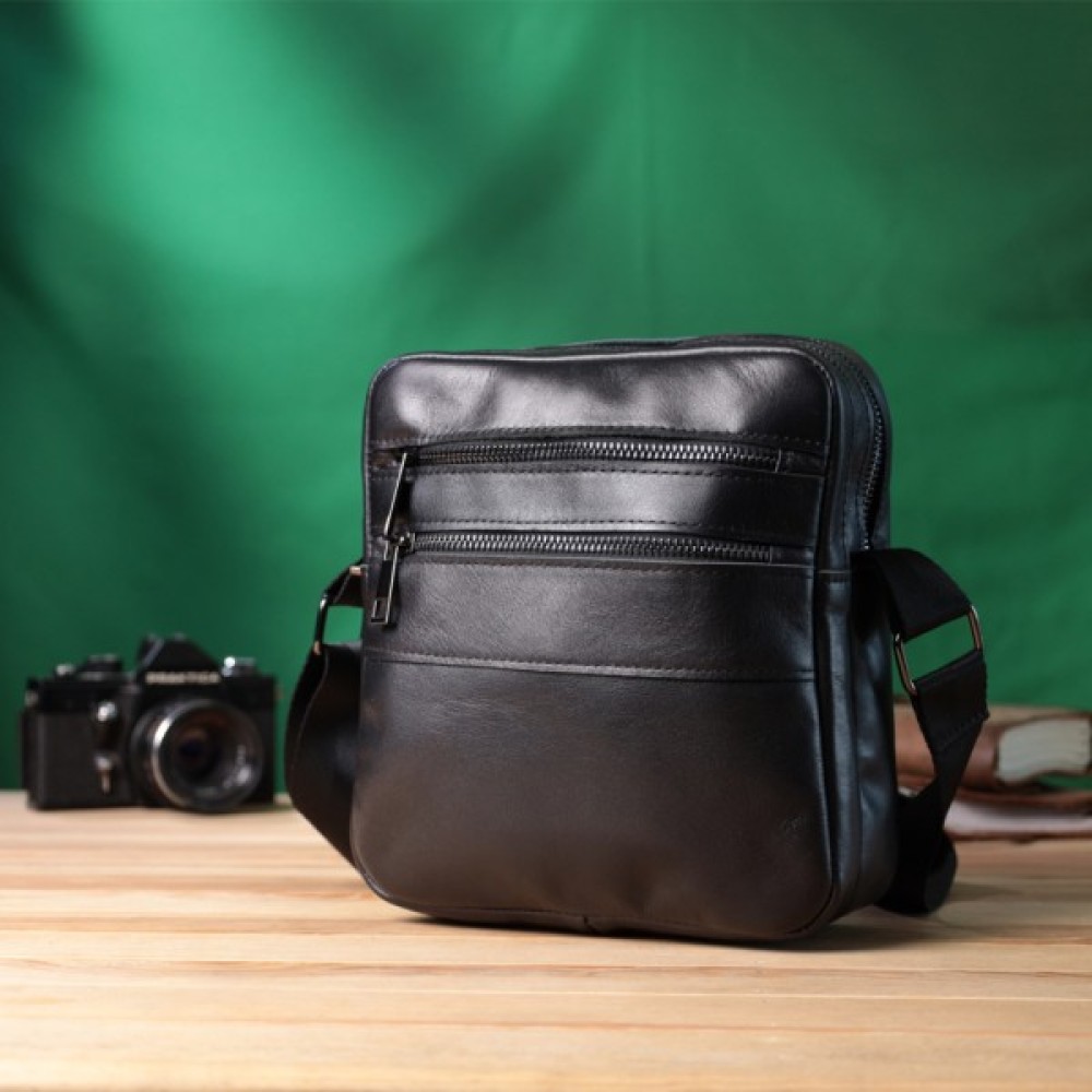 Чудова чоловіча сумка вертикального формату, виготовлена з натуральної гладкої шкіри чорного кольору.