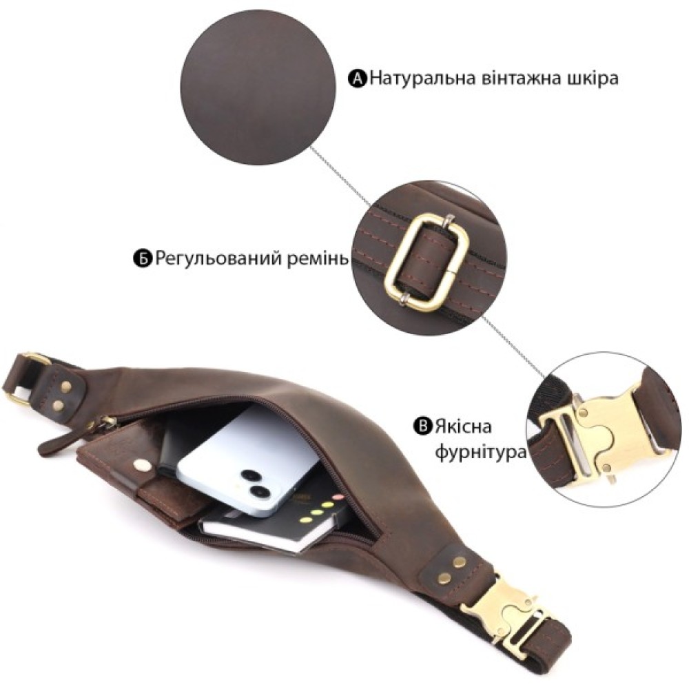 Чоловіча сумка-бананка з вінтажної коричневої шкіри — це стиль і практичність в одному аксесуарі.