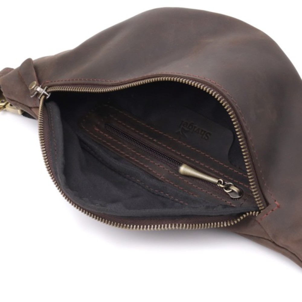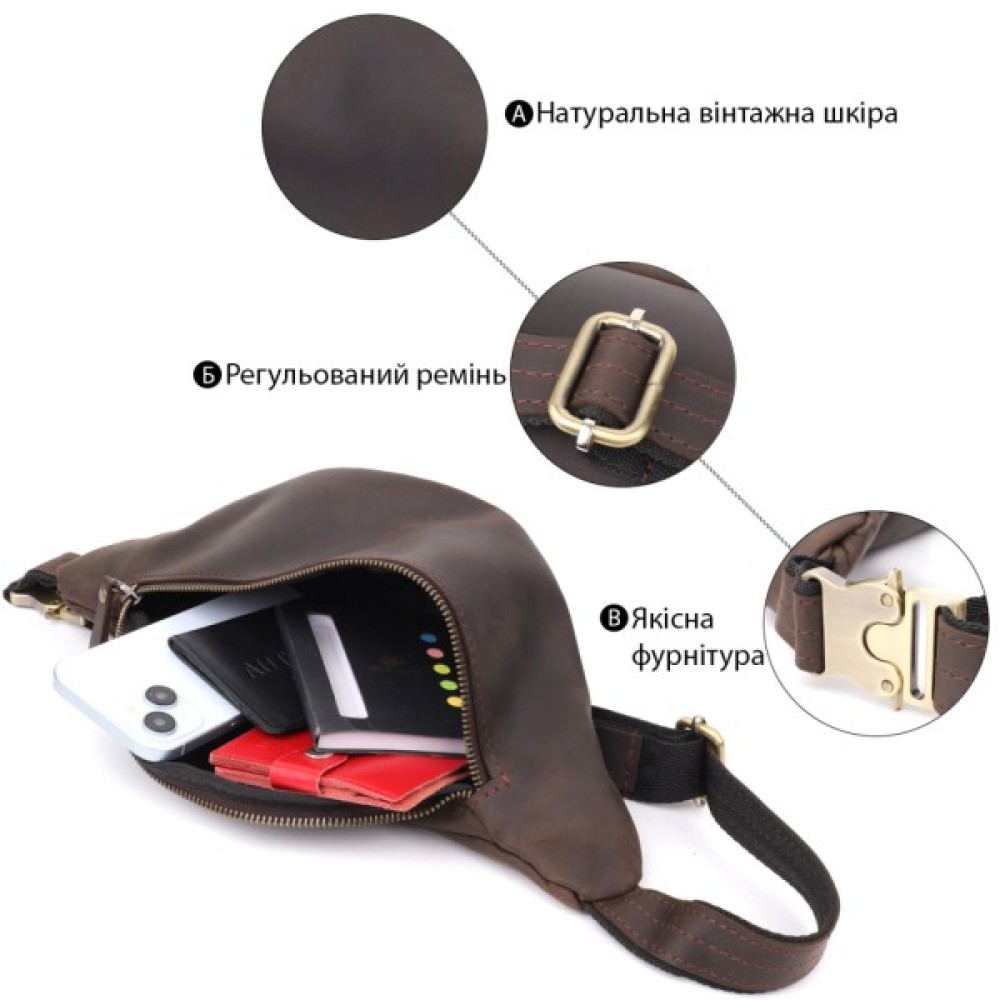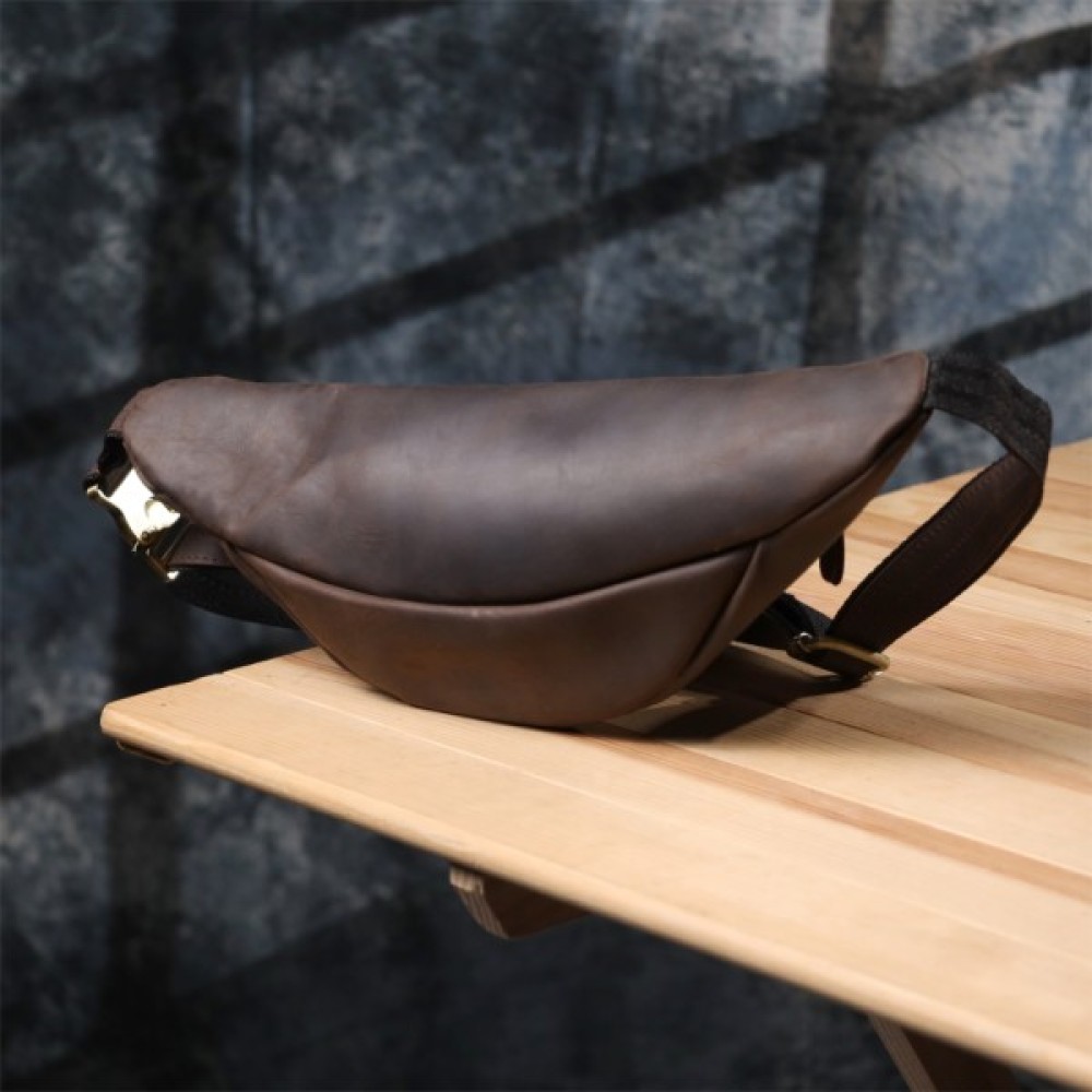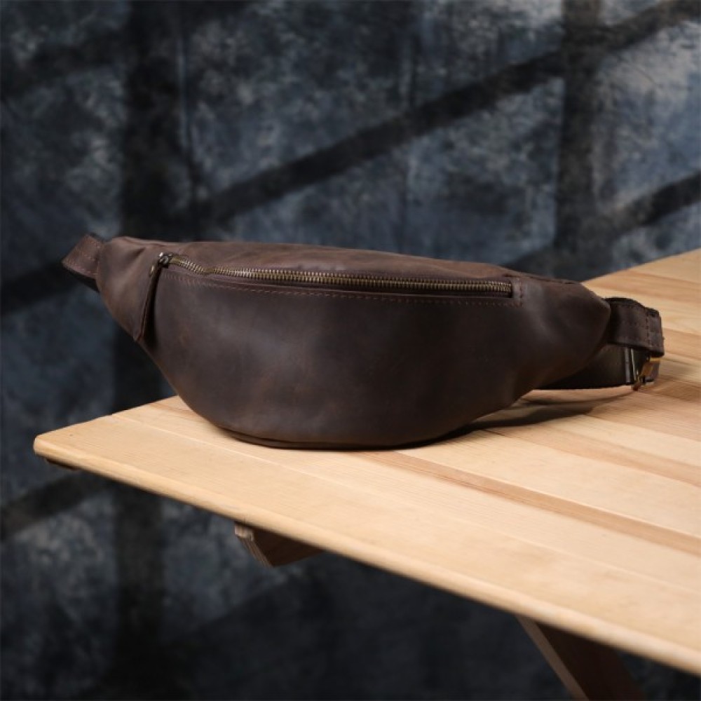 Сумка-бананка виконана з високоякісної натуральної вінтажної шкіри, що відрізняється міцністю та довговічністю. З роками шкіра набуває ще більш благородного вигляду, роблячи кожен аксесуар унікальним.