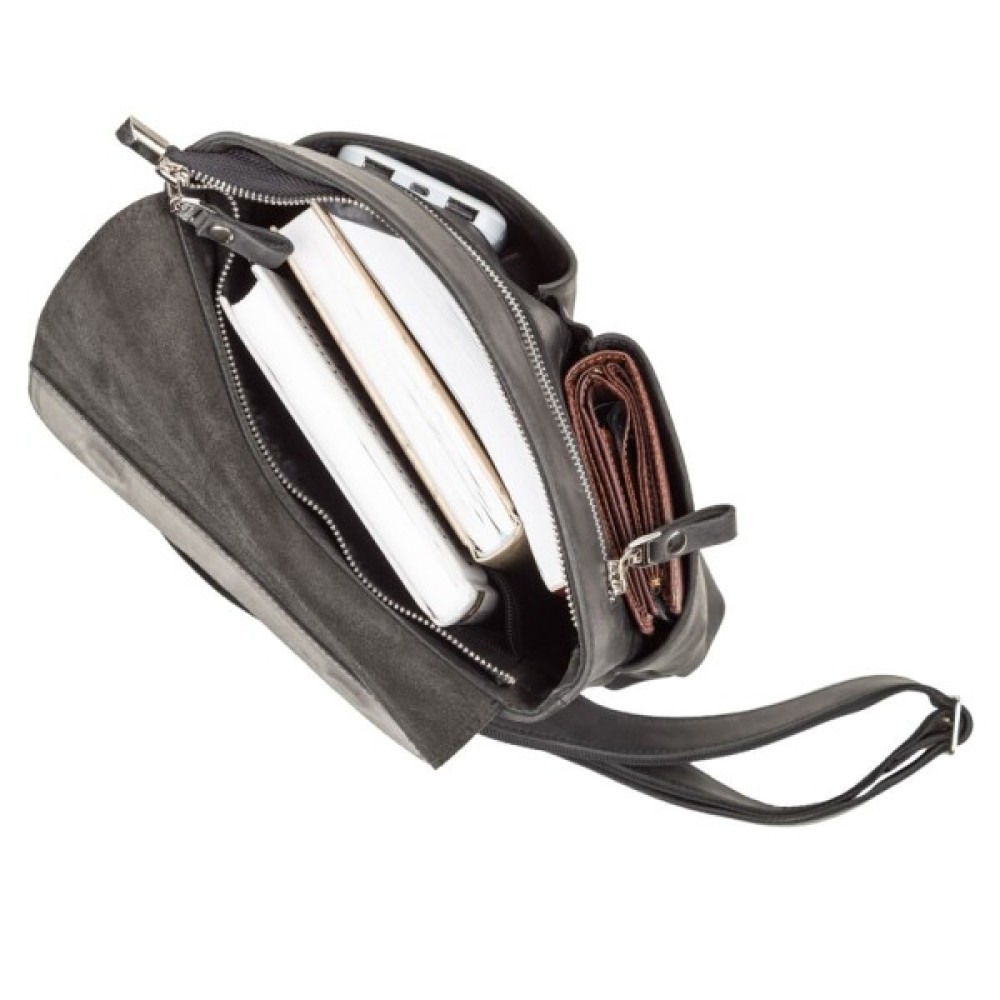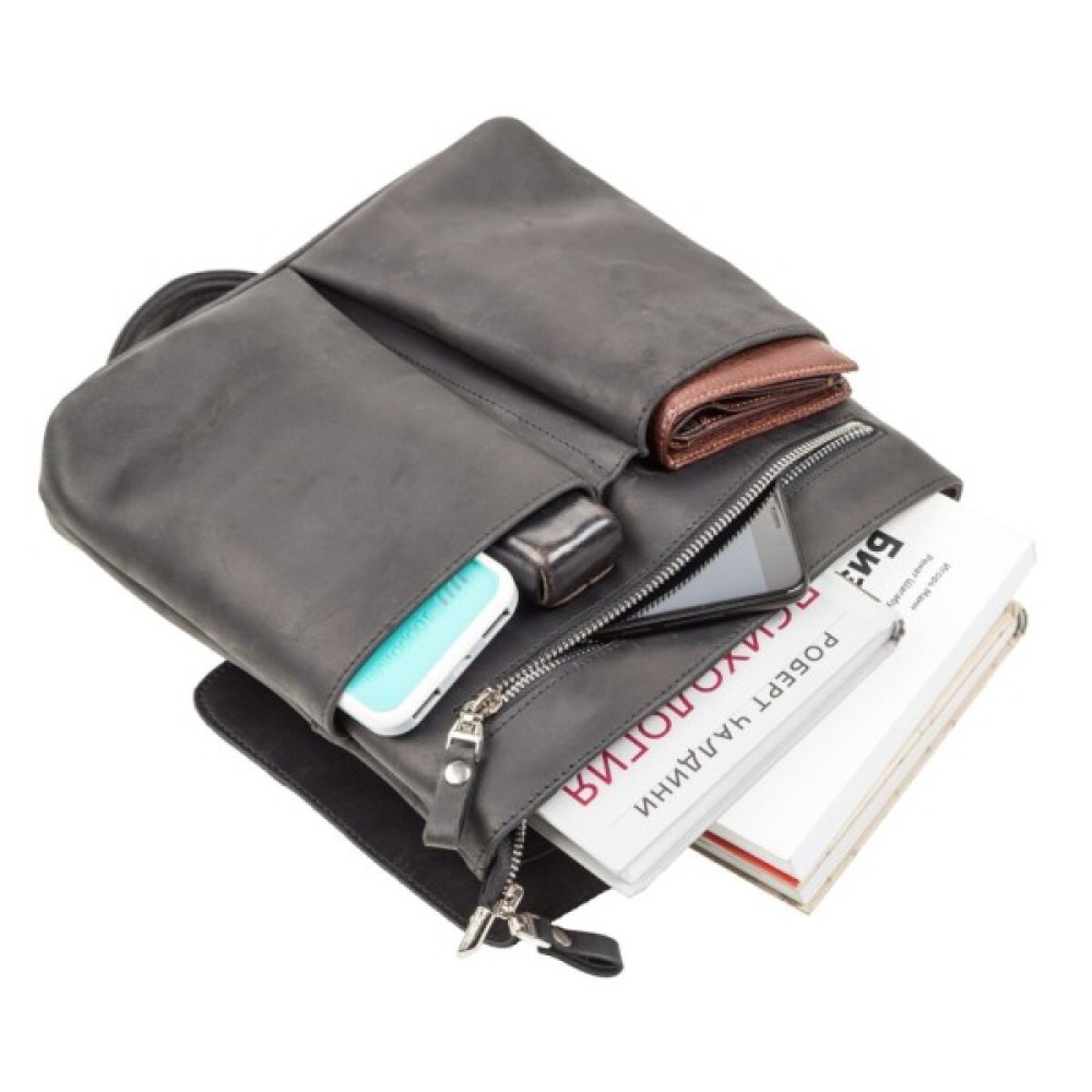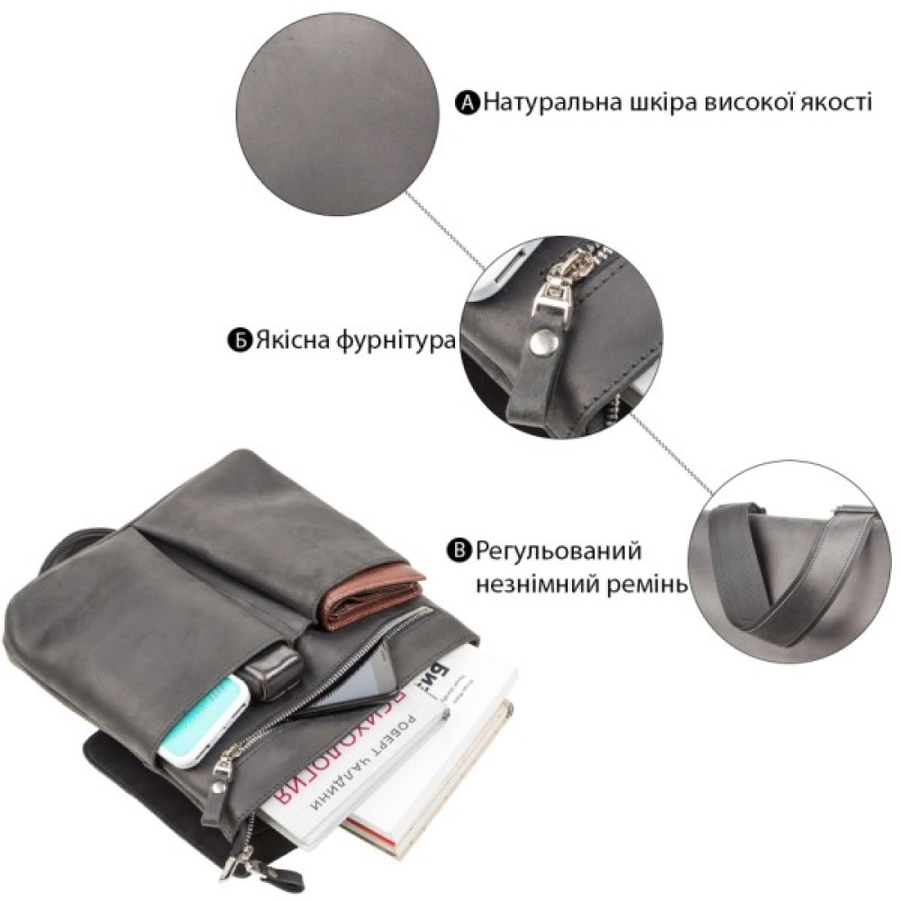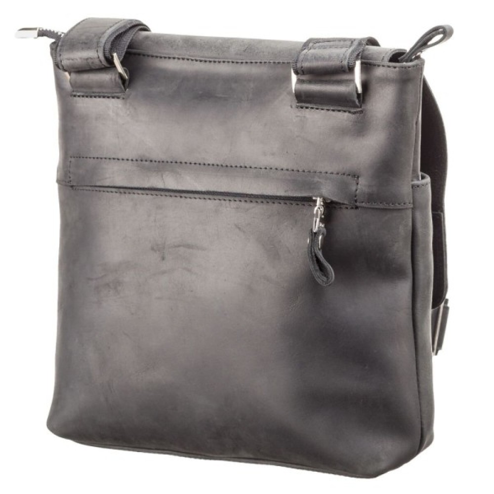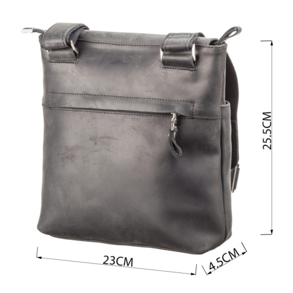 Сумка середніх розмірів з натуральної вінтажної шкіри для чоловіків, які щодня носять з собою багато дрібних речей (ключі, телефон, блокнот, портмоне, невеликий планшет і т.д.). Аксесуар досить вмісткий для своїх розмірів, закривається за допомогою клапана на магнітах, для додаткового захисту речей на блискавку.