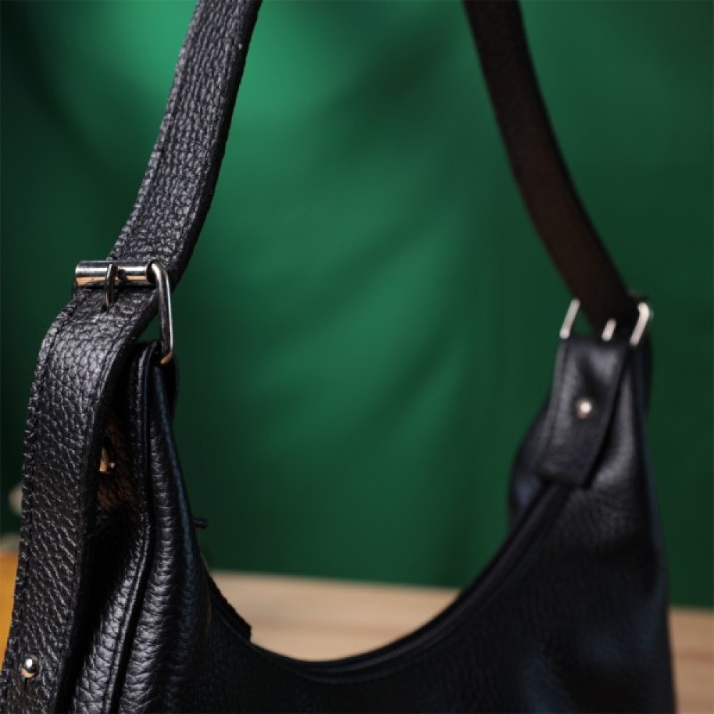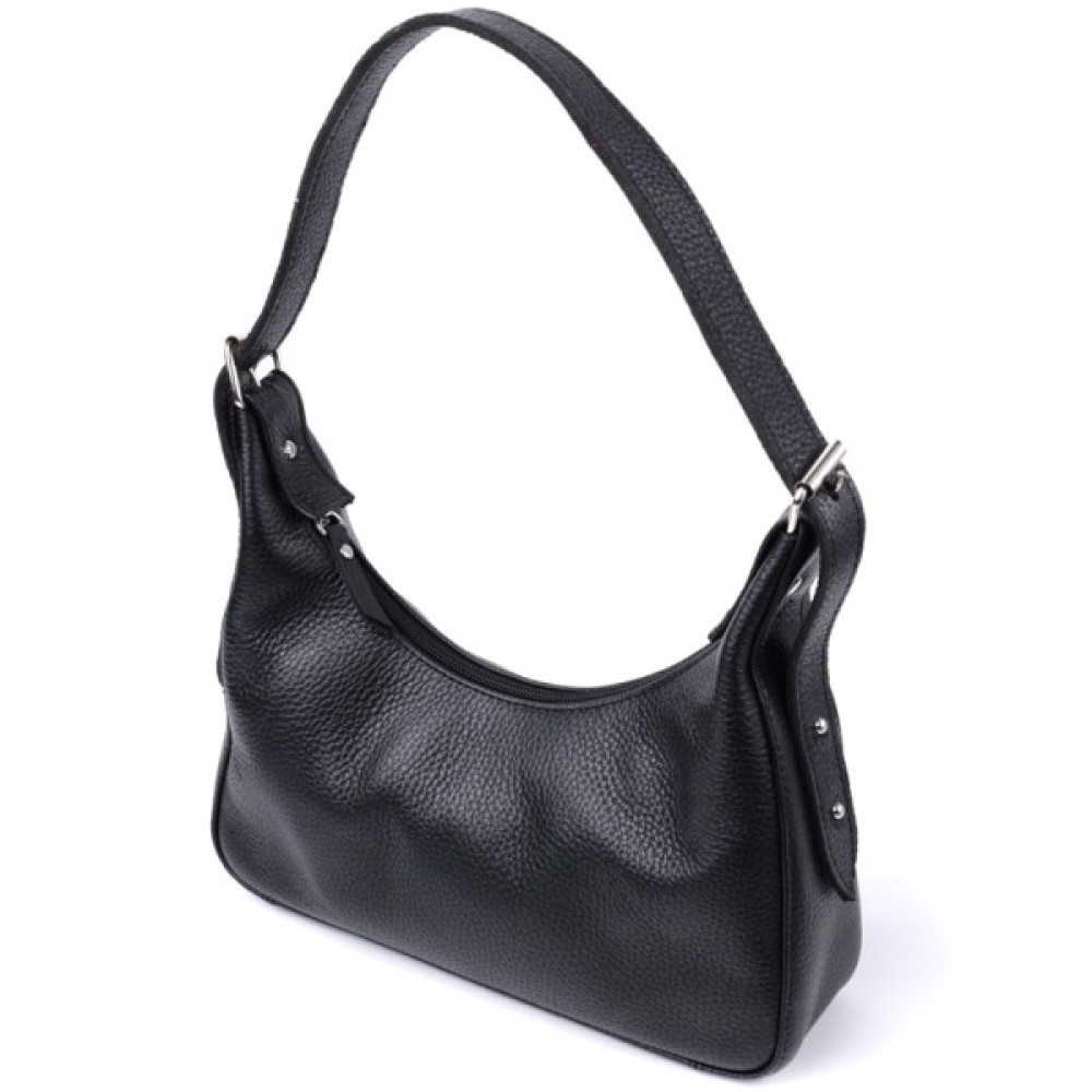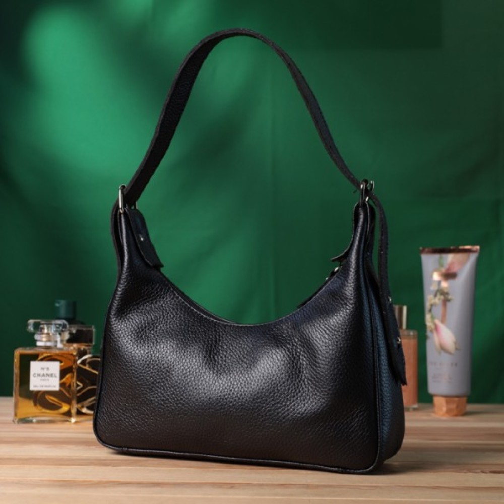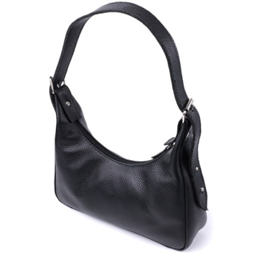 Стильна сумка для тих, хто любить дизайн без зайвих деталей. Це невелика модель з коротким ременем, зручно носити під рукою. Сумка-багет, яка набула популярності завдяки універсальному дизайну та оригінальній формі. Колір виробу – класичний чорний, фактура – зерниста. Матеріал – натуральна шкіра високої якості. Відмінний варіант на кожен день: практична та приваблива зовні. Функціональні внутрішні відділення дозволяють зручно організувати простір. Добре тримає форму завдяки якісним матеріалам.