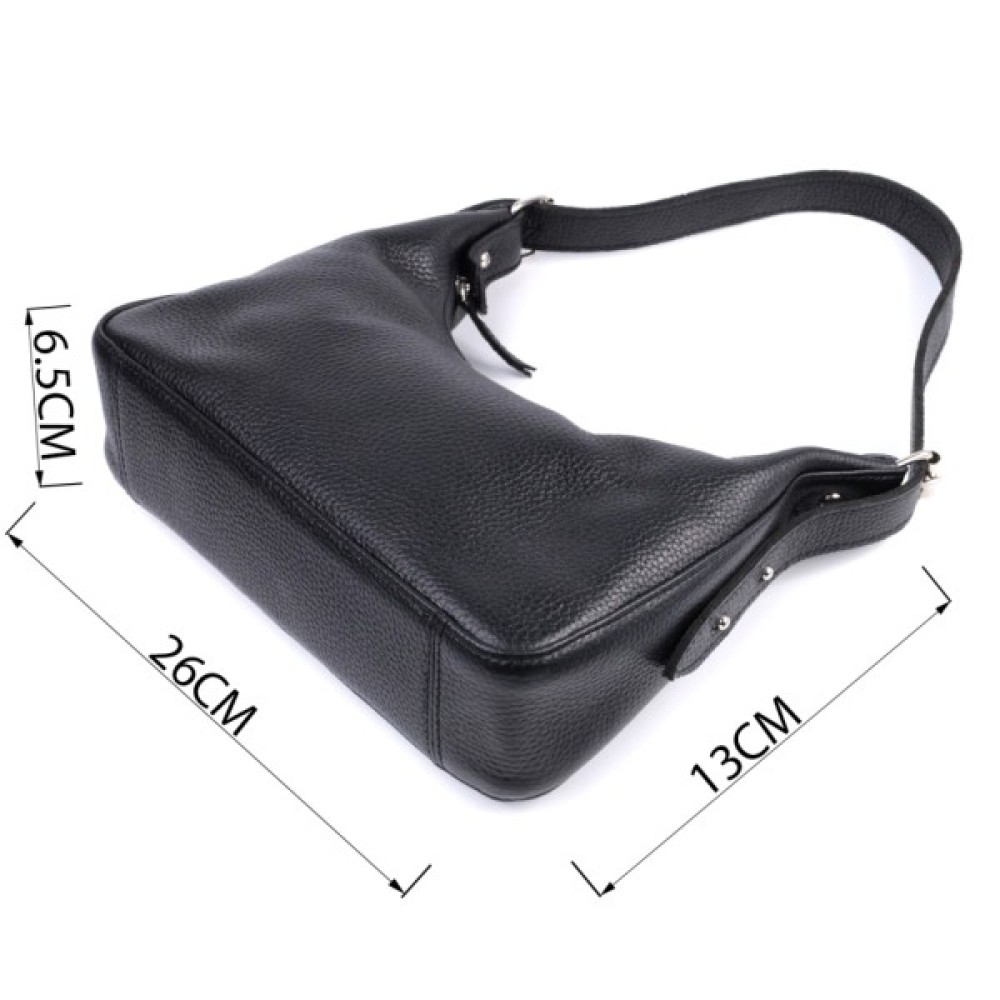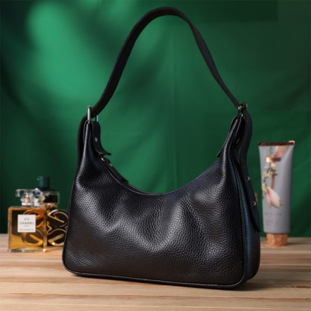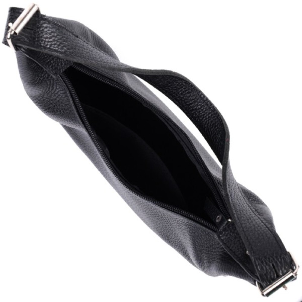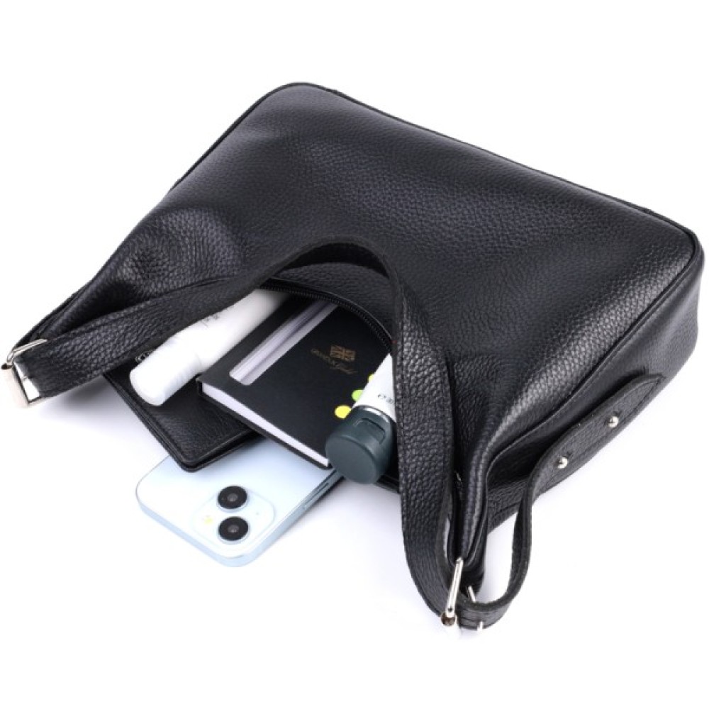 Стильна сумка для тих, хто любить дизайн без зайвих деталей. Це невелика модель з коротким ременем, зручно носити під рукою. Сумка-багет, яка набула популярності завдяки універсальному дизайну та оригінальній формі. Колір виробу – класичний чорний, фактура – зерниста. Матеріал – натуральна шкіра високої якості. Відмінний варіант на кожен день: практична та приваблива зовні. Функціональні внутрішні відділення дозволяють зручно організувати простір. Добре тримає форму завдяки якісним матеріалам.