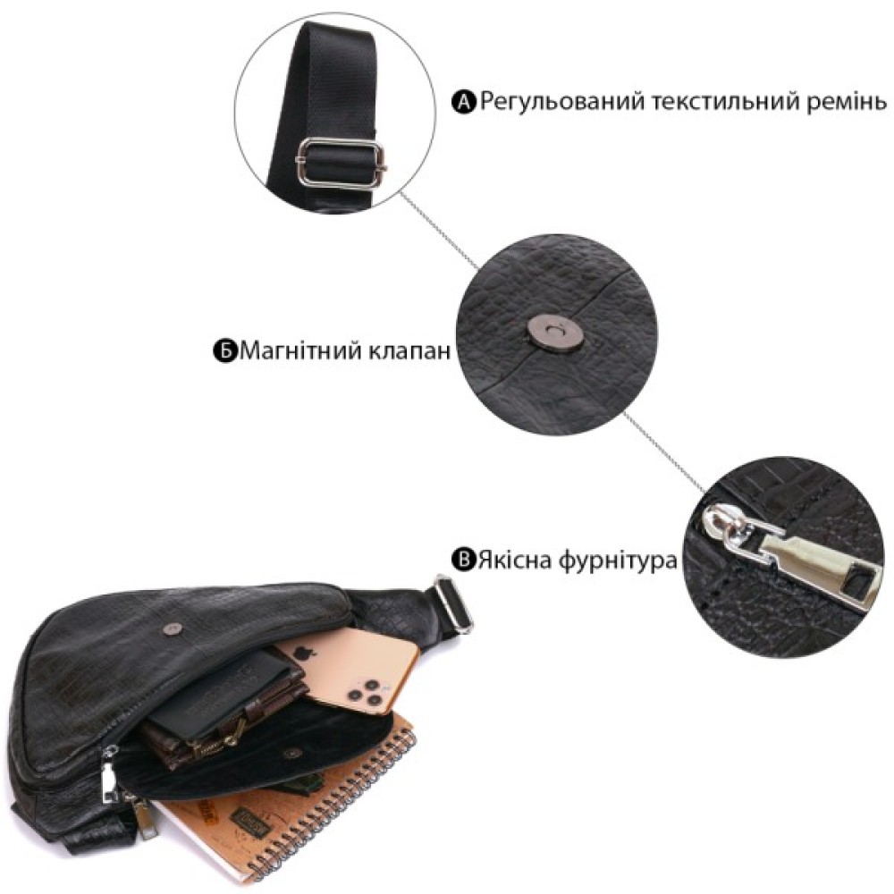Особливості на тильній стороні кишеня на блискавці; текстильний регульований незнімний ремінець на праве або ліве плече; кишеня під клапаном на магнітах, на лицьовій стороні