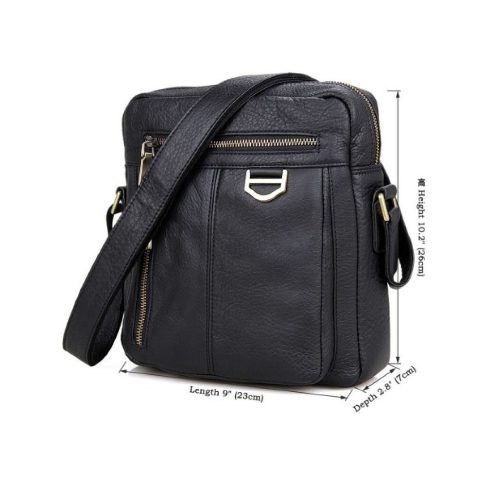 Добротна чоловіча сумка через плече з натуральної шкіри. Колір фурнітури: латунь. Сумка акуратно прошита міцною ниткою чорного кольору. На лицевій стороні розташовано два відділення на блискавці. Ще одне відділення на блискавці — на задній зовнішній стороні. Дана модель закривається на блискавку. Сумка упакована в текстильний пилозахисний чохол білого кольору.