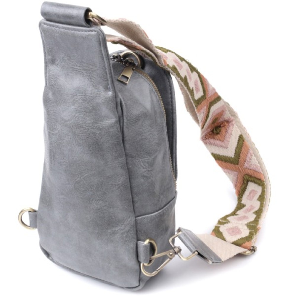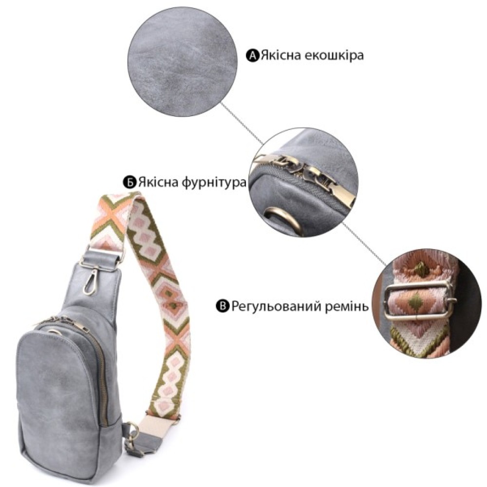 Дана модель складається з одного основного відділення, яке закривається на блискавку і в якому знаходяться три кишені для кредитних карток усередині, а також однієї потайної кишені на лицьовій стороні, що закривається на карабін. Акцентом даної моделі є зручний регульований плечовий ремінець у етнічному стилі, що дуже модно вже кілька сезонів. Екошкіра - високоякісна альтернатива натуральному матеріалу, яка дуже стійка до тертя, до низьких температур, відмінно носиться на відміну від інших штучних матеріалів, а також має гіпоалергенний склад на відміну від натуральної шкіри. Мода не стоїть на місці, на зміну класичним сумкам приходять нові моделі, які обумовлені сучасним часом, саме такою є слінг сумка - зручна, практична, невелика, але містка і головне якісна.