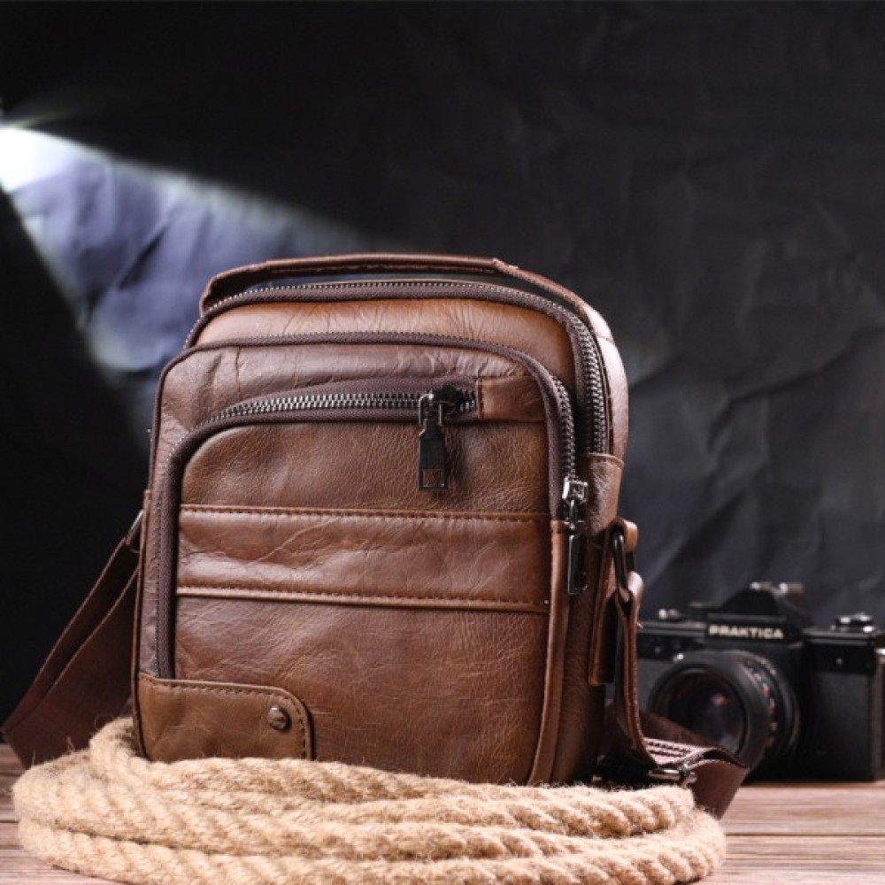 Зручна якісна чоловіча сумка з натуральної шкіри високої якості виконання. Має стриманий та стильний дизайн. Колір виробу світло-коричневий, що виглядає дуже красиво та сучасно. У цій моделі передбачено містке основне відділення та просторі зовнішні кишені на блискавці.