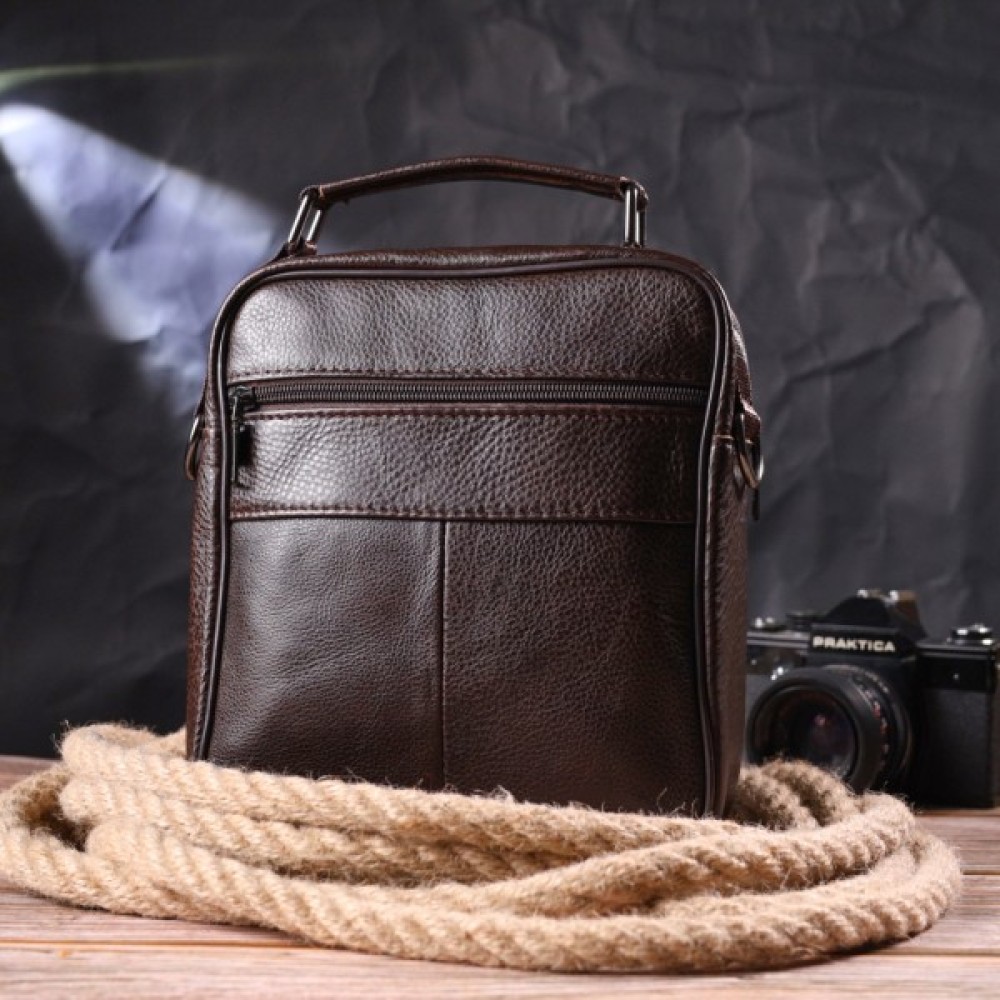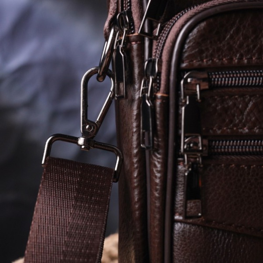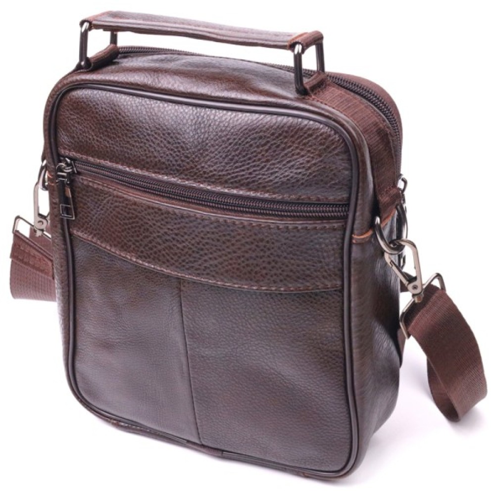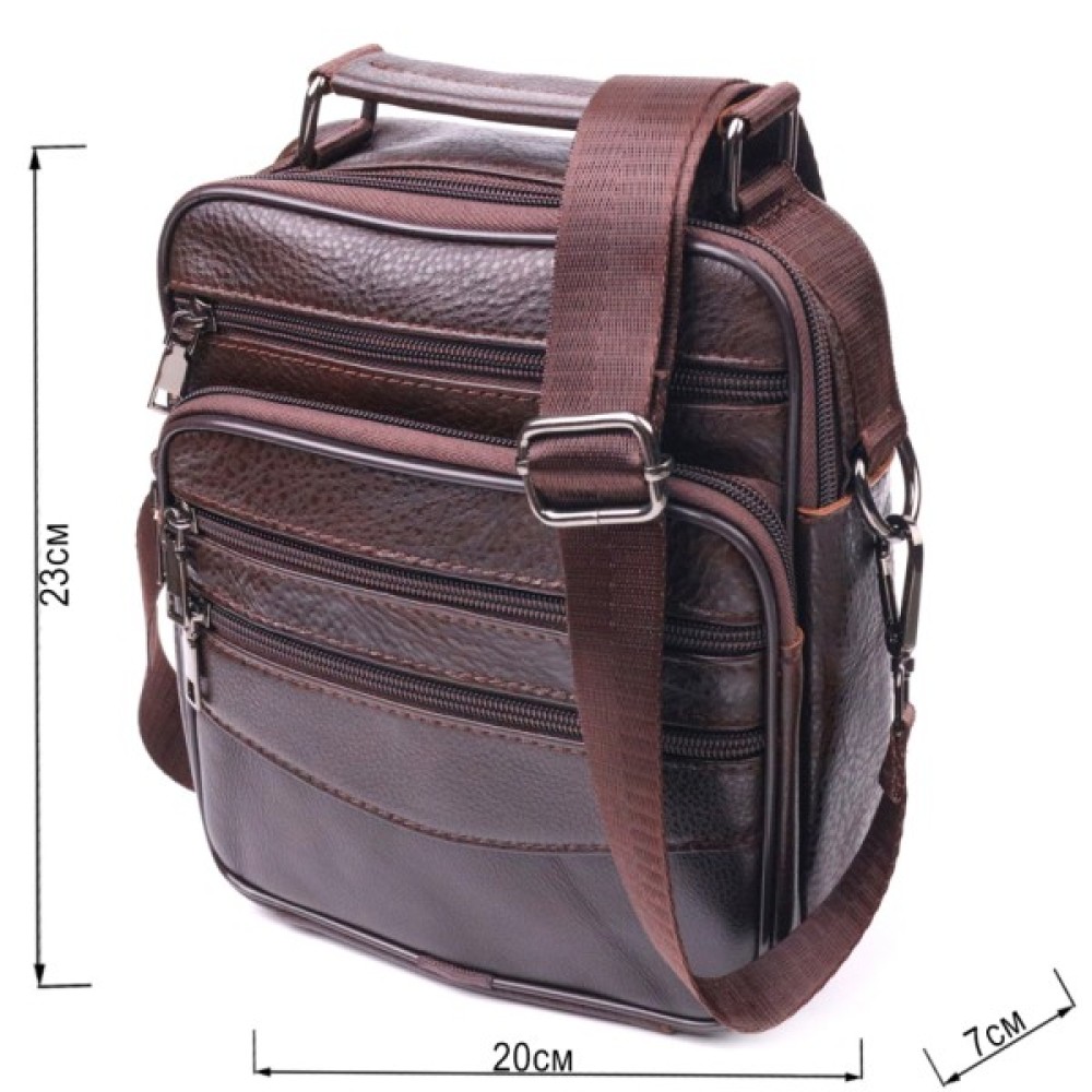 Зручна чоловіча сумка середнього розміру із натуральної шкіри. Відмінна модель, яка ідеально підійде на кожен день. У сумку з легкістю помістяться всі необхідні речі. З такою сумкою всі Ваші речі будуть в порядку, з нею також буде зручно ходити на роботу чи зустрічі. Доповнено виріб якісною фурнітурою темно-срібного кольору. Сумка стане чудовим подарунком для близької людини.