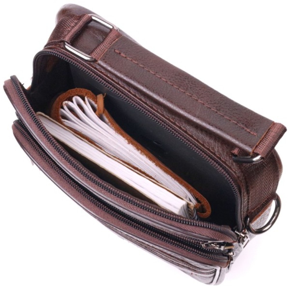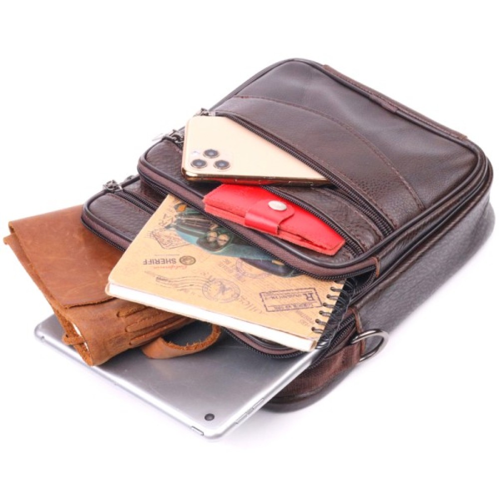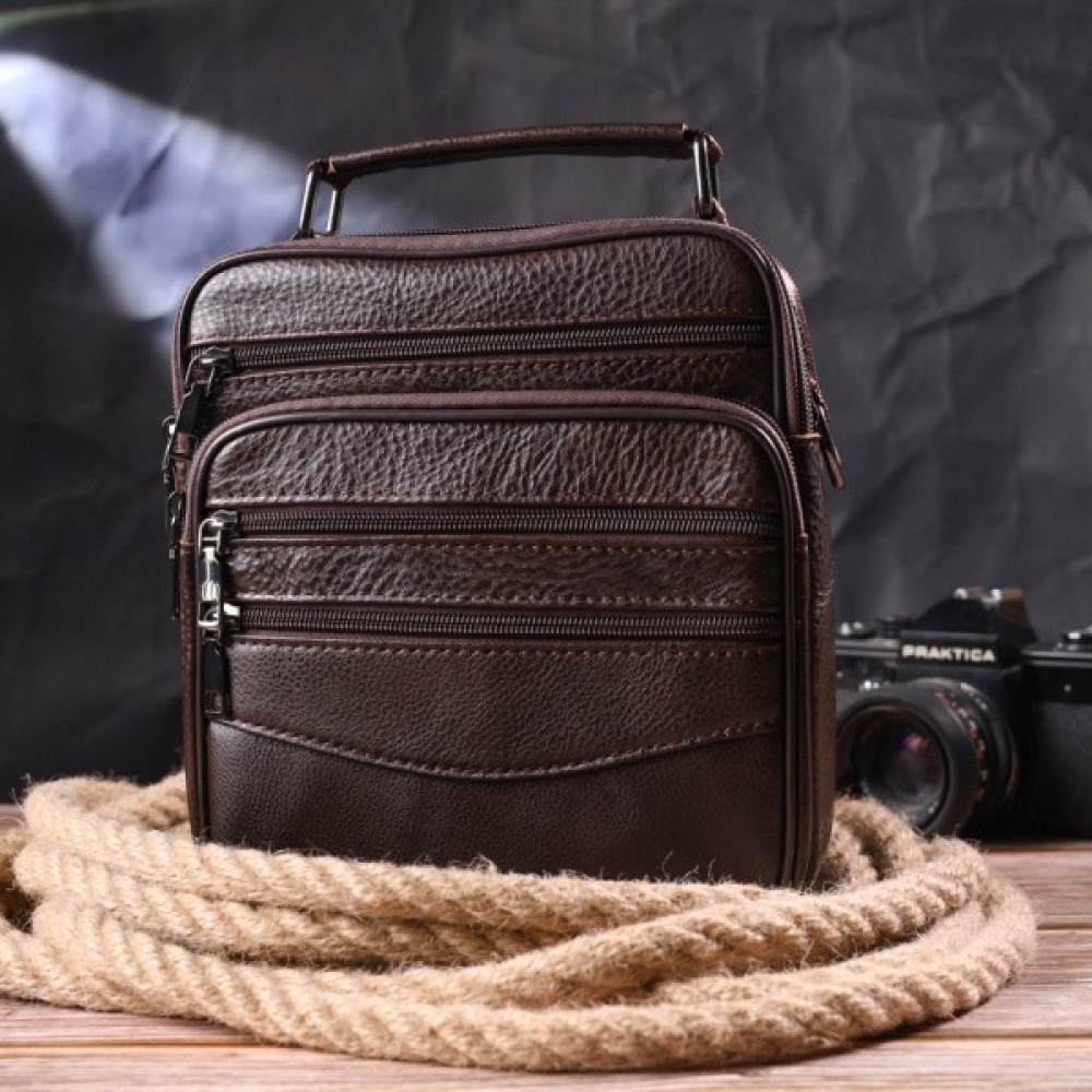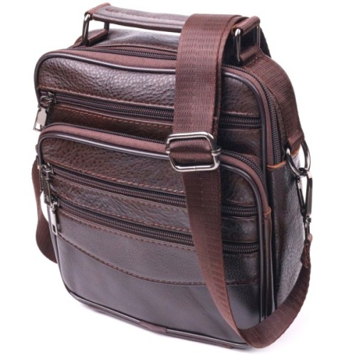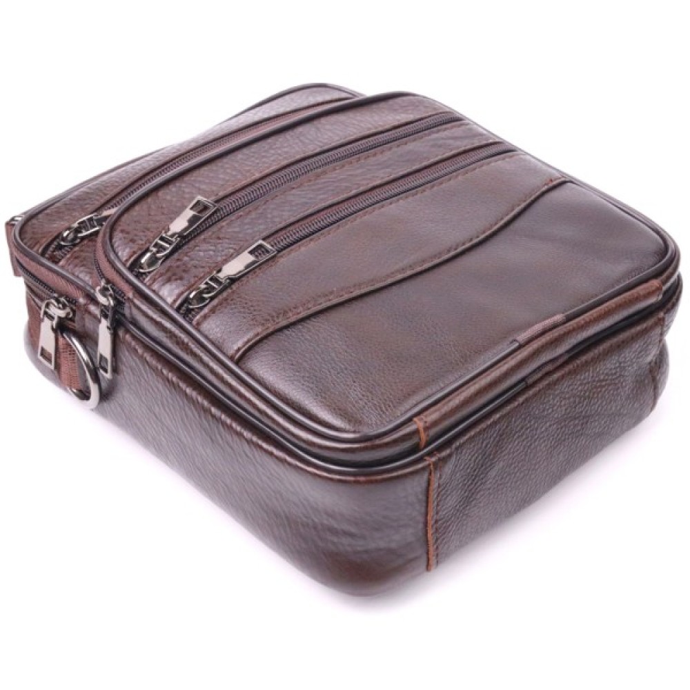 Зручна чоловіча сумка середнього розміру із натуральної шкіри. Відмінна модель, яка ідеально підійде на кожен день. У сумку з легкістю помістяться всі необхідні речі. З такою сумкою всі Ваші речі будуть в порядку, з нею також буде зручно ходити на роботу чи зустрічі. Доповнено виріб якісною фурнітурою темно-срібного кольору. Сумка стане чудовим подарунком для близької людини.