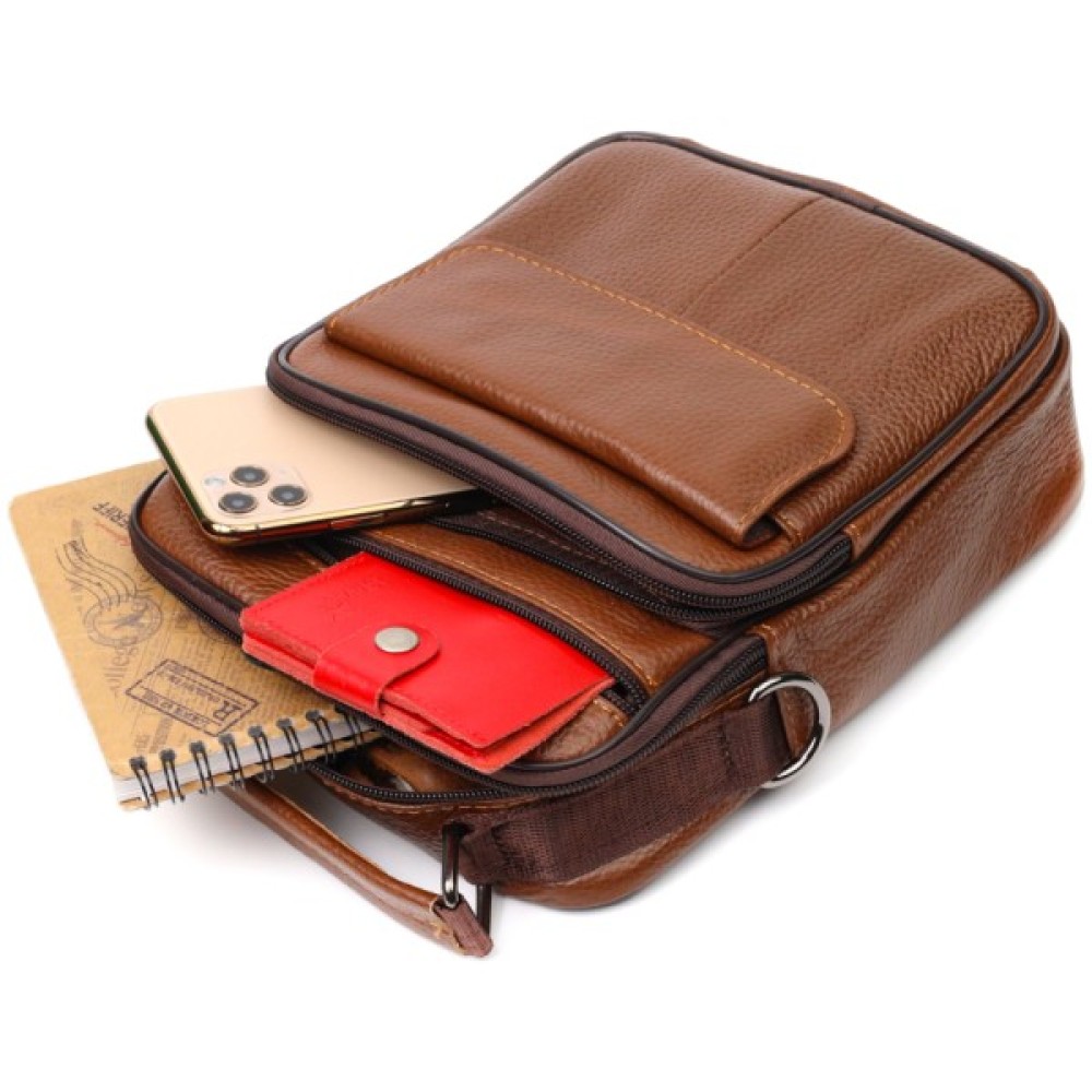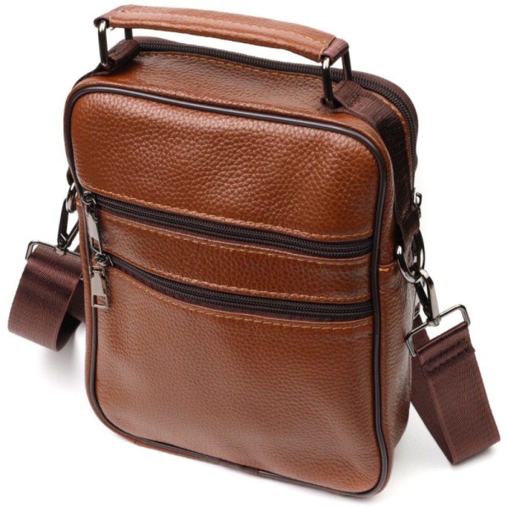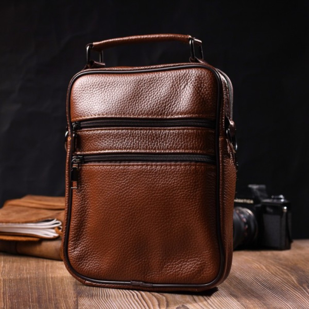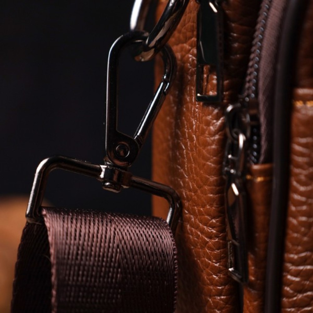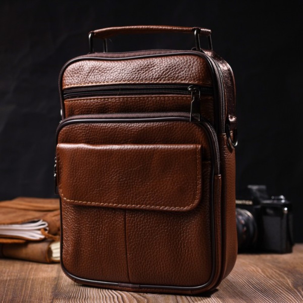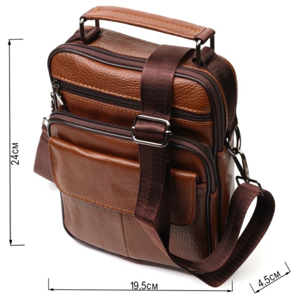 Надійна чоловіча сумка з натуральної шкіри. Аксесуар складається з основного відділення на блискавці, потайної кишені всередині, накладної кишені на блискавці, на лицьовій стороні, вбудованої кишені на блискавці на лицьовій стороні, вбудованої кишені під клапаном на магнітах, на лицьовій стороні та двох горизонтальних кишень на блискавках ззаду. Носити сумку можна на плечі, через плече, а також у руках за ручку. Ідеальний варіант як для ділового, так і для міського стилю.