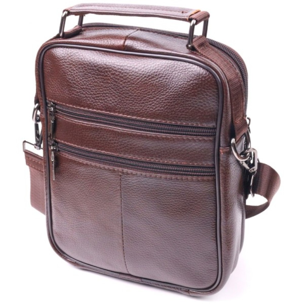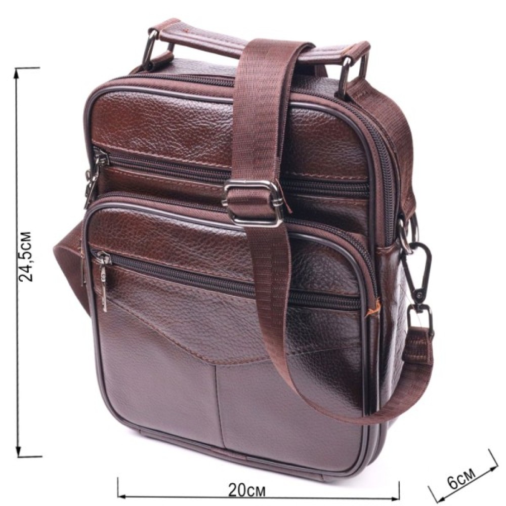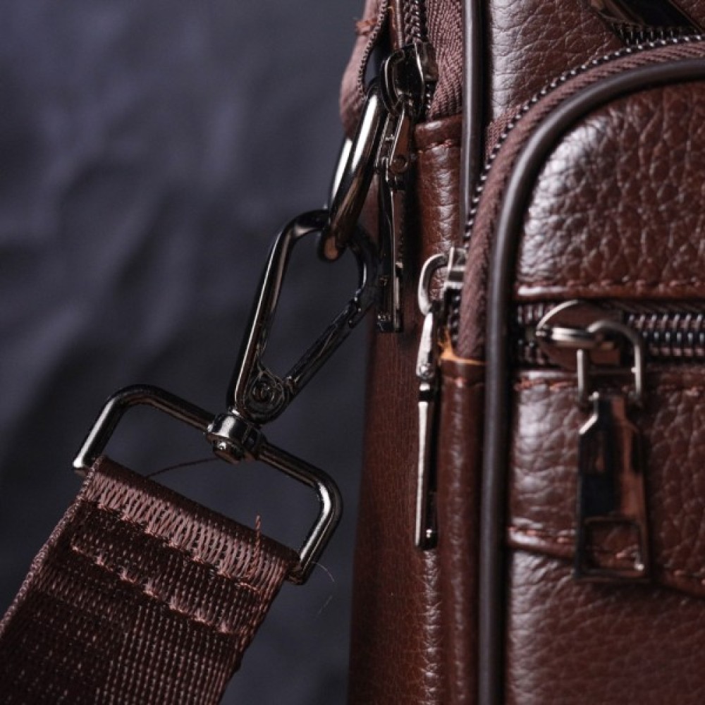 Практична чоловіча сумка середнього розміру із натуральної шкіри. Модель, яка ідеально підійде на кожен день. В аксесуарі одне основне відділення та шість кишень різних розмірів. Сумку можна носити як у руці, так і на плечі.