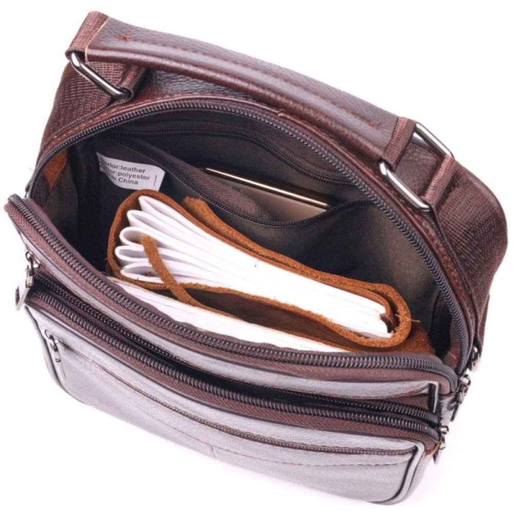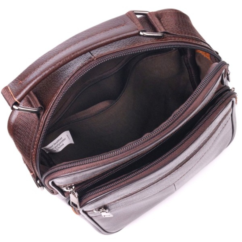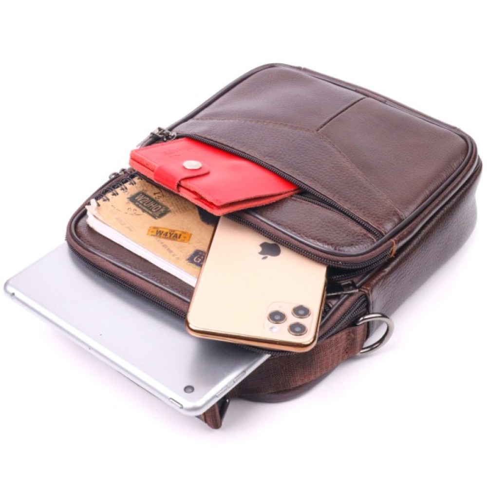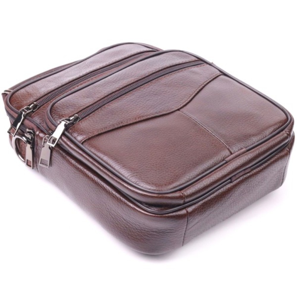 Практична чоловіча сумка середнього розміру із натуральної шкіри. Модель, яка ідеально підійде на кожен день. В аксесуарі одне основне відділення та шість кишень різних розмірів. Сумку можна носити як у руці, так і на плечі.