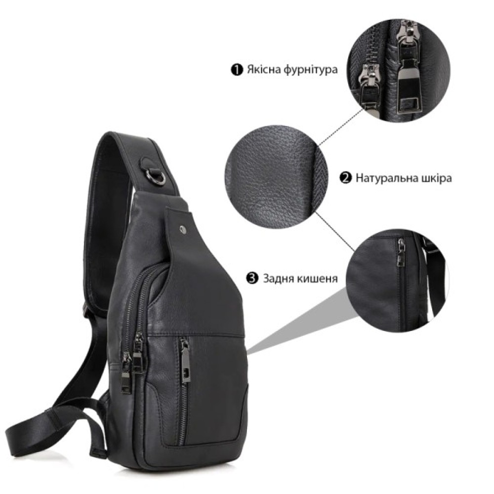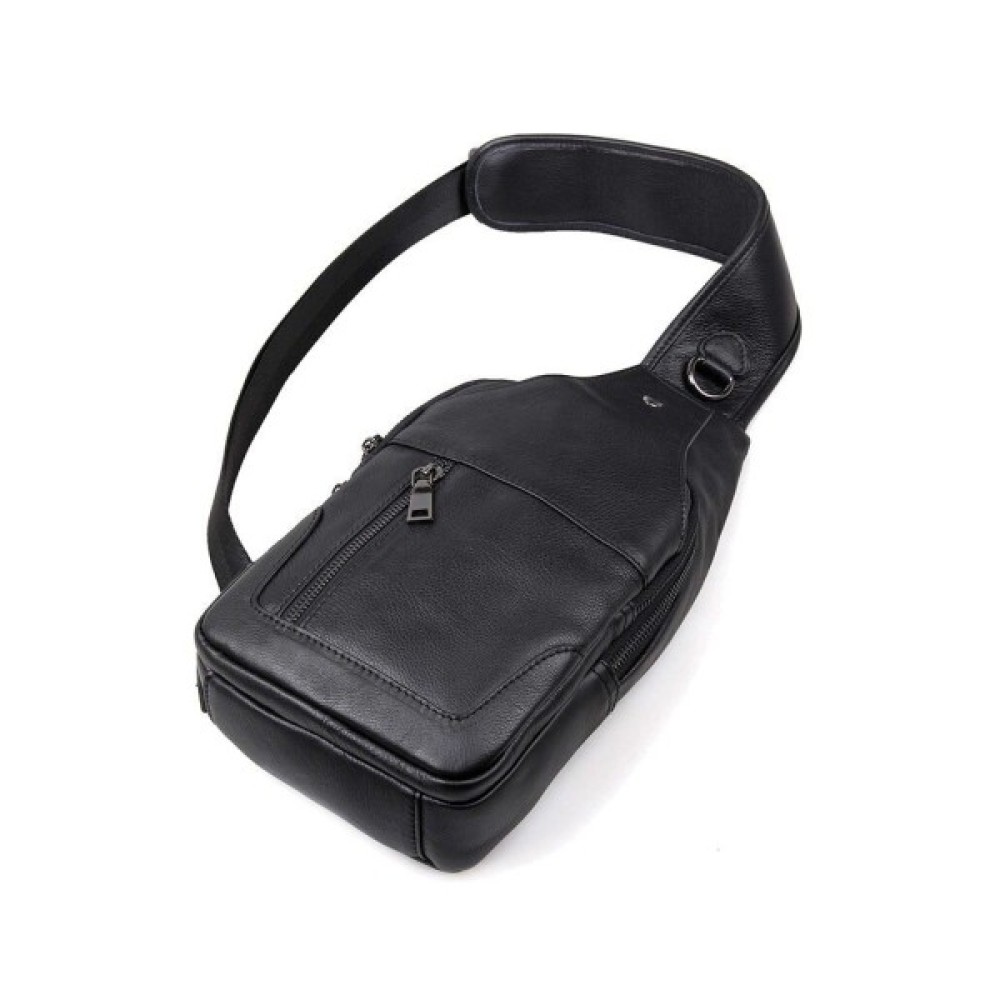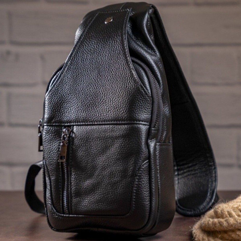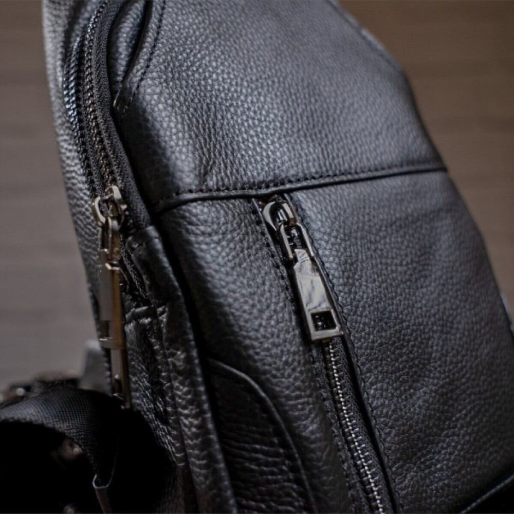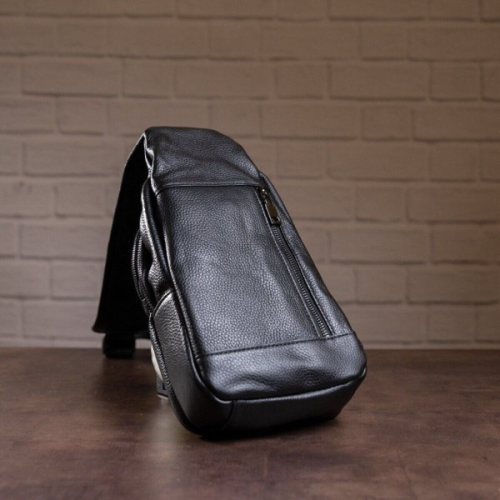 Зручна шкіряна сумка чорного кольору, яку можна носити як чоловікам, так і жінкам.