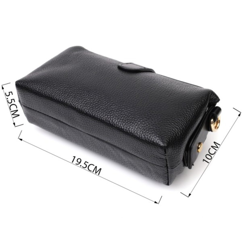 Виріб пошитий з якісної натуральної шкіри, яка довго носиться і не втрачає свого первісного вигляду. Аксесуар складається з одного основного відділення всередині якого розташована кишеня відкритого типу та кишеня на блискавці. Носити сумку можна в руці як клатч, на плечі і через плече, для цього є шкіряний ремінь, що знімається. У виробі використано якісну фурнітуру кольору жовтого золота.