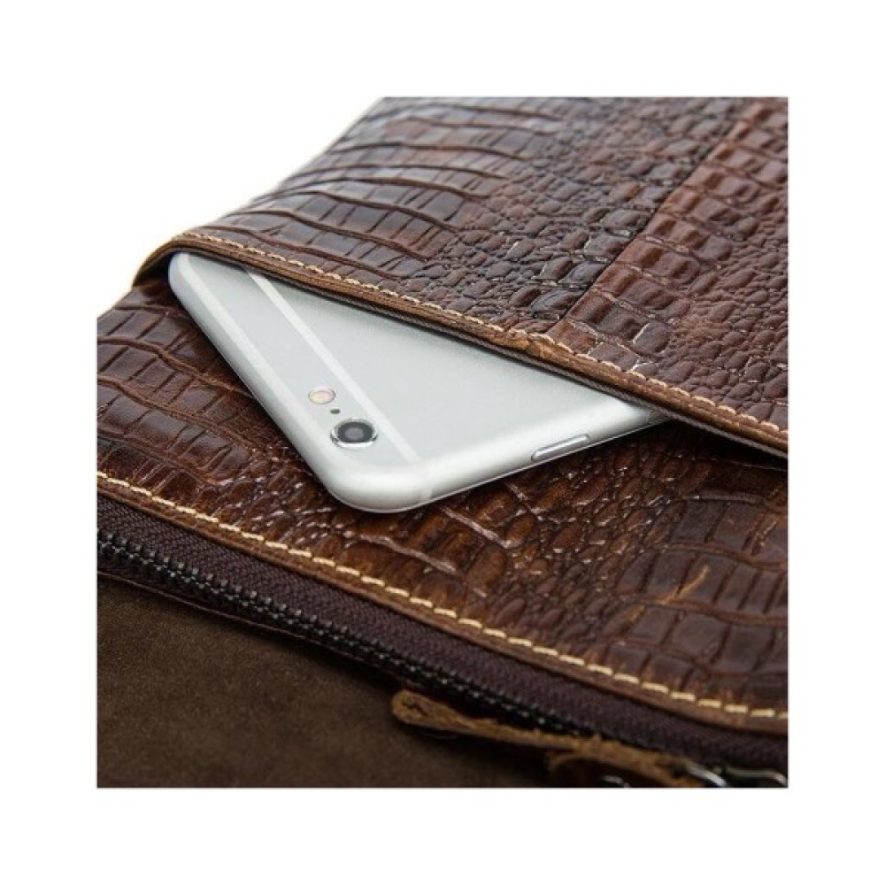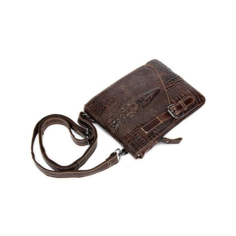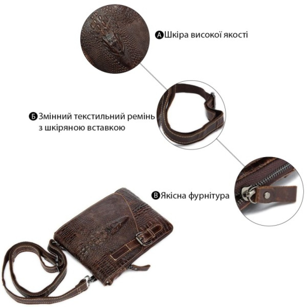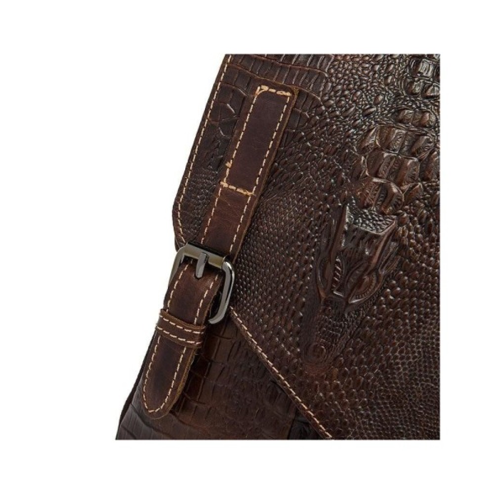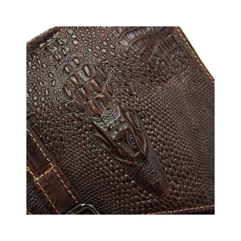 Всередині - коричнева текстильна підкладка. Ідеально доповнює аксесуар якісна металева фурнітура кольору темного срібла. На лицьовій стороні аксесуара силует з тиснення голови крокодила. По краях месенджер прошитий світлою ниткою.