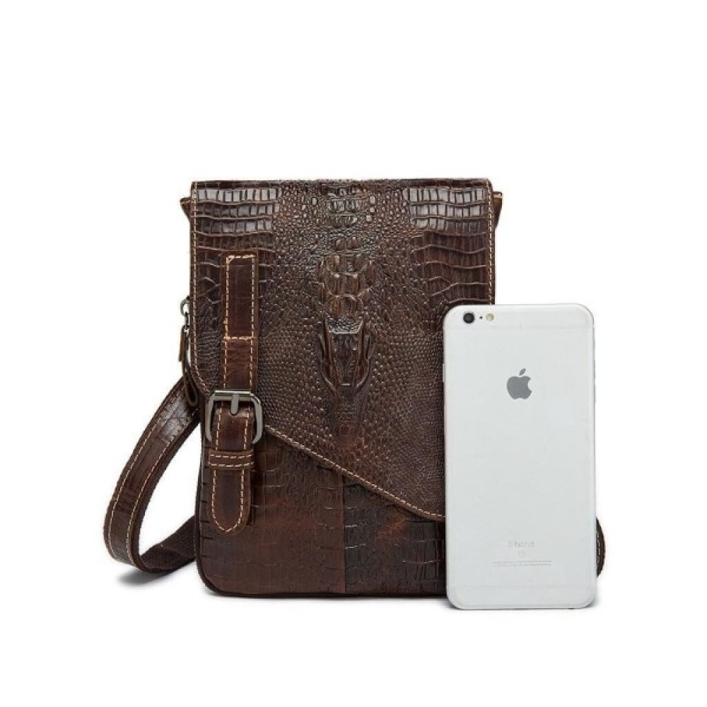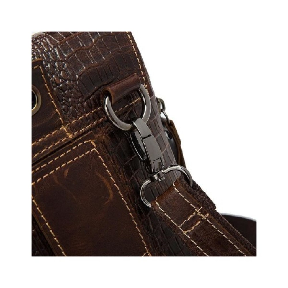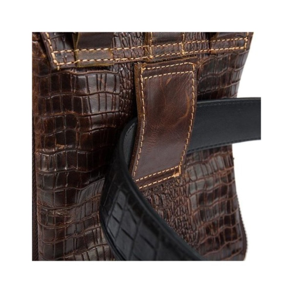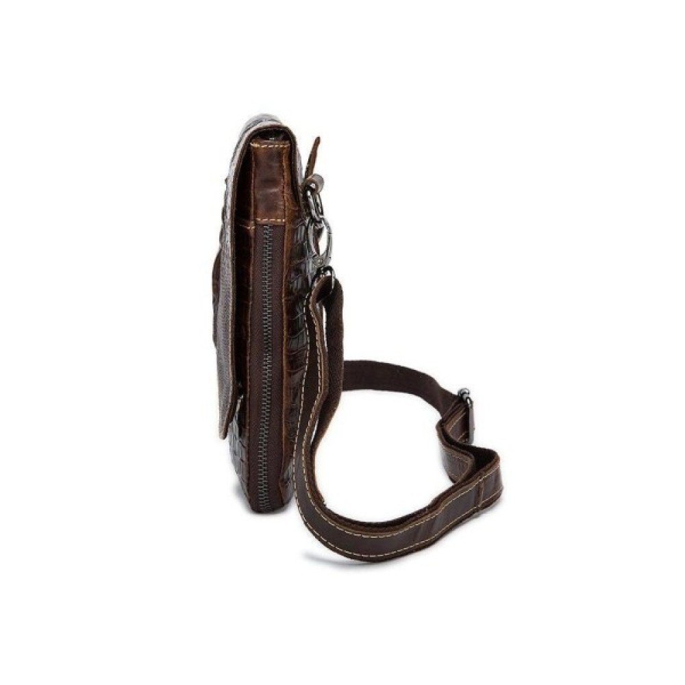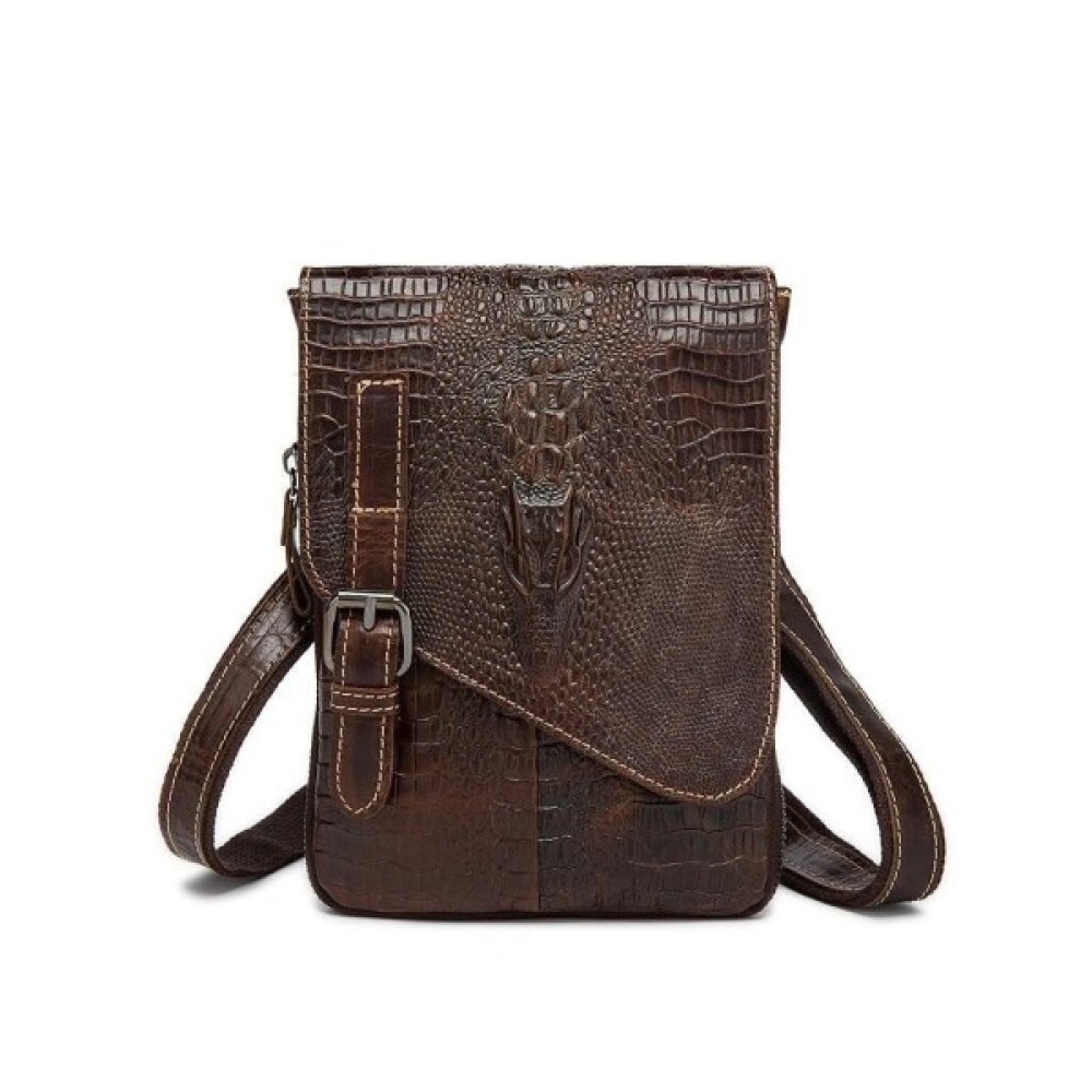 Всередині - коричнева текстильна підкладка. Ідеально доповнює аксесуар якісна металева фурнітура кольору темного срібла. На лицьовій стороні аксесуара силует з тиснення голови крокодила. По краях месенджер прошитий світлою ниткою.