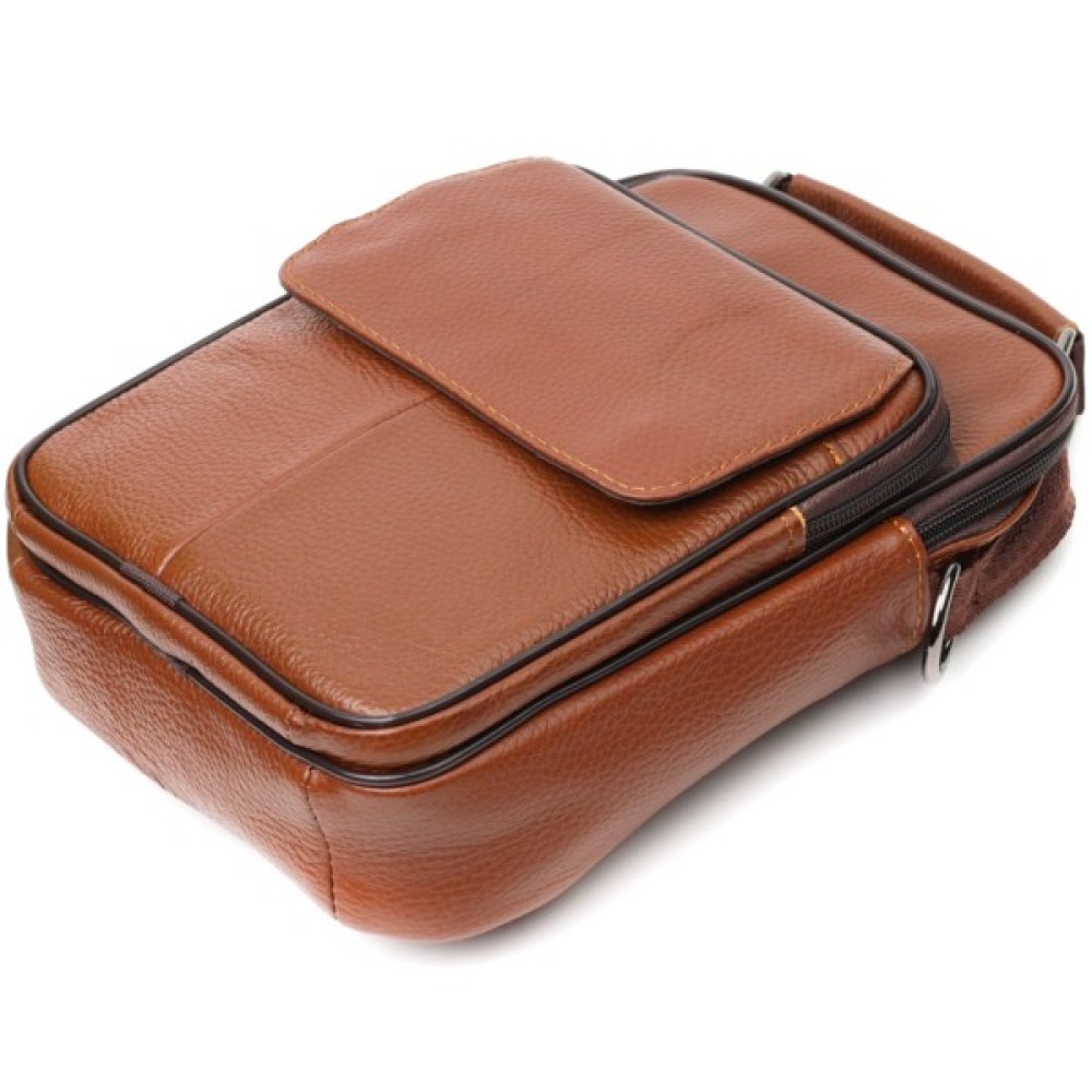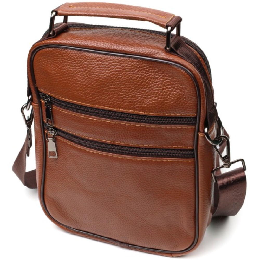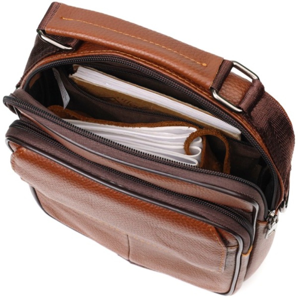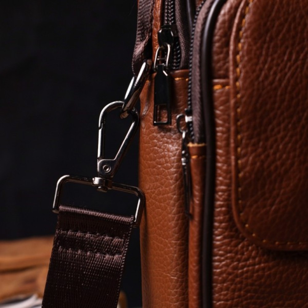 Практична сумка із натуральної шкіри. Аксесуар складається з основного відділення на блискавці, потайної кишені всередині, накладної кишені на блискавці, на лицьовій стороні, вбудованої кишені під клапаном, на магнітах, на лицьовій стороні та двох горизонтальних кишень на блискавках ззаду. Носити сумку можна на плечі, через плече, а також у руках за ручку. Ідеальний варіант як для ділового, так і для міського стилю.