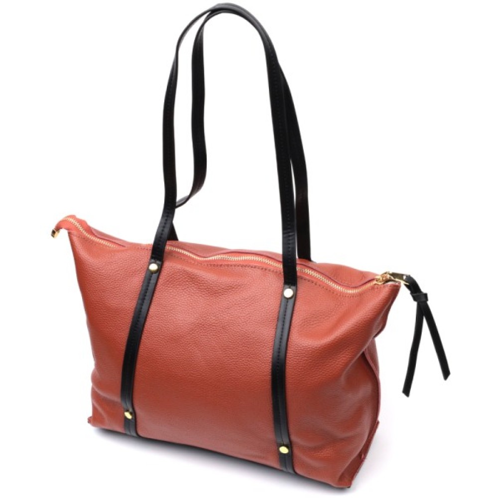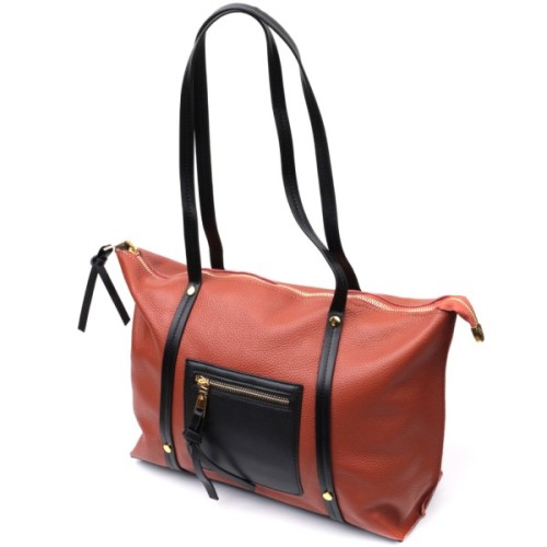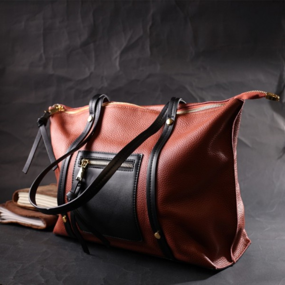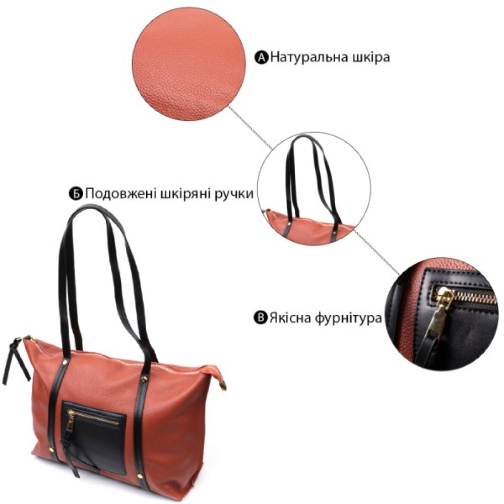 Жіноча містка сумка, у поєднанні двох кольорів — коричневого та чорного. Пошито виріб з натуральної шкіри флотар, яка невибаглива у догляді та довго носиться.