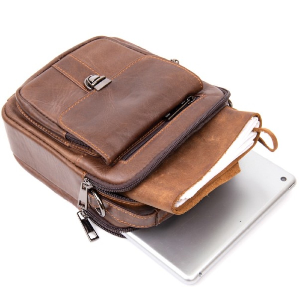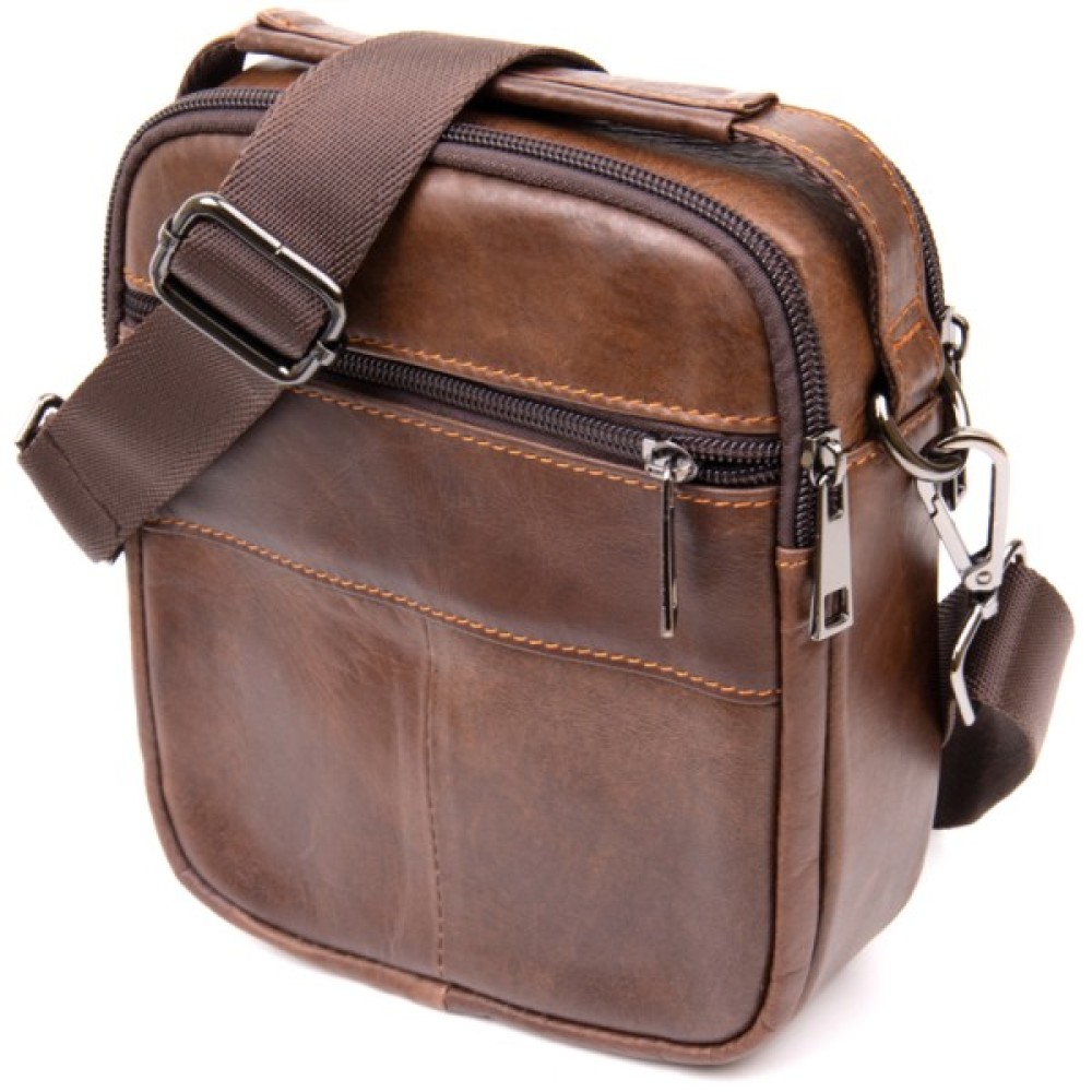 Компактна сумка в щільній шкірі гладкого типу насиченого коричневого кольору. Виріб має дуже практичний функціонал незважаючи на свій компактний розмір. В сумку можна помістити ваші особисті речі (мобільний, гаманець, документи, кредитницю, повербанк, ключі та багато іншого). Месенджер доповнений якісною фурнітурою. Виробництво - фабричний Китай високої якості. У комплекті до сумки - пилозахисний чохол. Сумка - ідеальний варіант як для себе так і на подарунок.