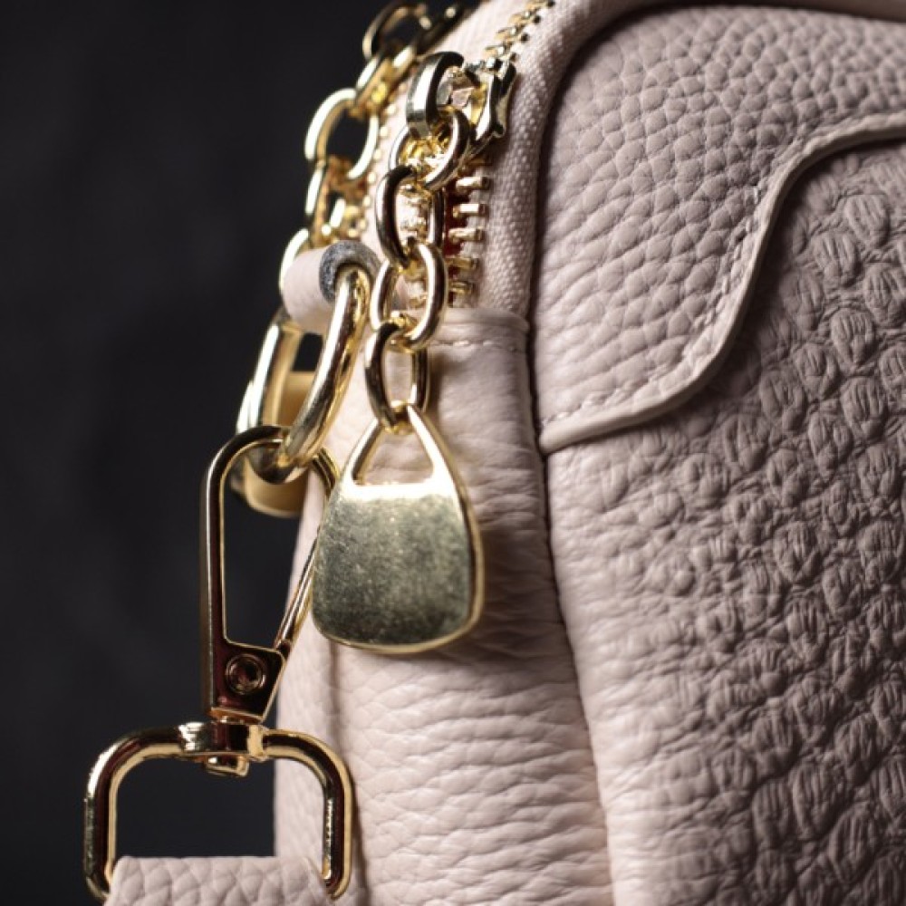 Аксесуар складається з двох основних відділень, потайної кишені на блискавці, кишені відкритого типу та кишені на блискавці зовні. Носити сумку можна в руках, на плечі і через плече, для цього є текстильний ремінь, що знімається. У виробі використано якісну фурнітуру кольору жовтого золота. Універсальний варіант сумки як на вечір так і як сумочка на кожен день.