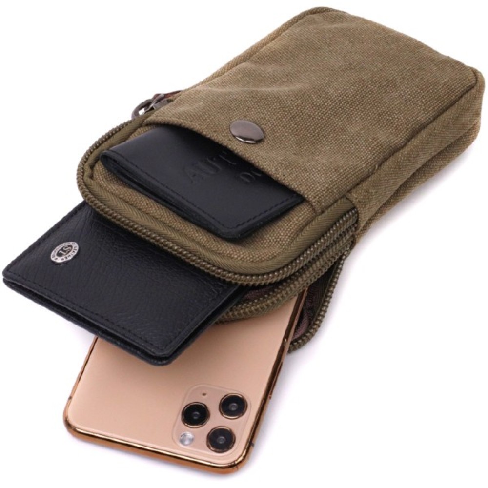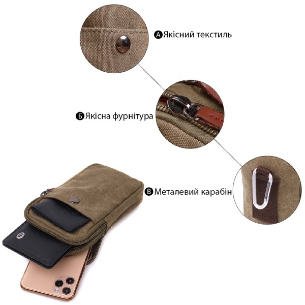 Компактна сумка-чохол на пояс пошита із міцного текстилю із застосуванням якісної фурнітури. Виріб має весь необхідний функціонал, щоб носити її щодня і щоб усі необхідні речі завжди були під рукою. Сумку можна повісити на лямки ременя за допомогою карабіну, а також протягнути в петельку пояс. Маленька текстильна сумка - ідеальний варіант як на літо, так і на зиму. Сумочка буде ідеальним подарунком для ваших близьких.