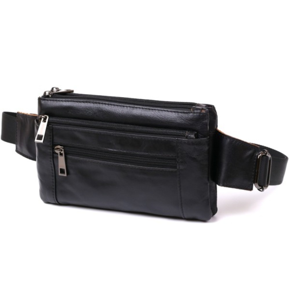 Невелика, але практична сумка на пояс із якісної шкіри з відмінними характеристиками експлуатації. Виконано виріб в універсальному чорному кольорі та має гладку фактуру. Вас порадують просторі відділення та зручні кишені. Ремінь виконаний із міцного текстилю та регулюється по довжині. Така сумка просто незамінна для всіх цінителів лаконічних та негроміздких виробів.