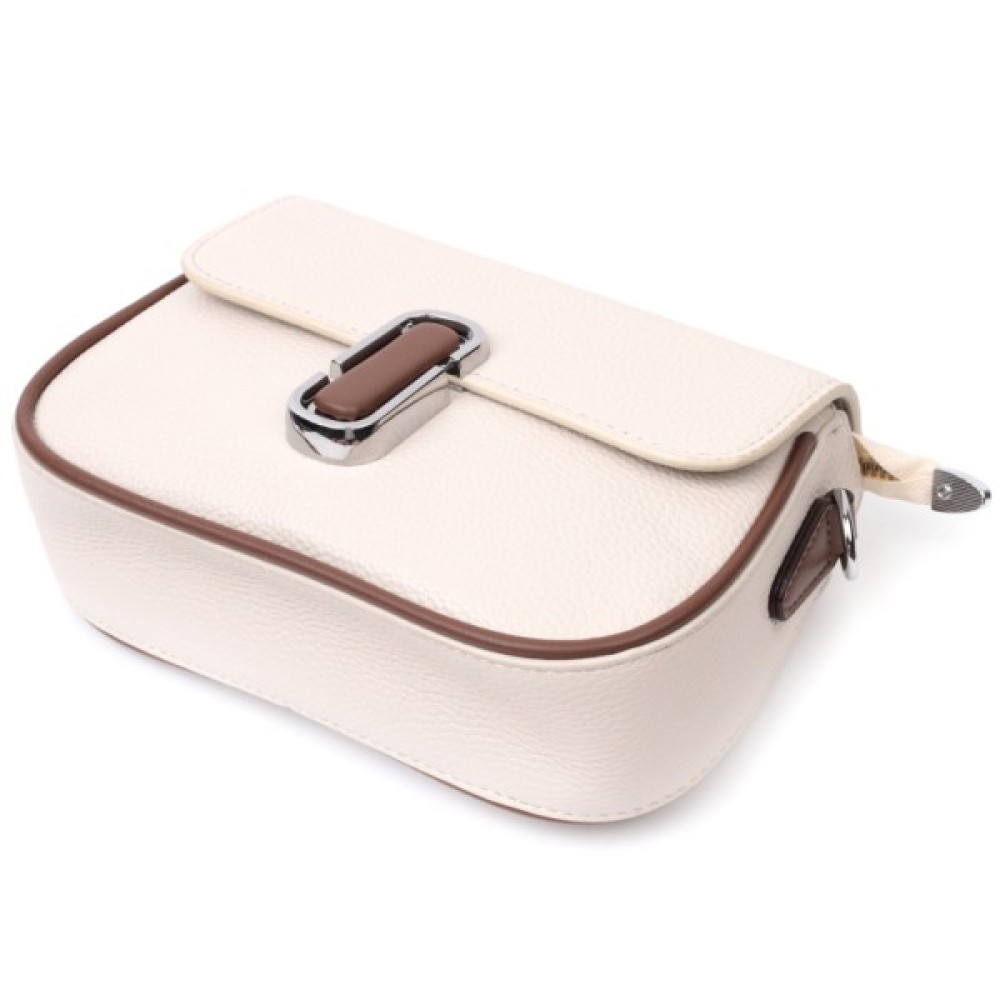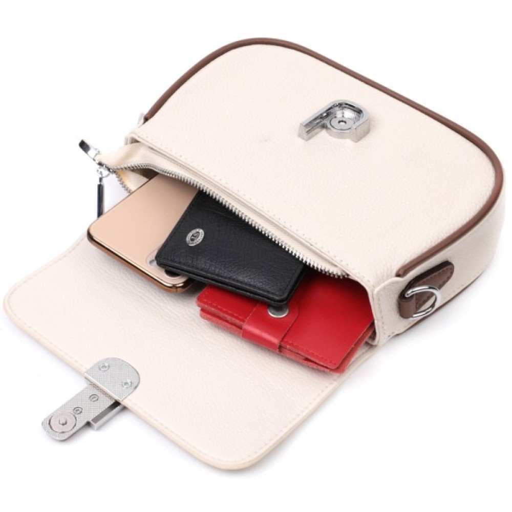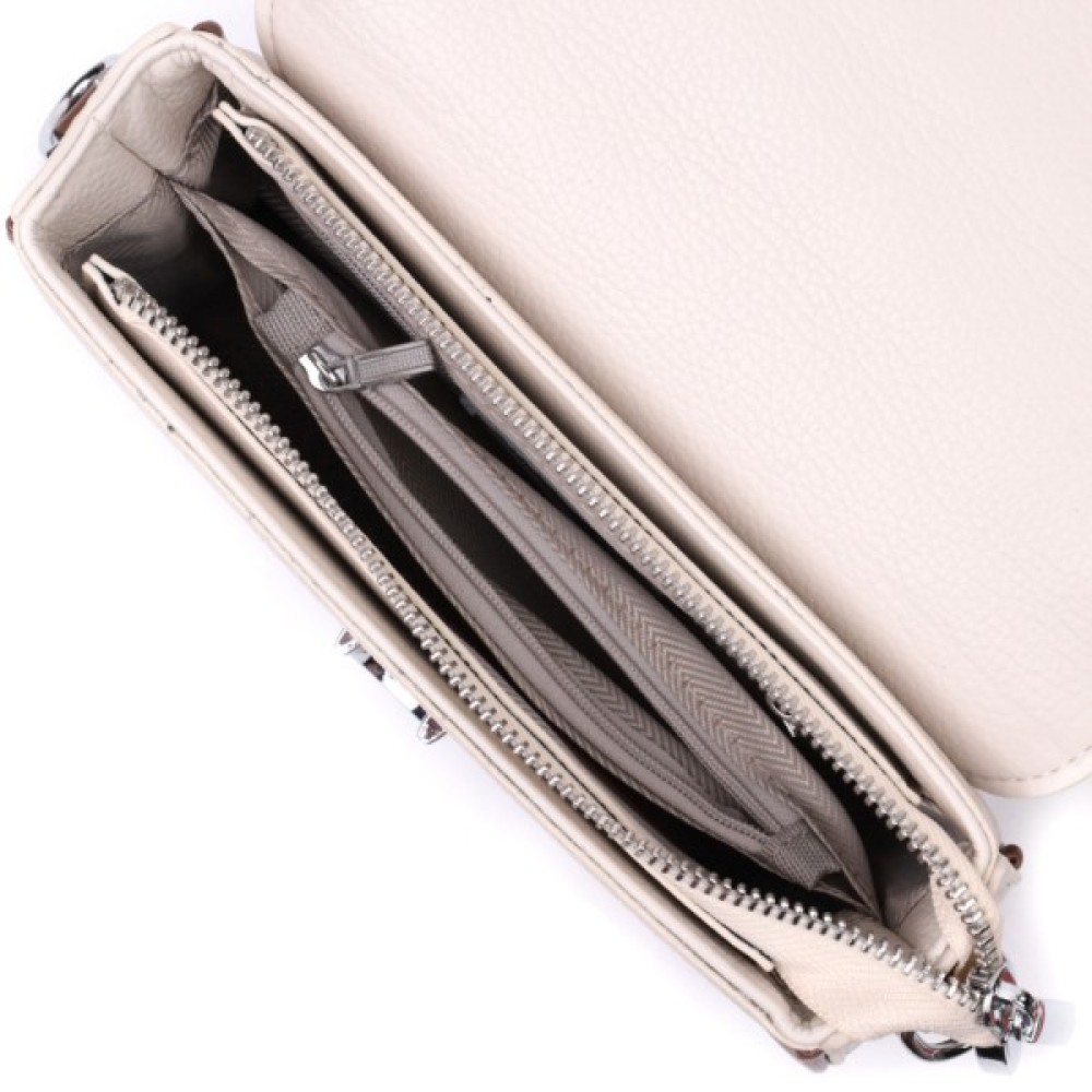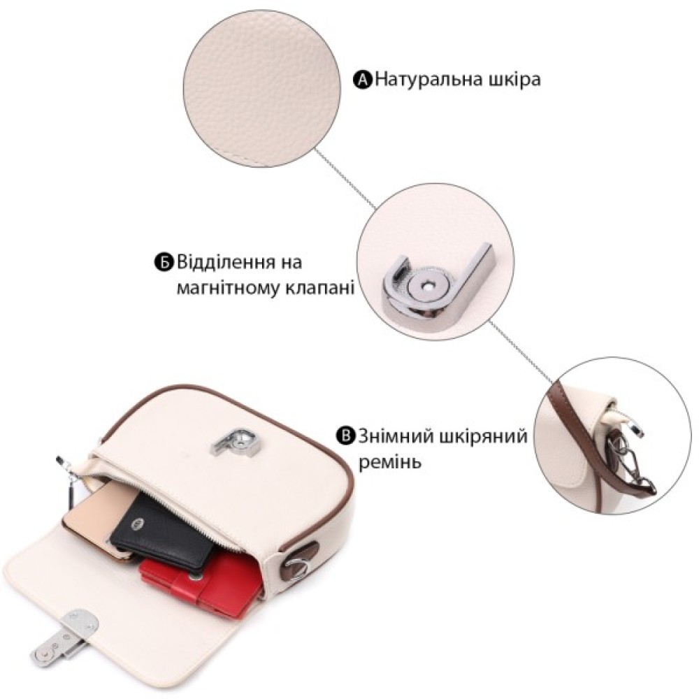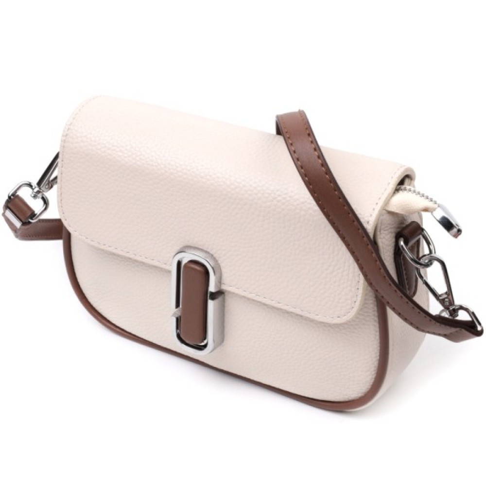 Неперевершена жіноча сумка з якісної натуральної шкіри, яка довго носиться і не втрачає свого первісного вигляду. Аксесуар складається з одного основного відділення всередині якого потайна кишеня на блискавці, кишеня відкритого типу та кишеня-перегородка, а зовні, на тильній стороні розташована кишеня на блискавці. Носити сумку можна в руці, на плечі і через плече, для цього є шкіряний ремінь, що знімається. У виробі використано якісну фурнітуру срібного кольору. Універсальний варіант сумки як на вечір так і як сумочка на кожен день.