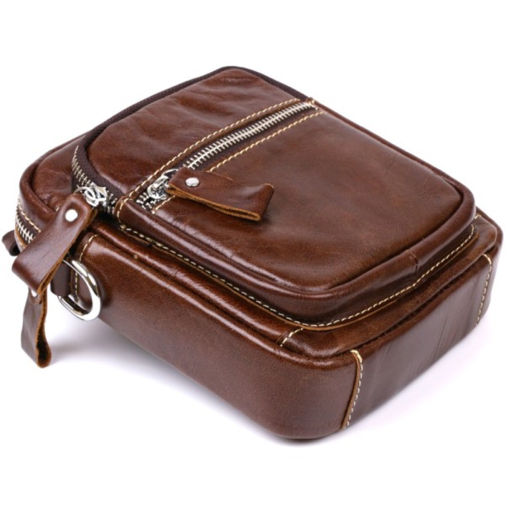 Невелика чоловіча сумка із гладкої натуральної шкіри високої якості. Має містке основне відділення зі стандартною кишенею для телефону та маленькою кишенею на блискавці, також на зовнішній стороні є додаткові кишені. Ремінь виконаний із високоміцного текстилю та регулюється по довжині. Дану модель можна носити на поясі, для цього передбачено спеціальне кріплення.