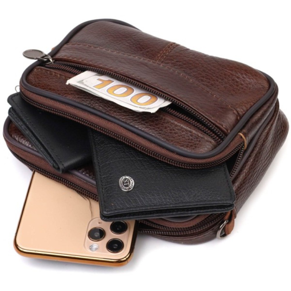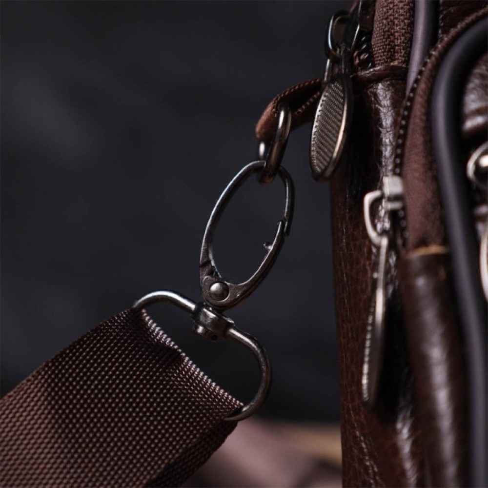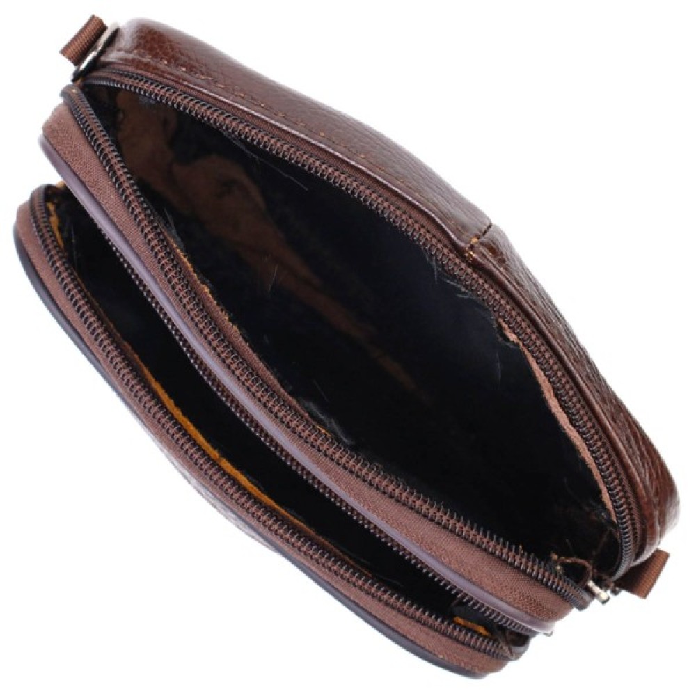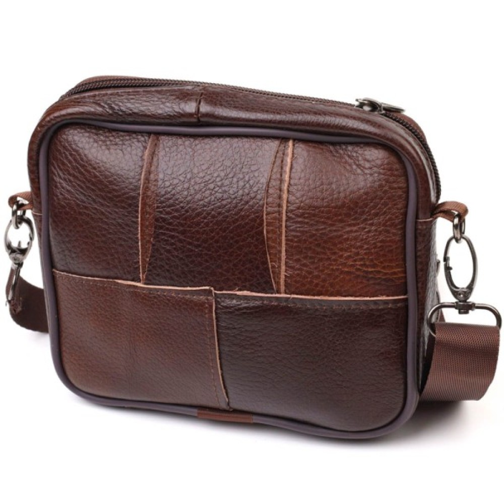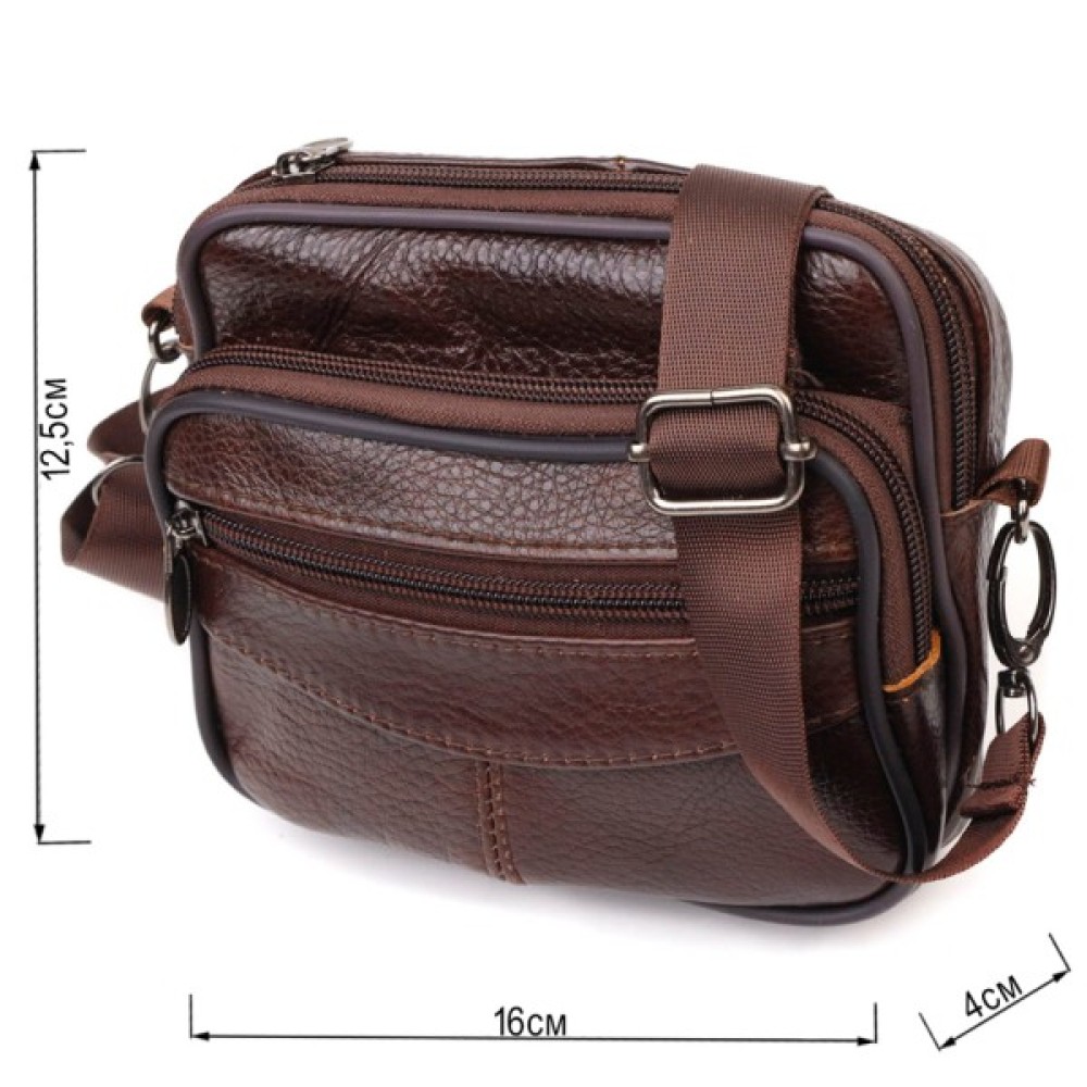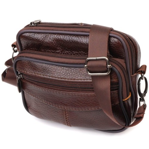 Зручна горизонтальна чоловіча сумка на пояс невеликого розміру з натуральної шкіри. Аксесуар чудово підійде як для роботи, так і в дорогу. Сумка складається з основного відділення, що закривається на блискавку та двох кишень зовні, вони також закриваються блискавками. Носити сумку можна на поясі, є спеціальна шкіряна петелька з тильного боку, а також в комплекті йде текстильний знімний плечовий ремінець. Модель дуже практична та універсальна. Виріб стане чудовим подарунком для будь-якого чоловіка.