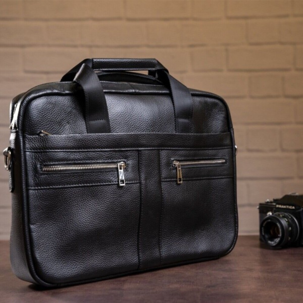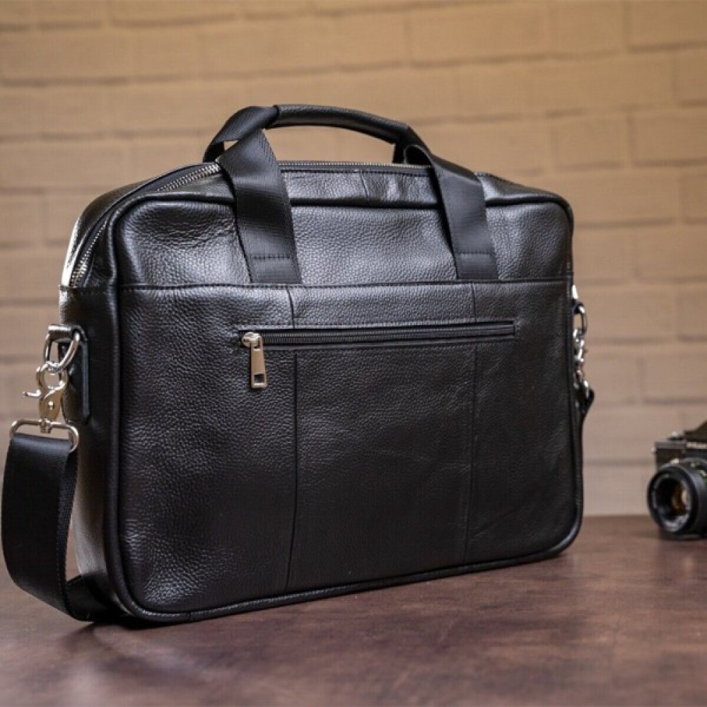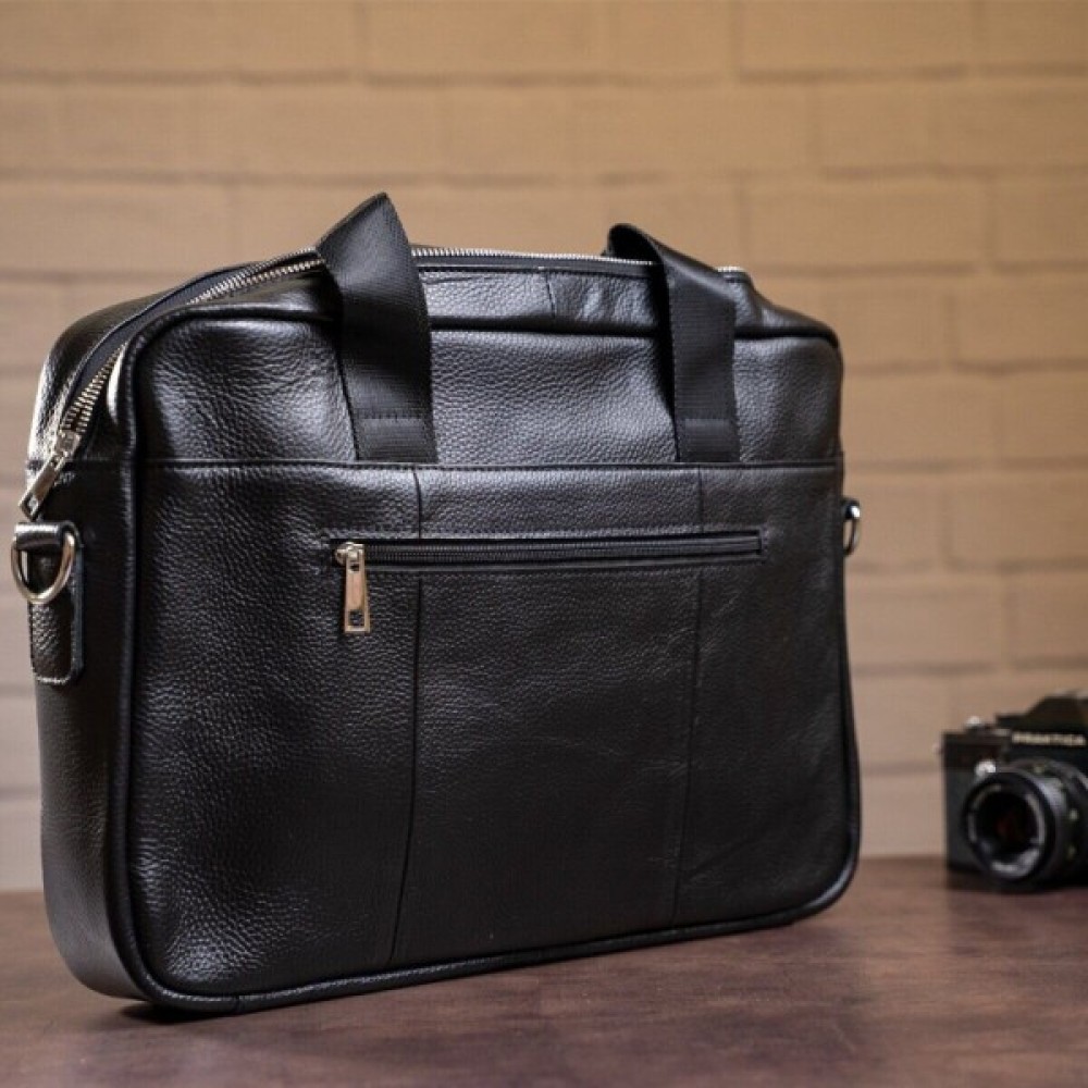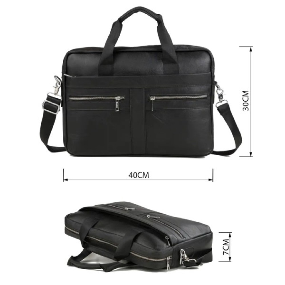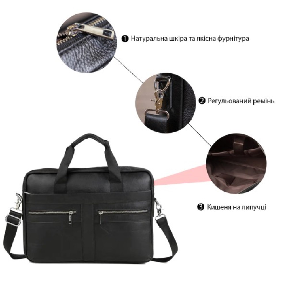 Особливості дві шкіряні ручки; дві кишені на блискавці, на лицьовій стороні; вміщує формат А4; знімний регульований плечовий ремінь; для ноутбука; відділення на блискавці на тильній стороні; відділення на блискавці на лицьовій стороні