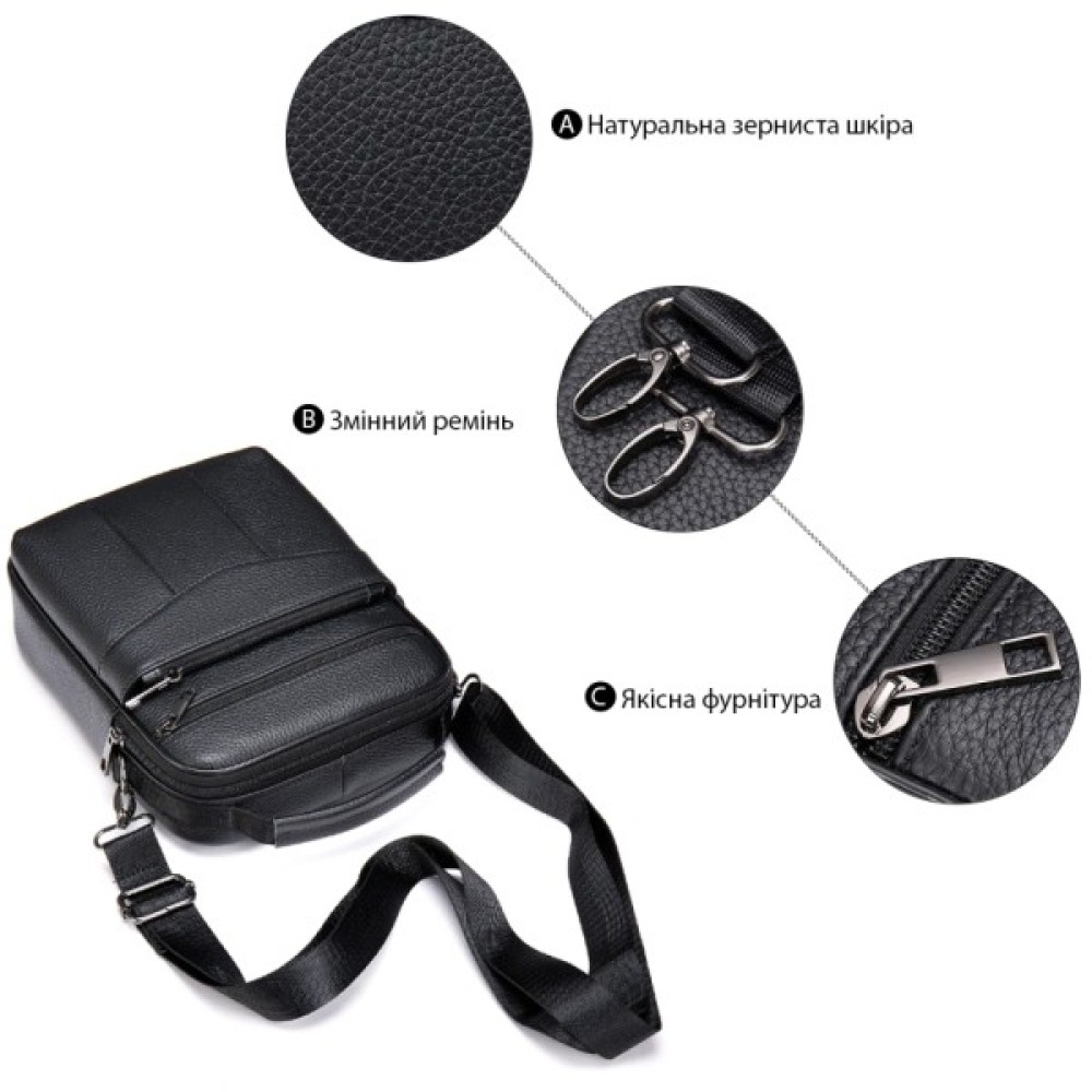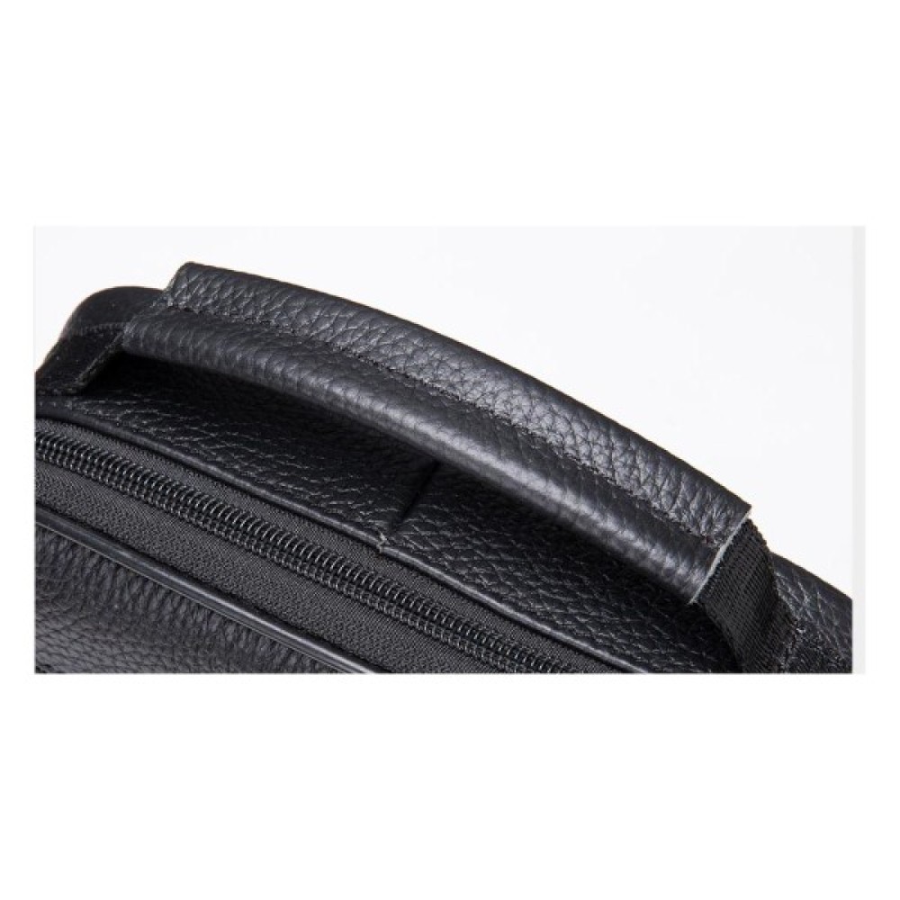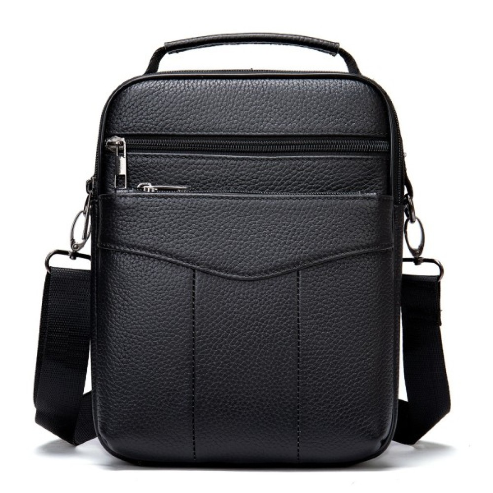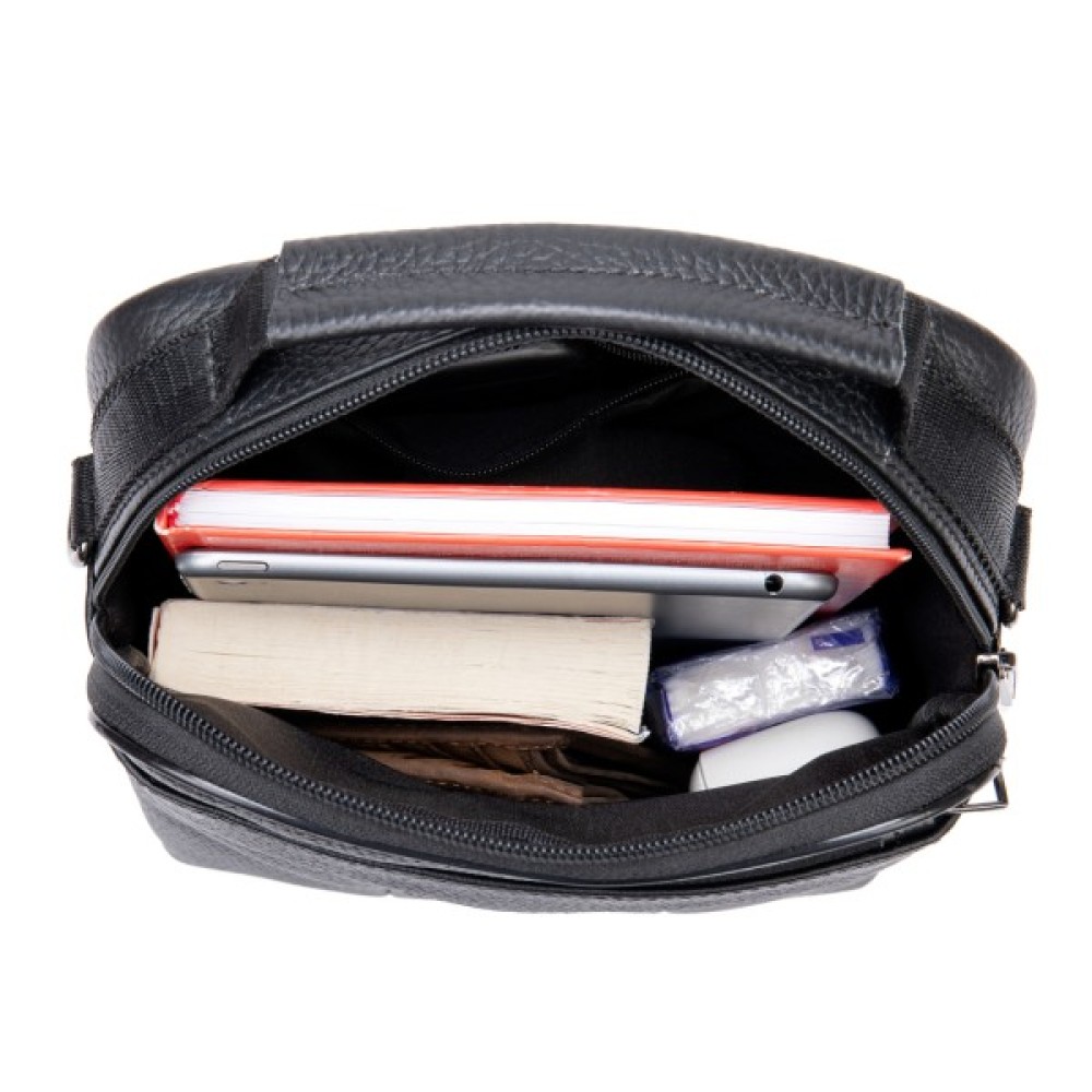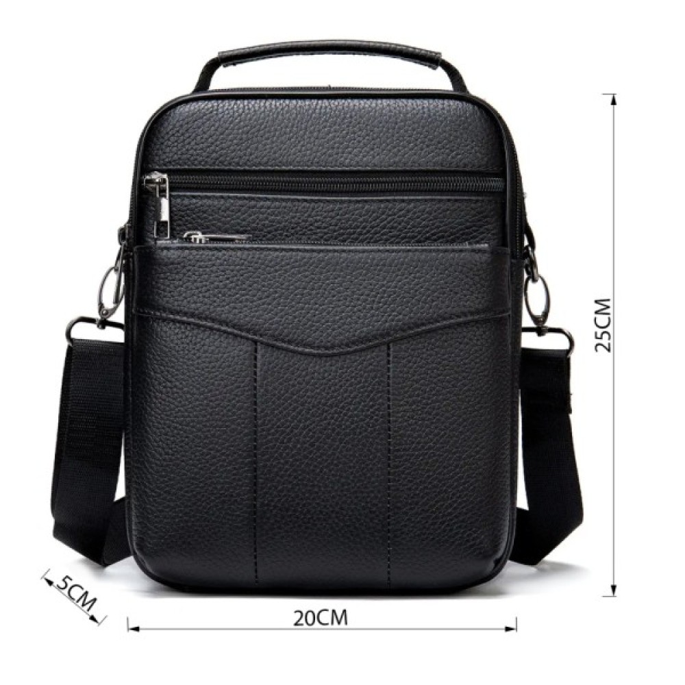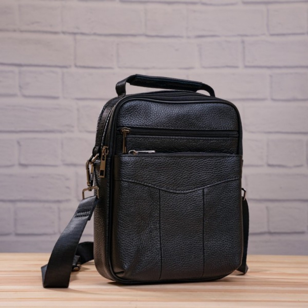 Сумка виконана в натуральній шкірі зернистого типу. Даний тип шкіри менш вибагливий у догляді. На ньому не видно подряпин і потертостей. Класичний чорний колір підійде під будь-який образ. Месенджер - ідеальний варіант сумки на кожен день. Аксесуар дуже місткий навіть незважаючи на одне відділення. Сумка доповнена безліччю кишень для вашої зручності. З її функціональністю ви зручно розмістете свої речі і буде порядок всередині вашої сумки. В сумку поміщається блокнот-щоденник діагоналлю 25 см. Розмірами 21 на 15 см. Виріб підійде як для навчання, роботи, так і для просто прогулянок. Якщо ви перебуваєте в пошуку подарунка - рекомендуємо вам дану модель. Впевнені, що прослужить вона вам далеко не один рік.
