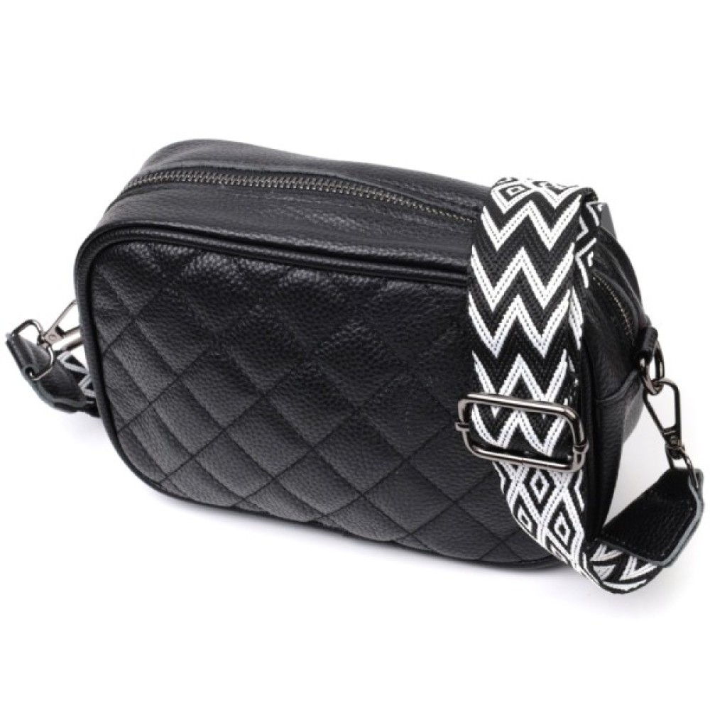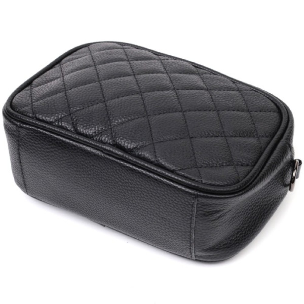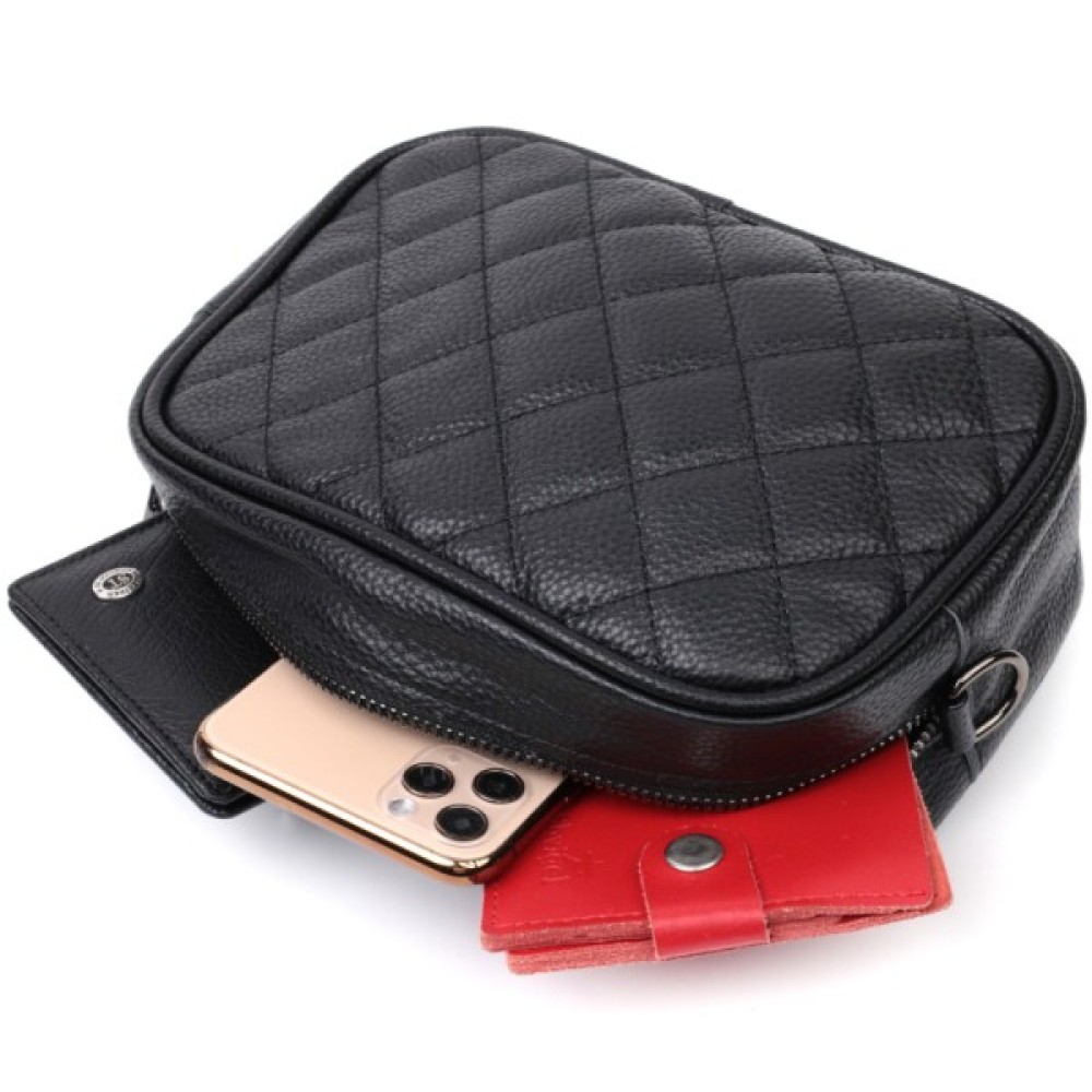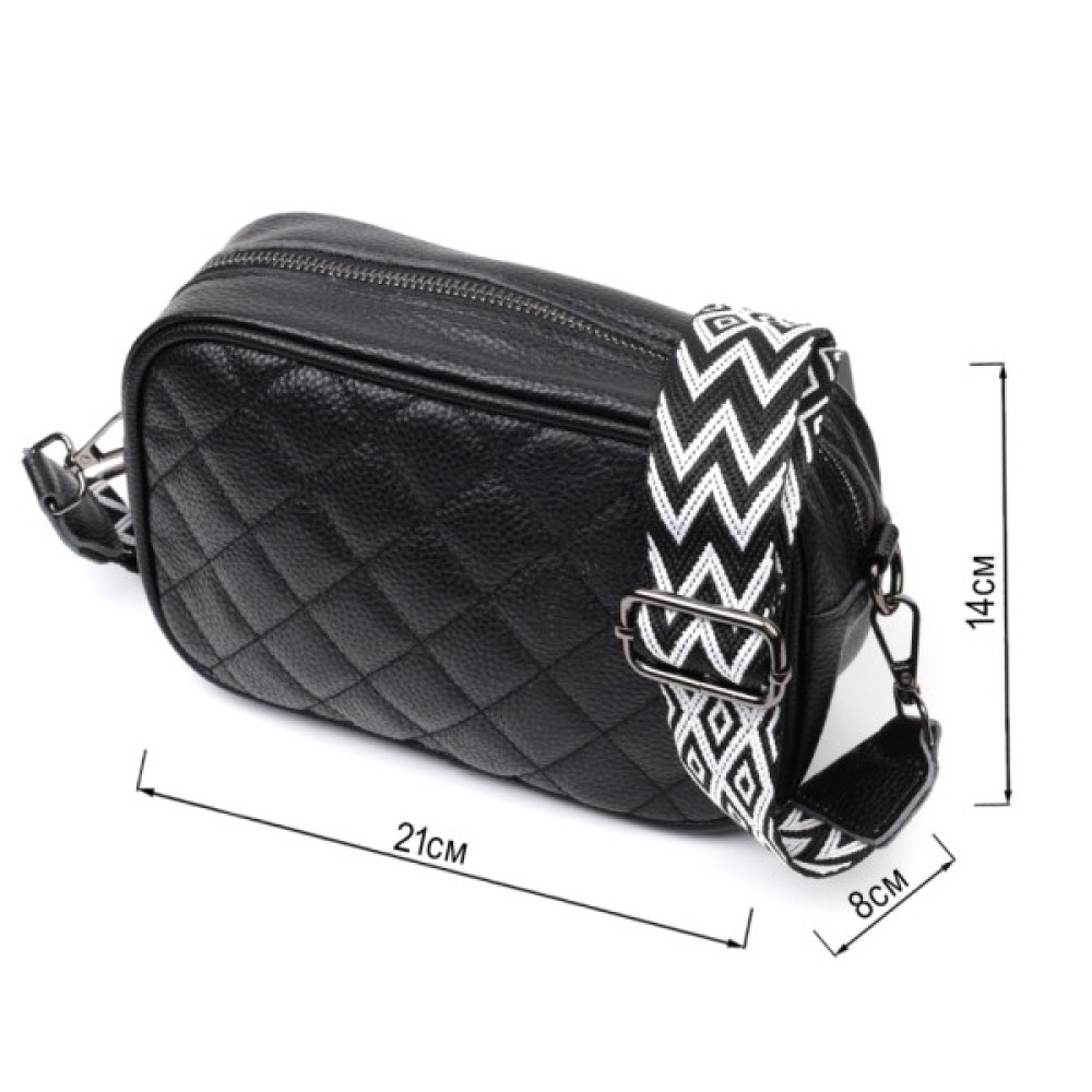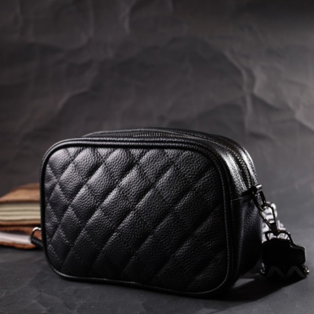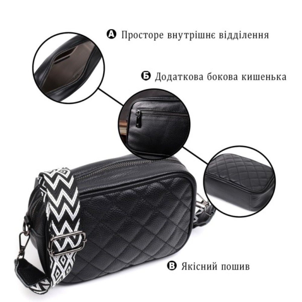 Стильна стьобана ромбами на лицьовій стороні сумка для жінок. Виріб пошитий з якісної натуральної шкіри, яка довго носиться і не втрачає свого первісного вигляду. Аксесуар складається з одного основного відділення всередині якого розташована кишеня відкритого типу і кишеня на блискавці, також зовні розташована кишеня на блискавці, на тильній стороні. Носити сумку можна в руці як клатч, на плечі та через плече, для цього є текстильний ремінь, що знімається. У виробі використано якісну фурнітуру кольору темного срібла. Універсальний варіант сумки як на вечір так і як сумочка на кожен день.