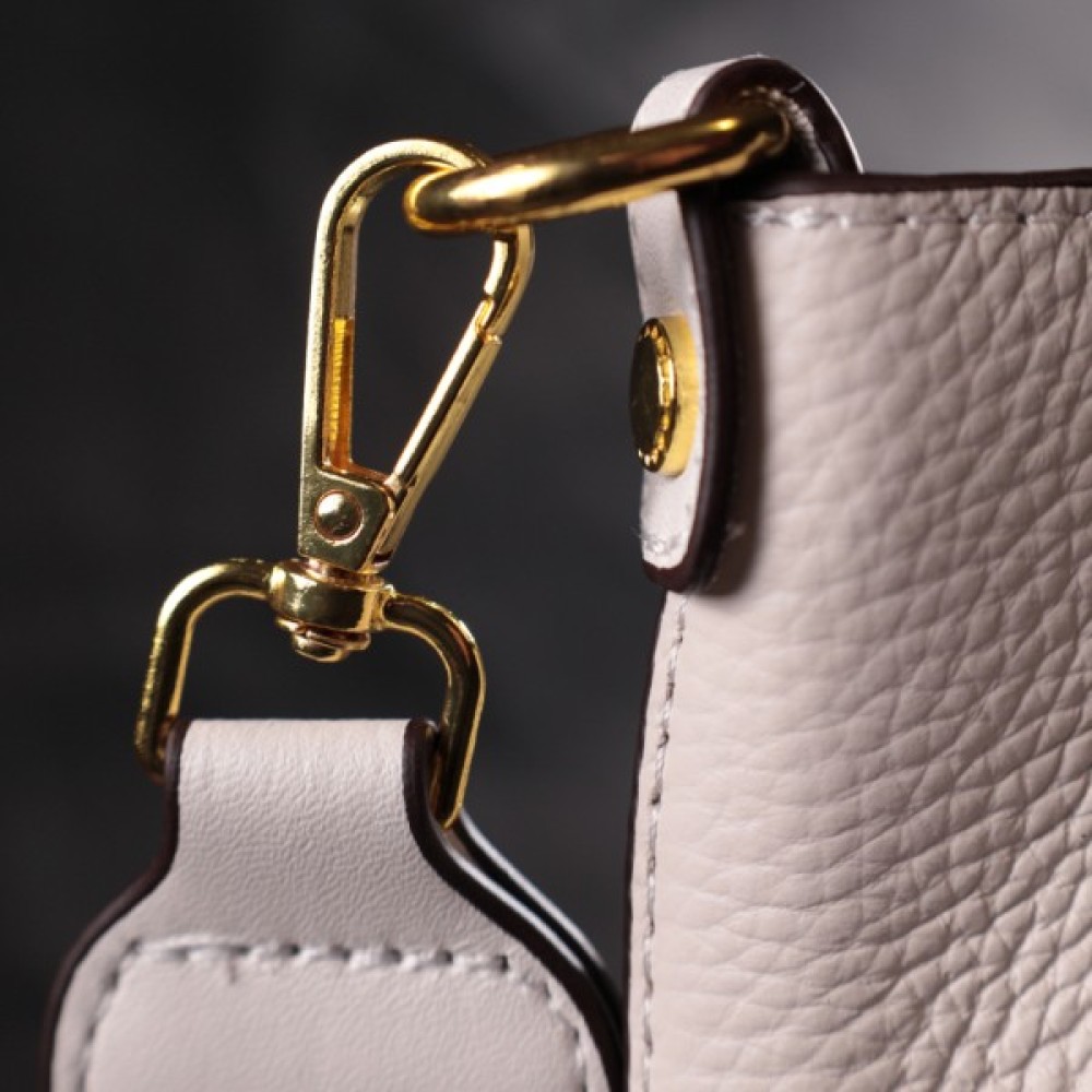 Якісна жіноча сумка без підкладки, з твердим дном і знімною тканинною косметичкою всередині - не залишить байдужою жодну жінку. Виріб пошитий з якісної натуральної шкіри, яка довго носиться і не втрачає свого первісного вигляду. Аксесуар складається з одного основного відділення, всередині якого розташована знімна тканинна косметичка. Носити сумку можна в руці, на плечі та через плече, для цього є шкіряний та текстильний ремені, що знімаються. У виробі використано якісну фурнітуру кольору жовтого золота. Універсальний варіант сумки як на вечір так і як сумочка на кожен день.