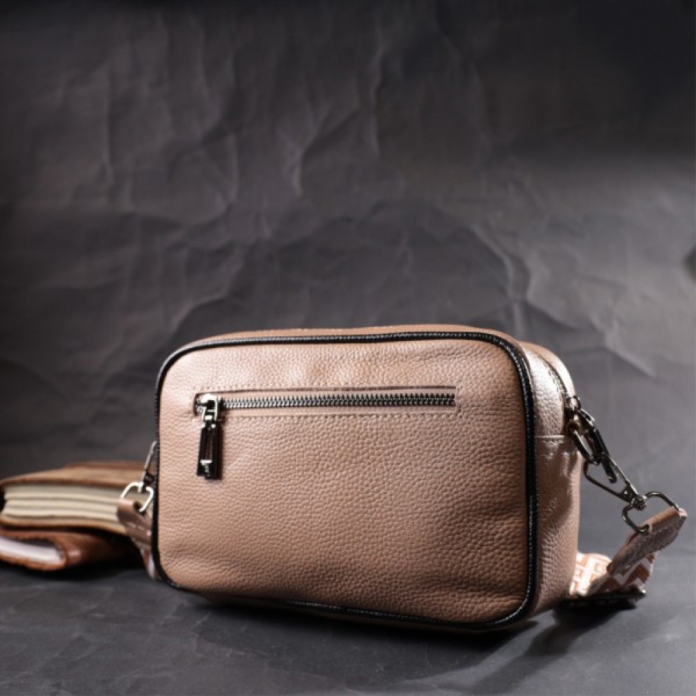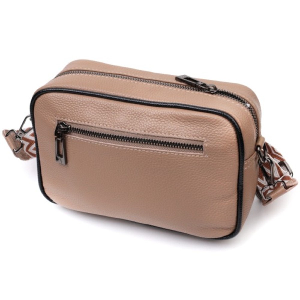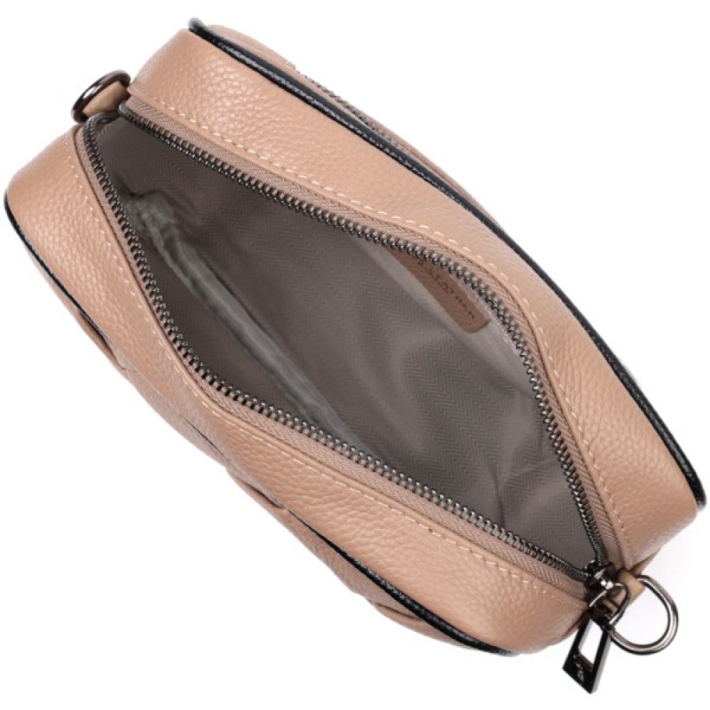 Виріб пошитий з якісної натуральної шкіри, яка довго носиться і не втрачає свого первісного вигляду. Аксесуар складається з одного основного відділення всередині якого розташована кишеня відкритого типу і кишеня на блискавці, також зовні розташована кишеня на блискавці, на тильній стороні. Носити сумку можна в руці як клатч, на плечі та через плече, для цього є текстильний ремінь, що знімається. У виробі використано якісну фурнітуру кольору темного срібла. Універсальний варіант сумки як на вечір так і як сумочка на кожен день.