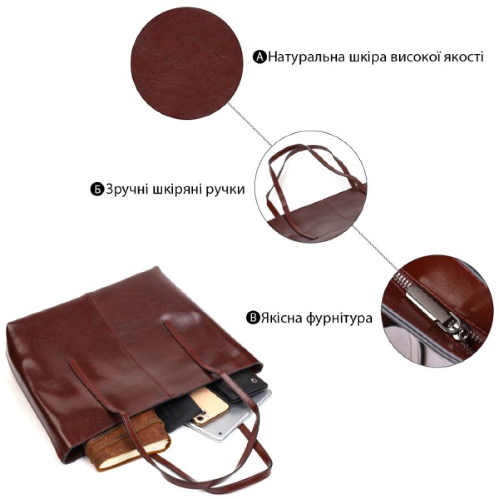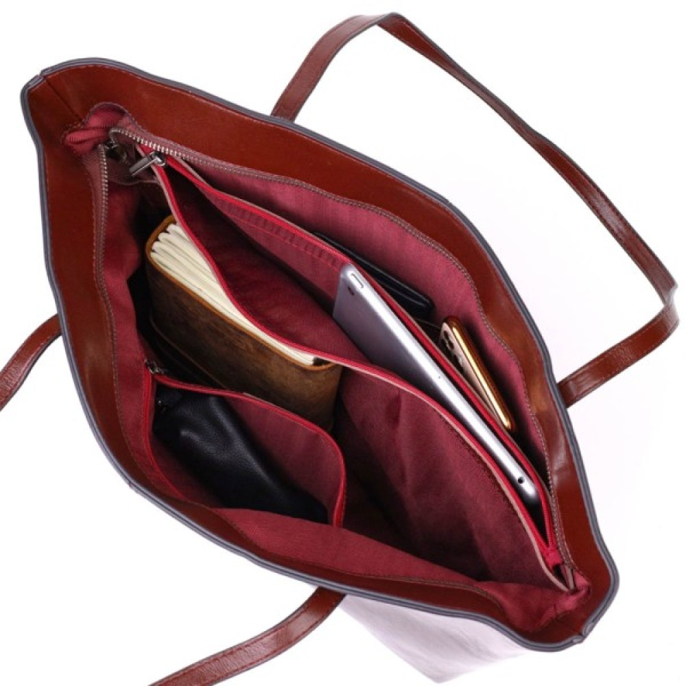 Виріб дуже зручний, можна носити на плечі та в руці. Аксесуар має одне основне відділення в якому потайна кишеня на блискавці, подвійна бічна кишеня відкритого типу та кишеня-перегородка на блискавці, на всю довжину. На дні сумки є металеві ніжки для захисту виробу від пошкоджень. Ідеальний варіант сумки для будь-якої жінки на кожен день.