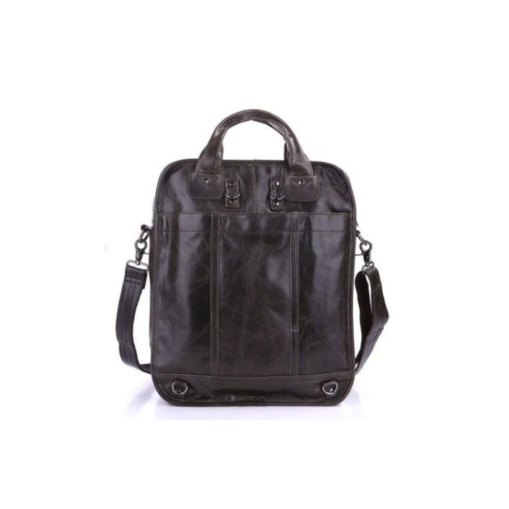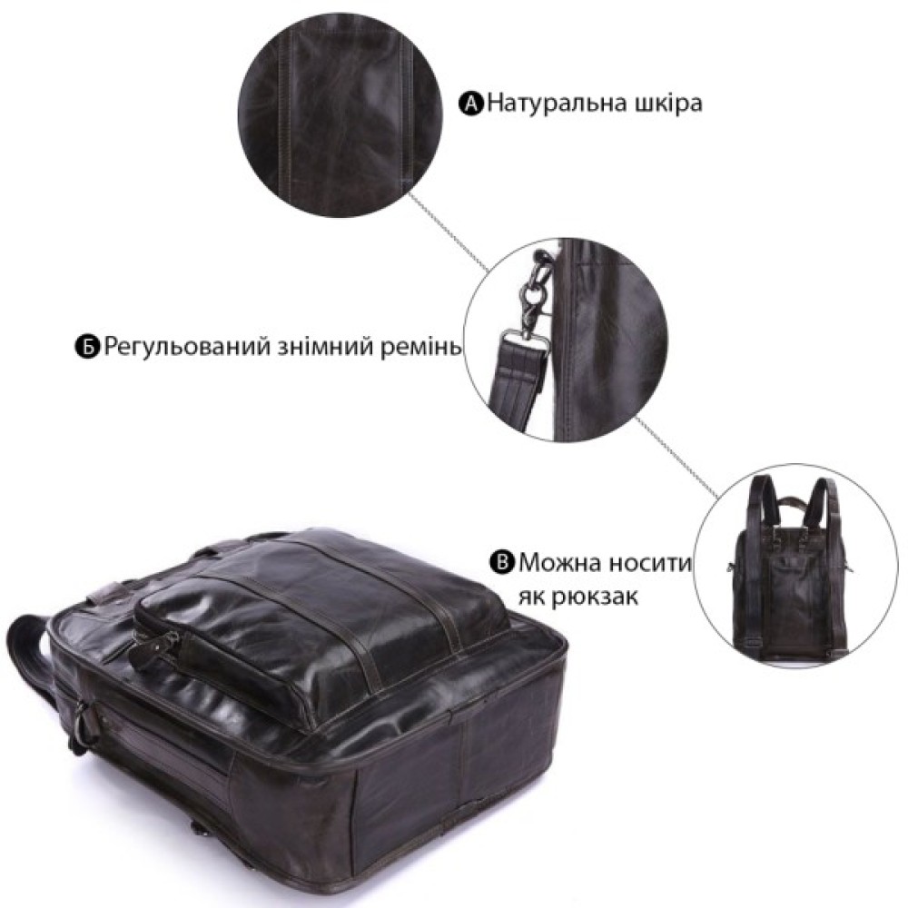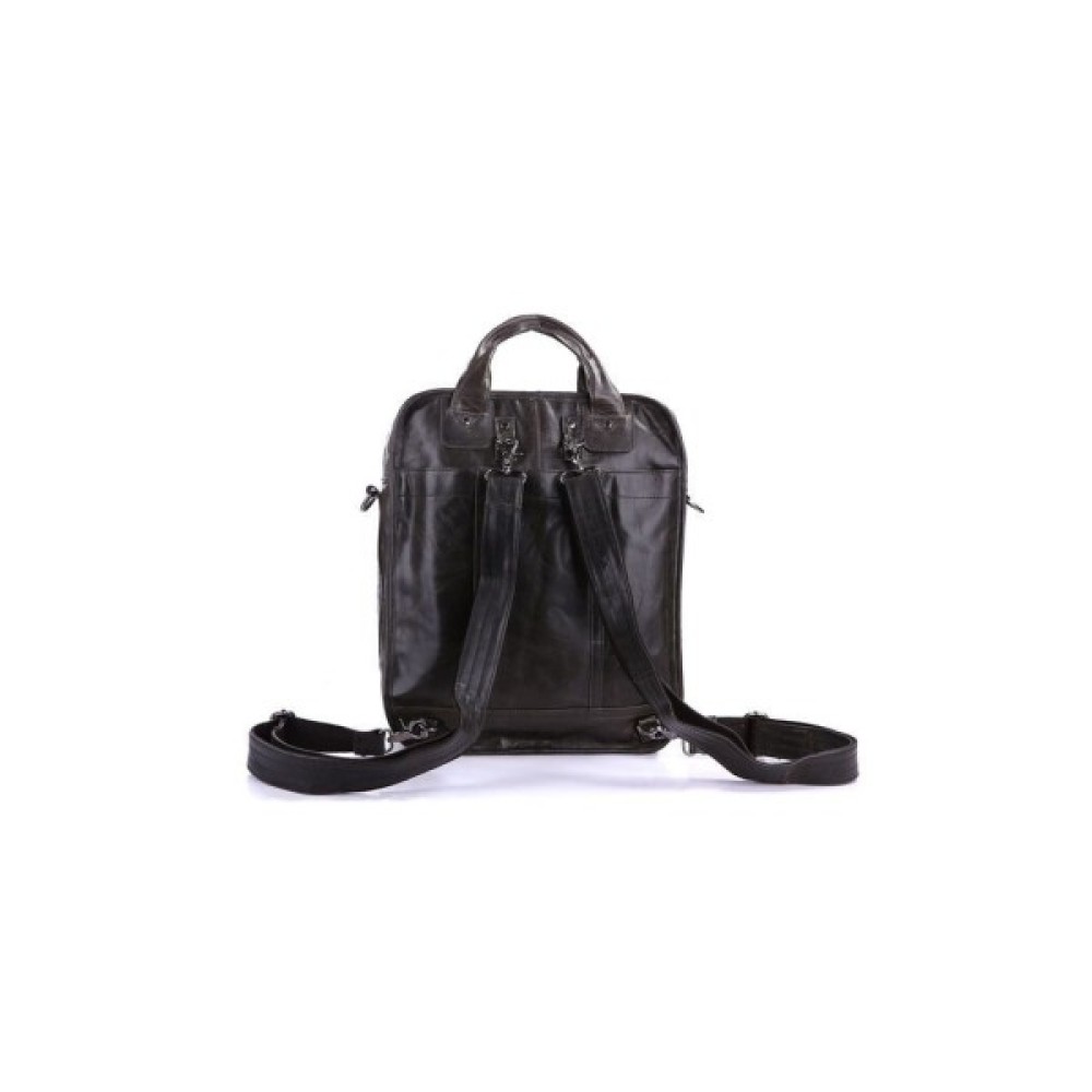 Вертикальна шкіряна сумка трансформер з натуральної шкіри темно-сірого кольору. Сумку можна носити в руці, через плече і за спиною як рюкзак. На лицьовій стороні сумка має велике відділення-кишеню на блискавці, за яким ховається велика потайна кишеня на магнітній кнопці. На задній стороні — величезна накладна кишеня на магнітній кнопці. Внутрішній відсік закривається на блискавку. Всередині є кишеня на блискавці і дві накладні кишені для телефонів.