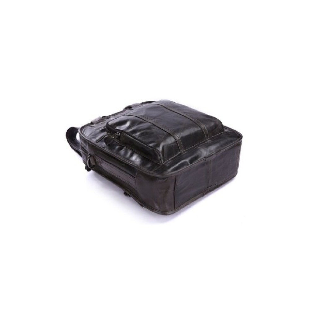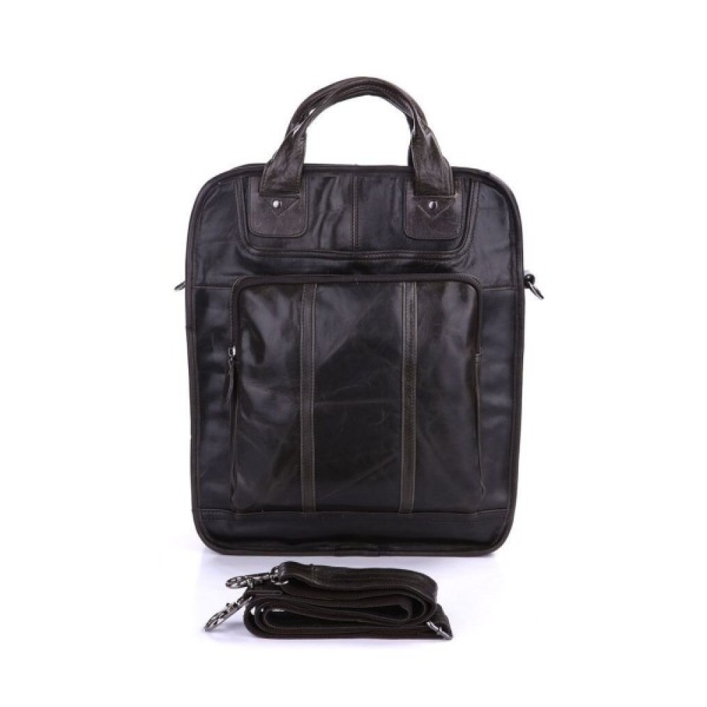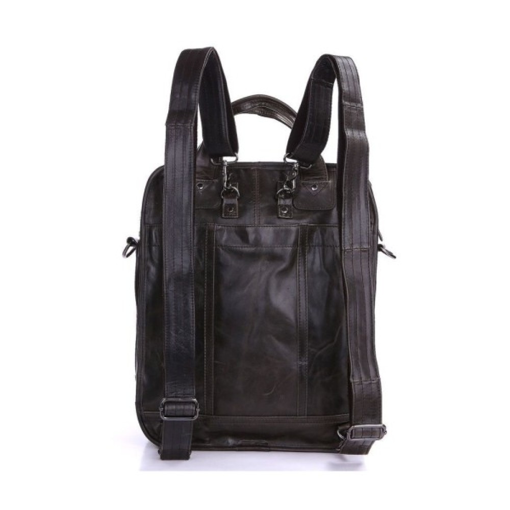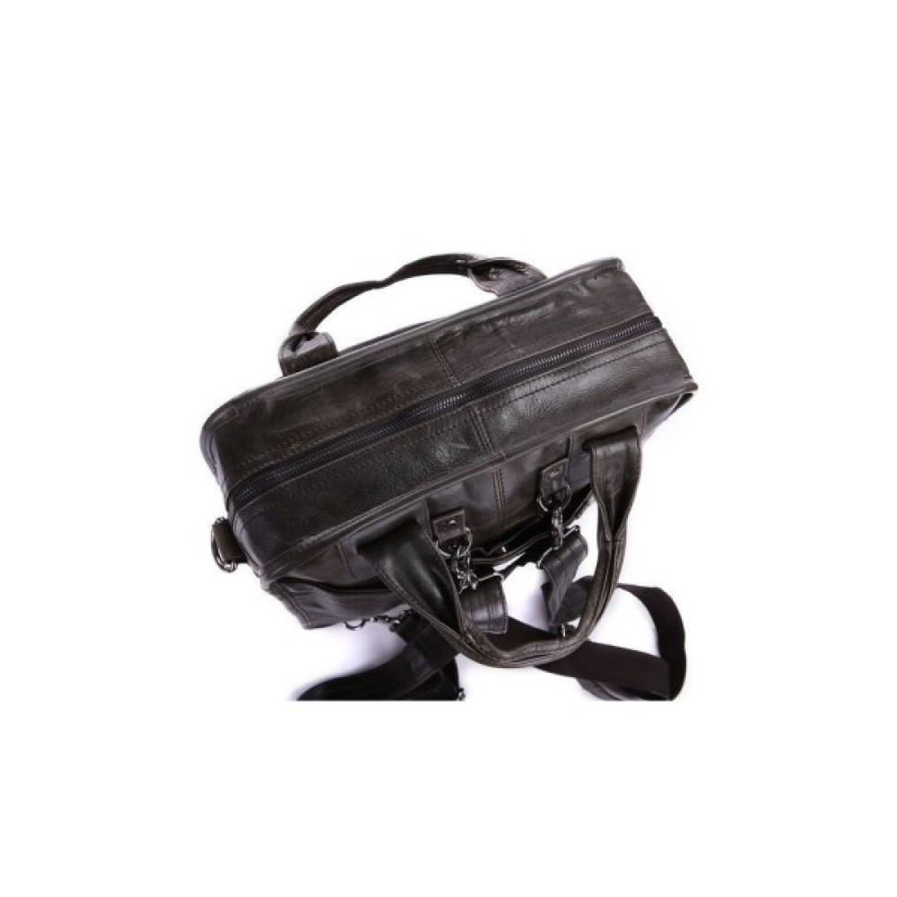 Вертикальна шкіряна сумка трансформер з натуральної шкіри темно-сірого кольору. Сумку можна носити в руці, через плече і за спиною як рюкзак. На лицьовій стороні сумка має велике відділення-кишеню на блискавці, за яким ховається велика потайна кишеня на магнітній кнопці. На задній стороні — величезна накладна кишеня на магнітній кнопці. Внутрішній відсік закривається на блискавку. Всередині є кишеня на блискавці і дві накладні кишені для телефонів.