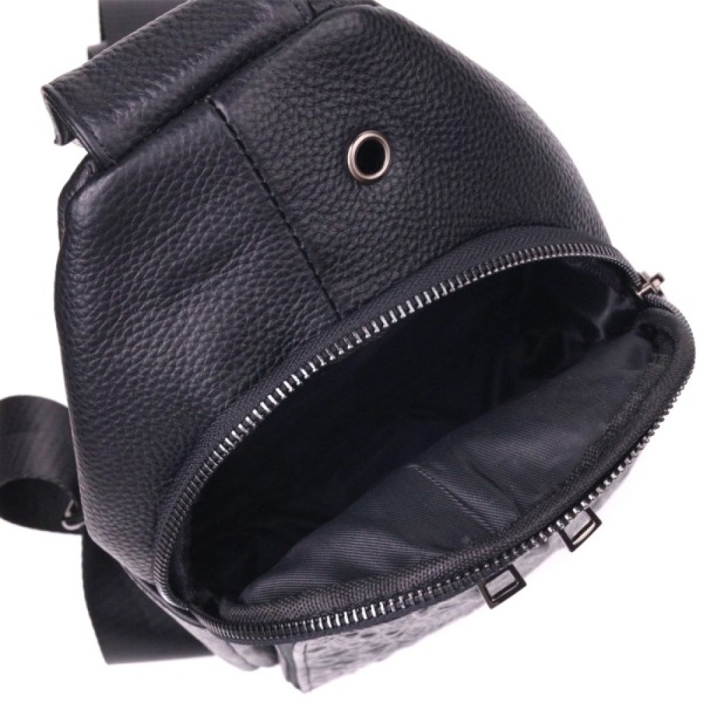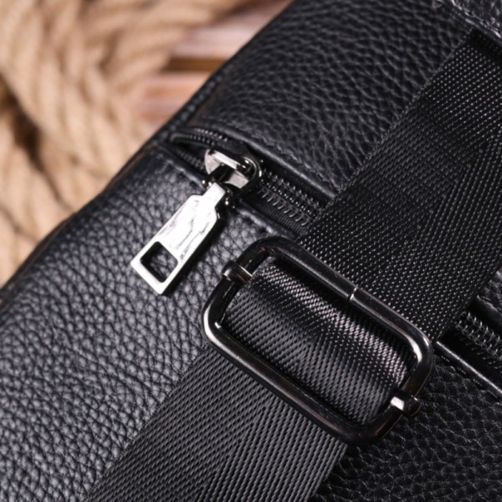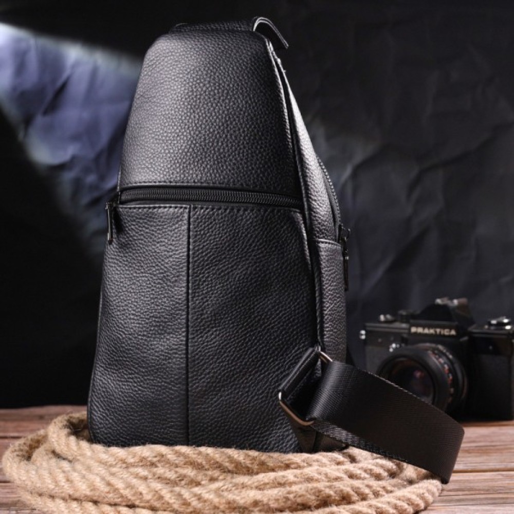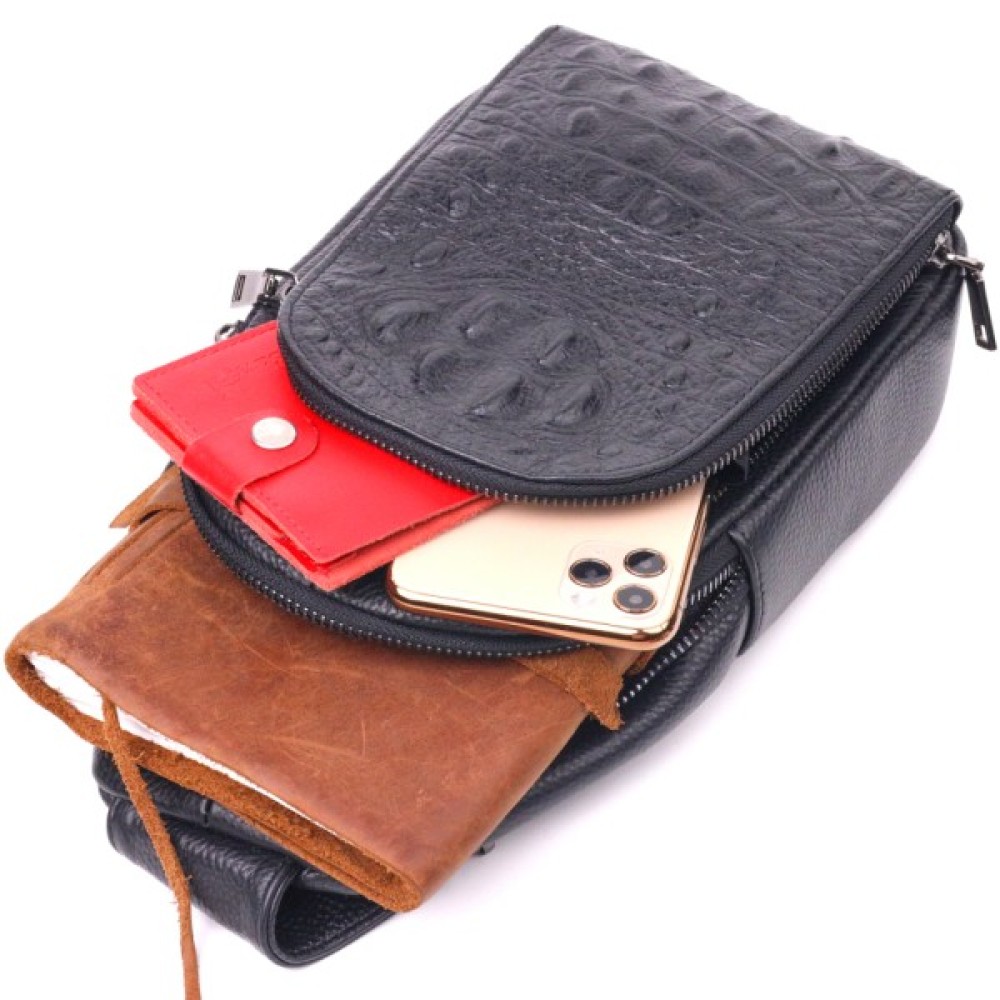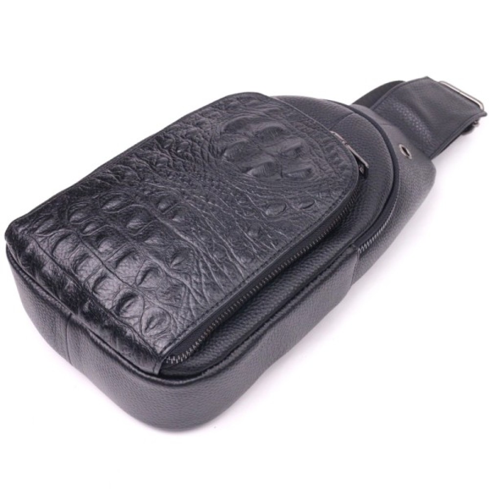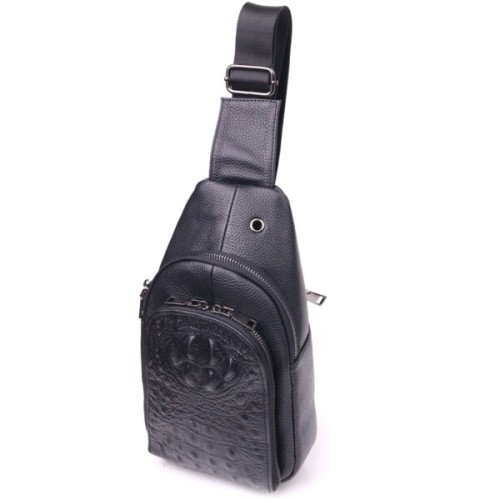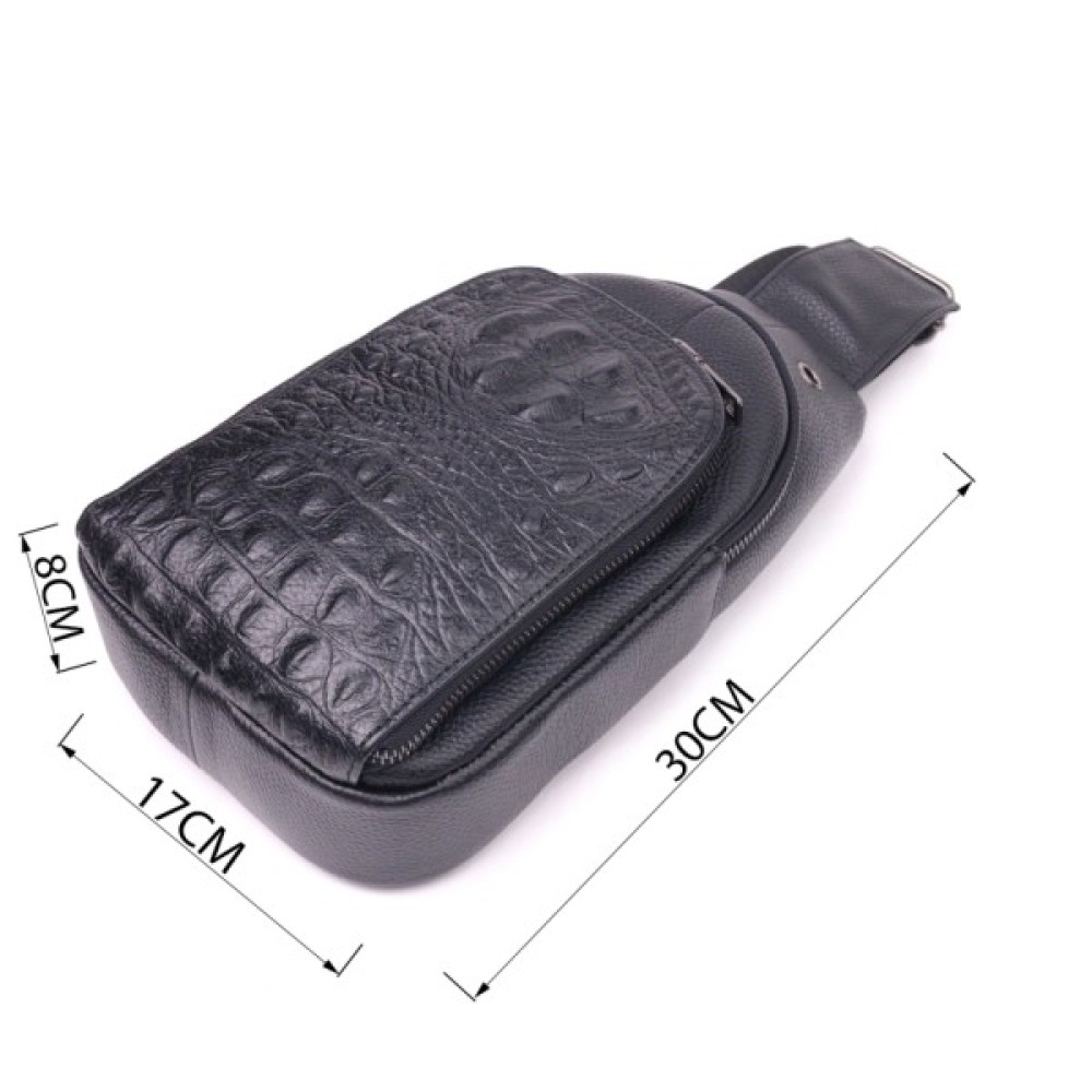 Приваблива чоловіча сумка слінг через плече з натуральної високоякісної шкіри з відмінними характеристиками якості та зносостійкості. Аксесуар має досить містке основне відділення та додаткові кишені на зовнішній та тильній стороні для речей, які мають бути швидко доступні. Акцент сумки, у вигляді тиснення під крокодила, надає їй стильного та цікавого вигляду. Ремінь можна регулювати по довжині, виконаний з високоміцного текстилю. Шкіряна сумка, завжди була чудовим подарунком для рідних та близьких людей.