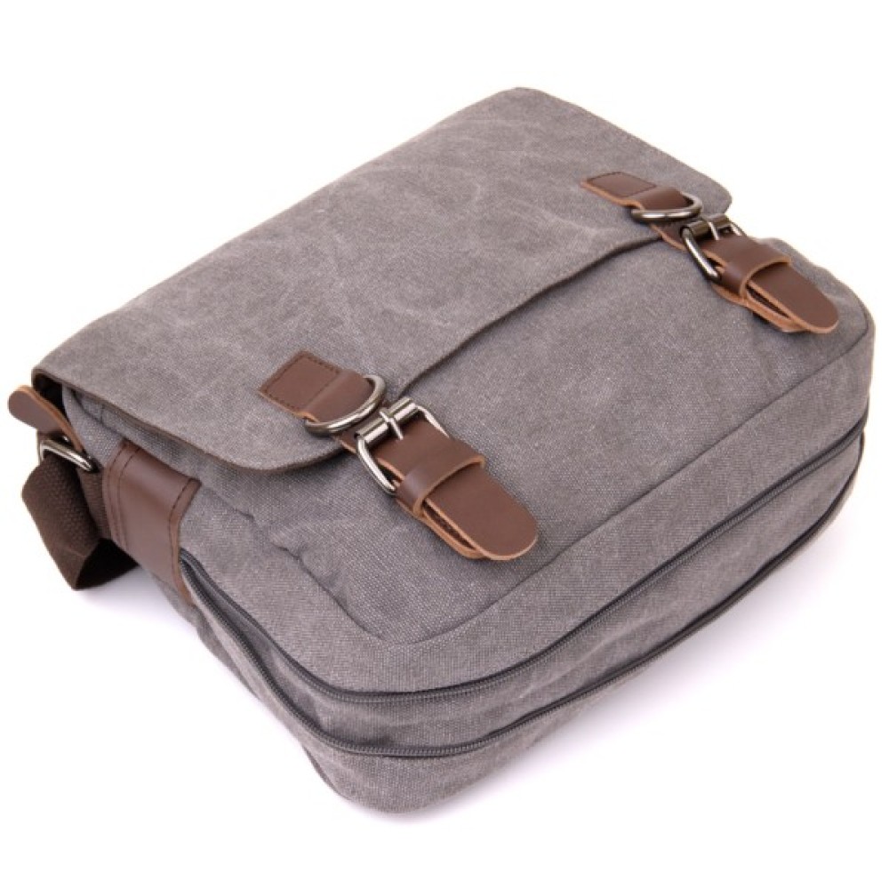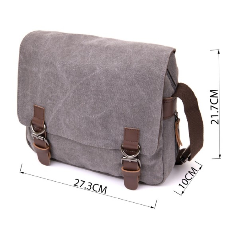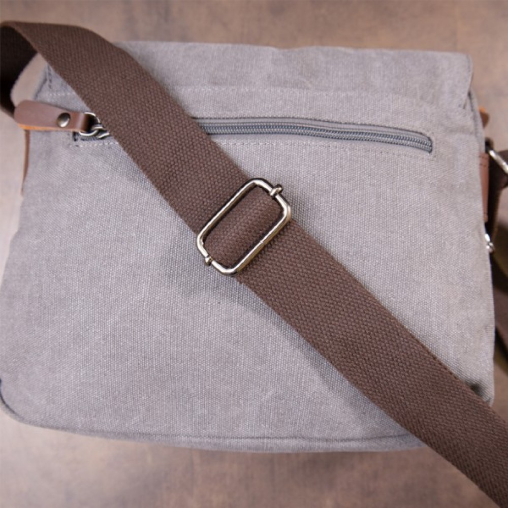 Невелика сумка-почтальонка в універсальному сірому, немаркому кольорі.
