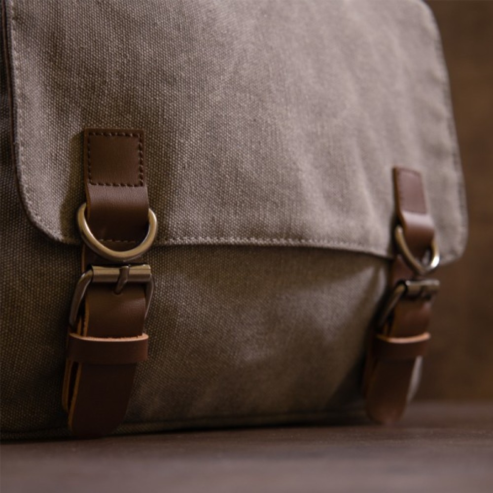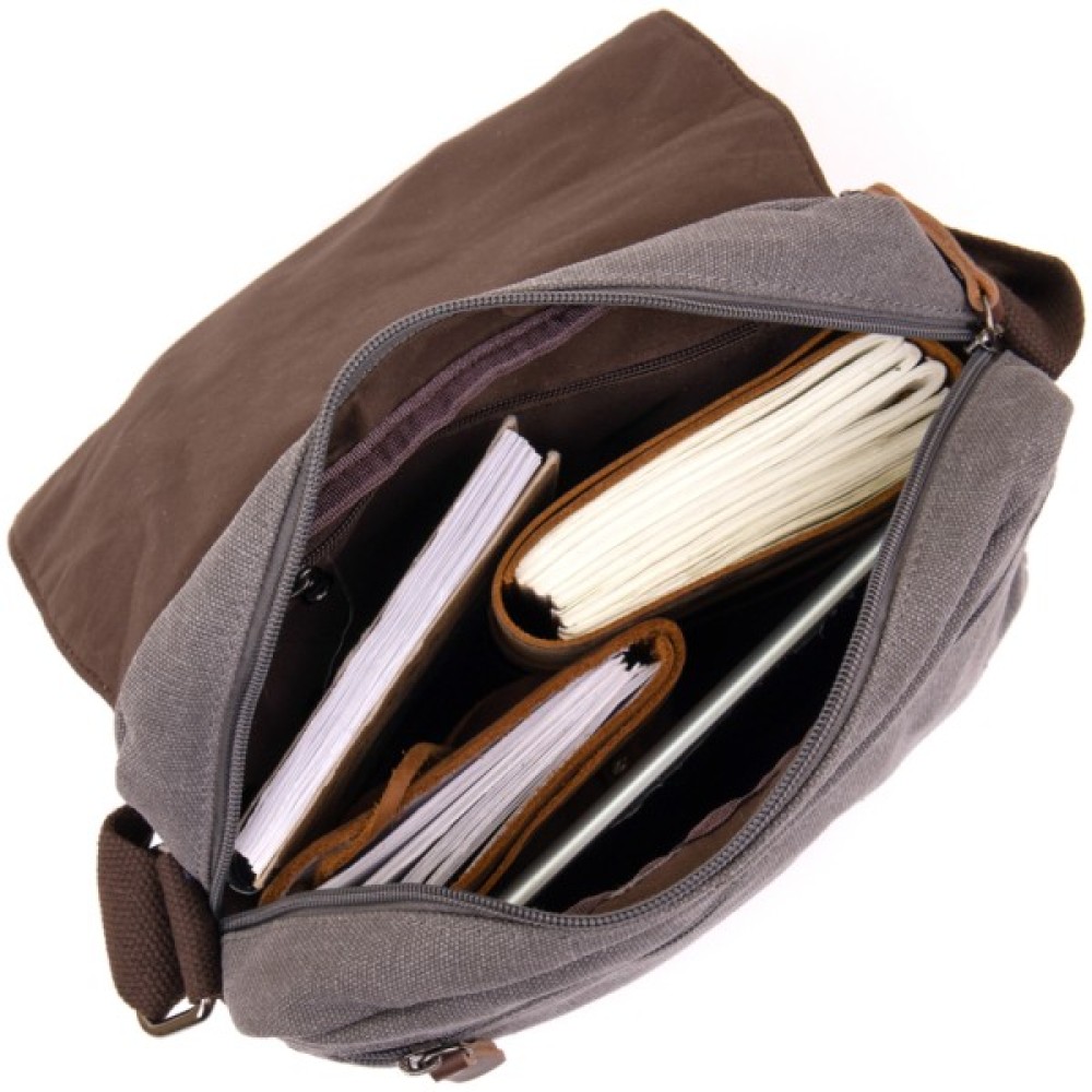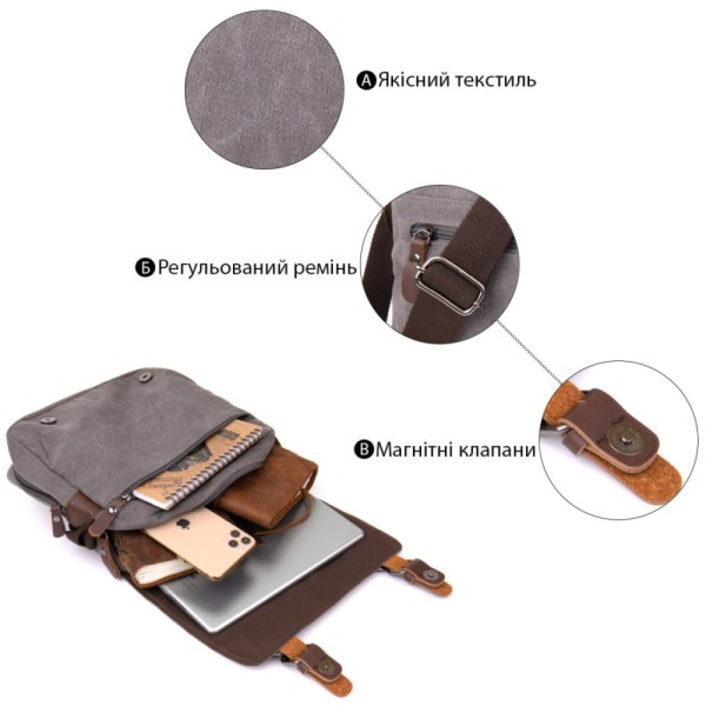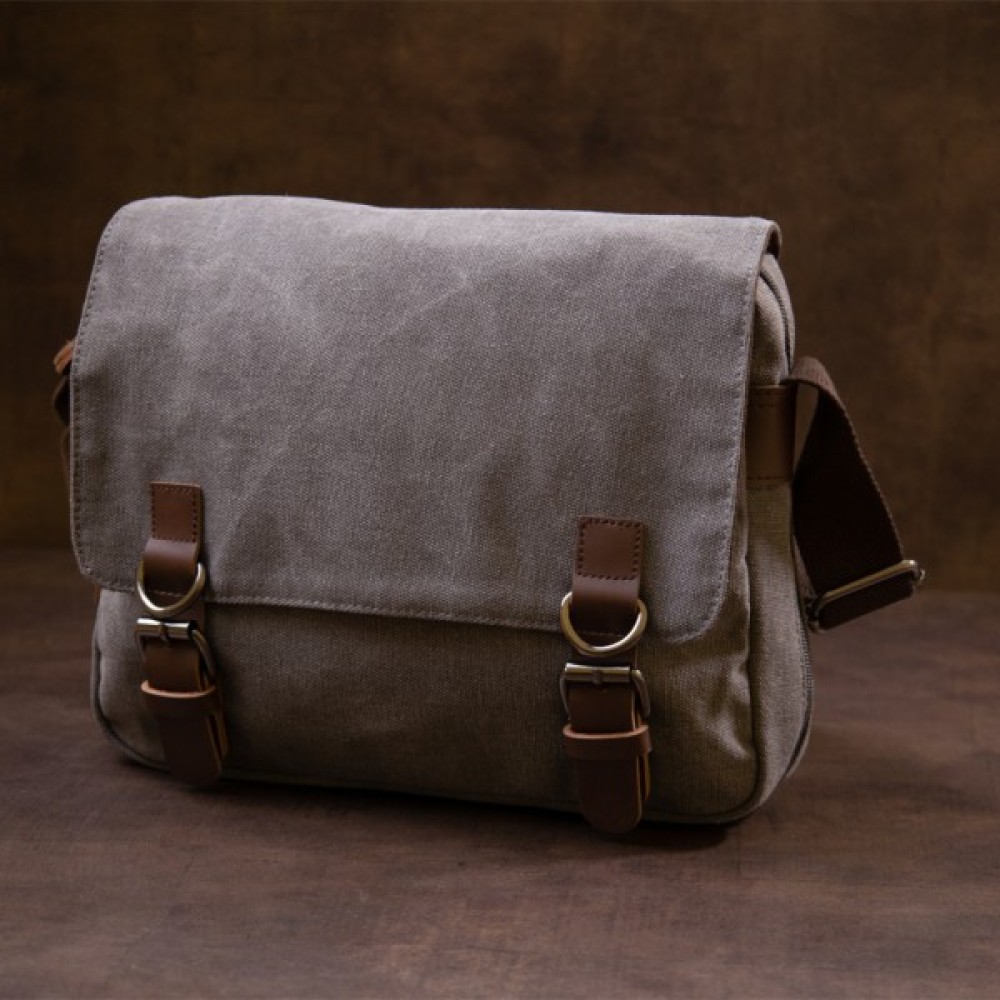 Невелика сумка-почтальонка в універсальному сірому, немаркому кольорі.