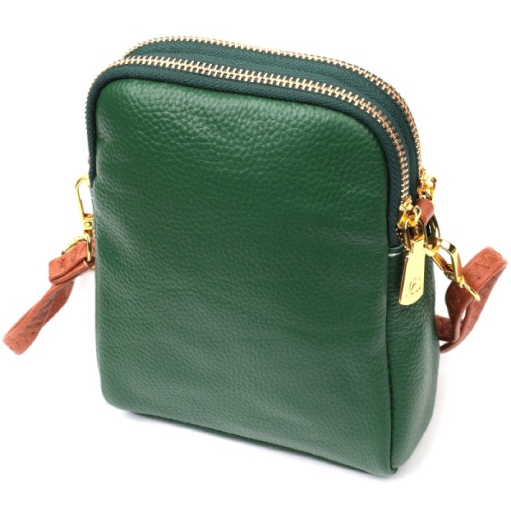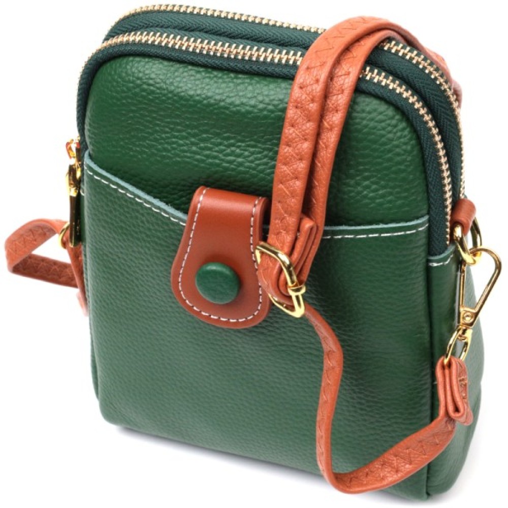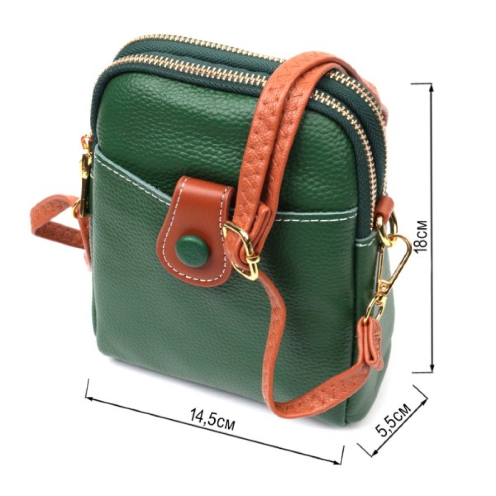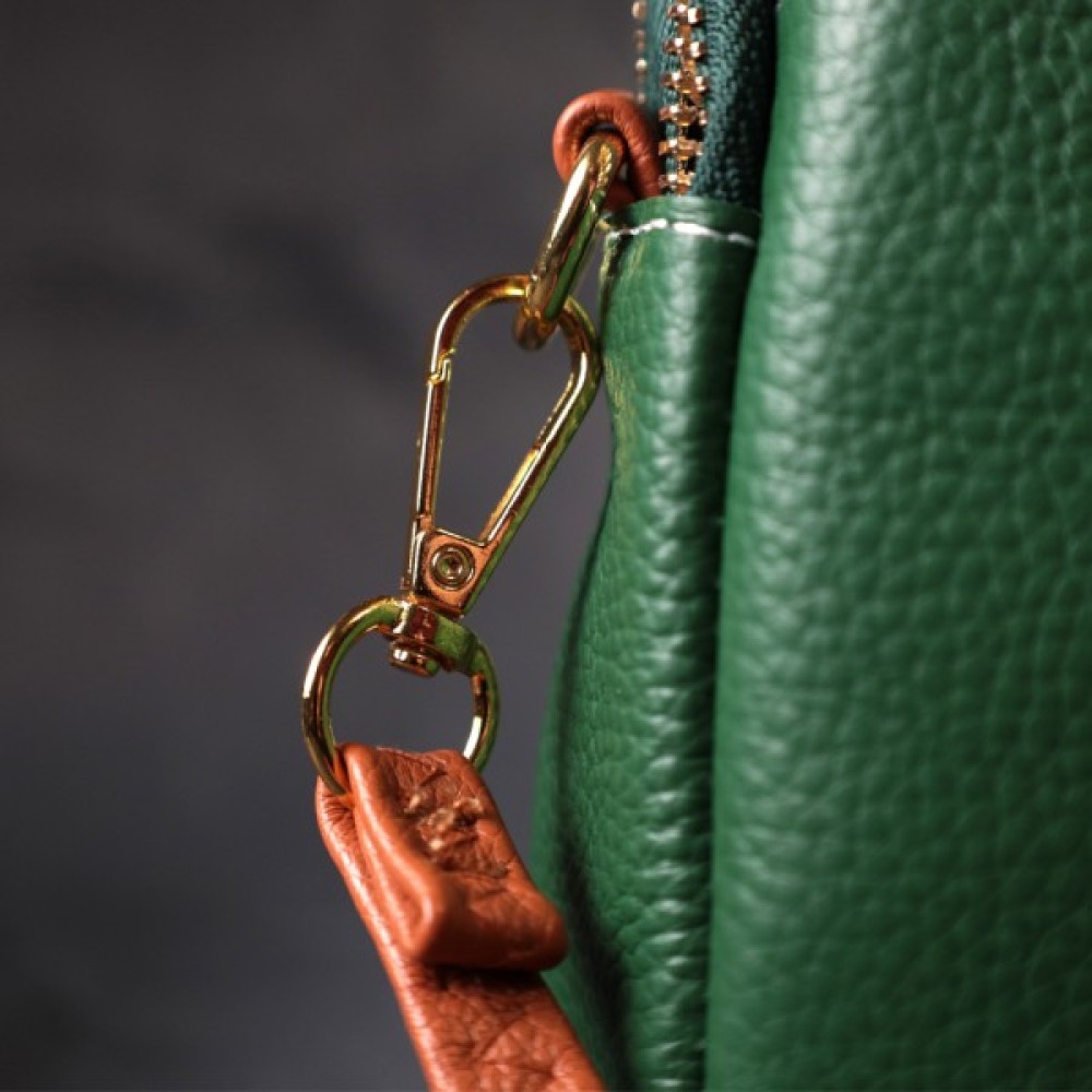 Сумка трапецієподібної форми для стильних та незалежних жінок з натуральної шкіри з високим показником якості та зносостійкості. На лицьовій стороні розташована накладна кишеня, що закривається хлястиком на магніт, хлястик і знімний плечовий ремінь коричневого кольору, що надає сумці стилю. Аксесуар складається з двох відділень, що закриваються на блискавки, всередині яких знаходиться потайна кишеня на блискавці та кишеня відкритого типу. Носити сумку можна на плечі і через плече, для цього є шкіряний ремінь, що знімається. У виробі використано якісну фурнітуру кольору жовтого золота. Універсальний варіант сумки як на вечір так і як сумочка на кожен день.