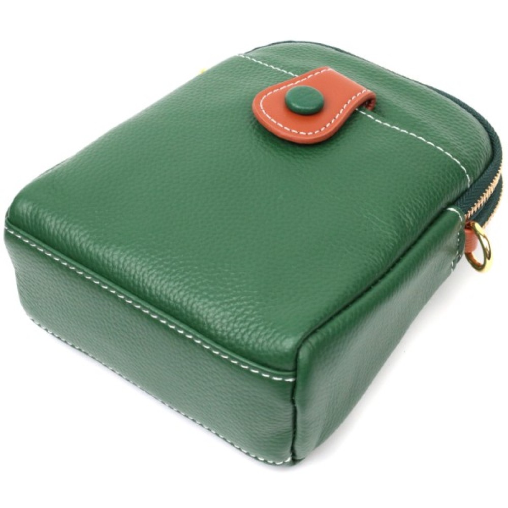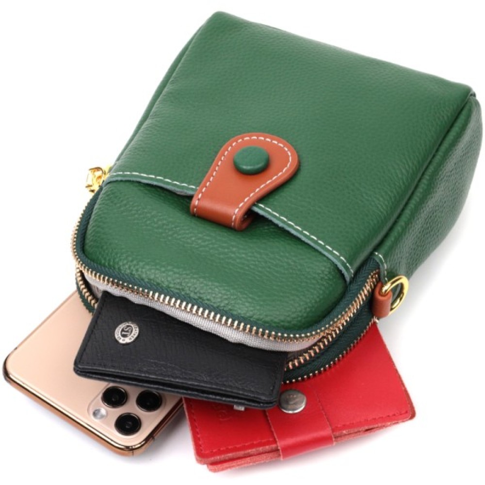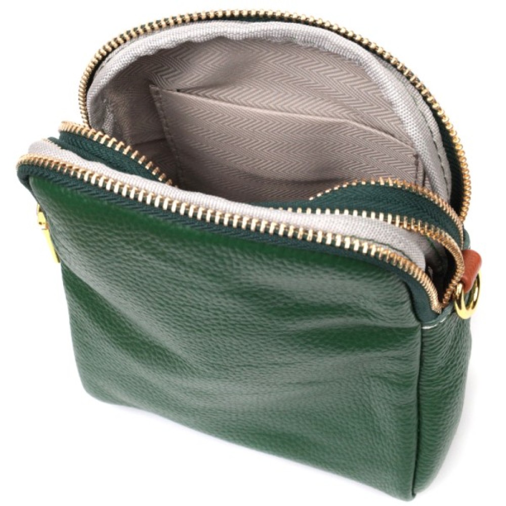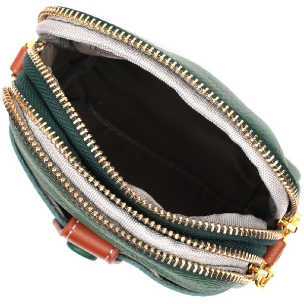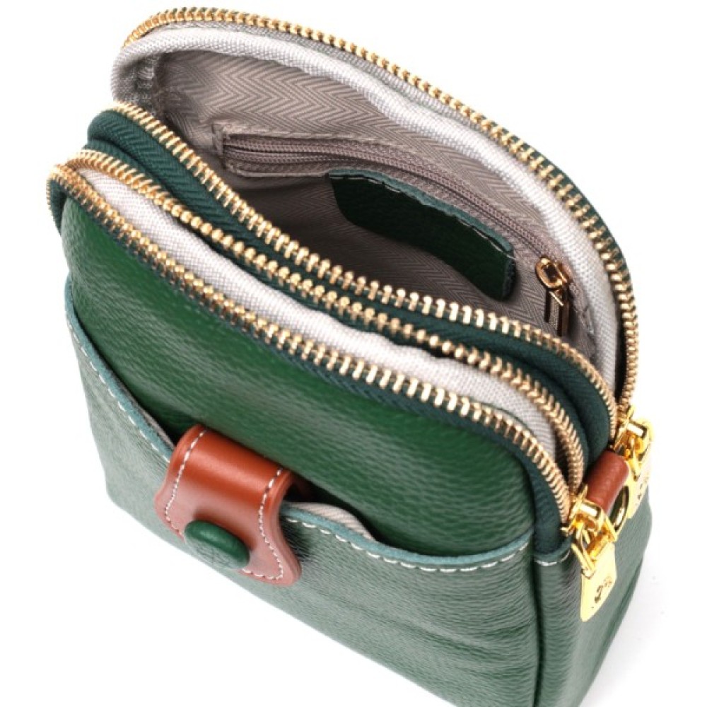 Сумка трапецієподібної форми для стильних та незалежних жінок з натуральної шкіри з високим показником якості та зносостійкості. На лицьовій стороні розташована накладна кишеня, що закривається хлястиком на магніт, хлястик і знімний плечовий ремінь коричневого кольору, що надає сумці стилю. Аксесуар складається з двох відділень, що закриваються на блискавки, всередині яких знаходиться потайна кишеня на блискавці та кишеня відкритого типу. Носити сумку можна на плечі і через плече, для цього є шкіряний ремінь, що знімається. У виробі використано якісну фурнітуру кольору жовтого золота. Універсальний варіант сумки як на вечір так і як сумочка на кожен день.