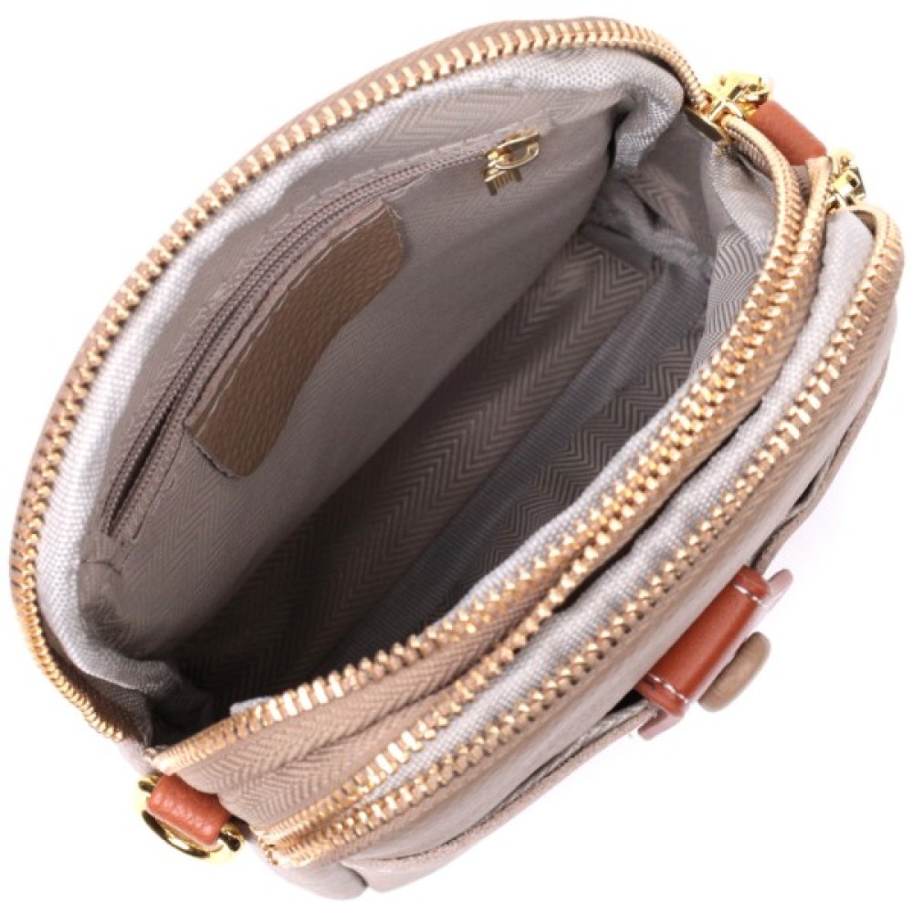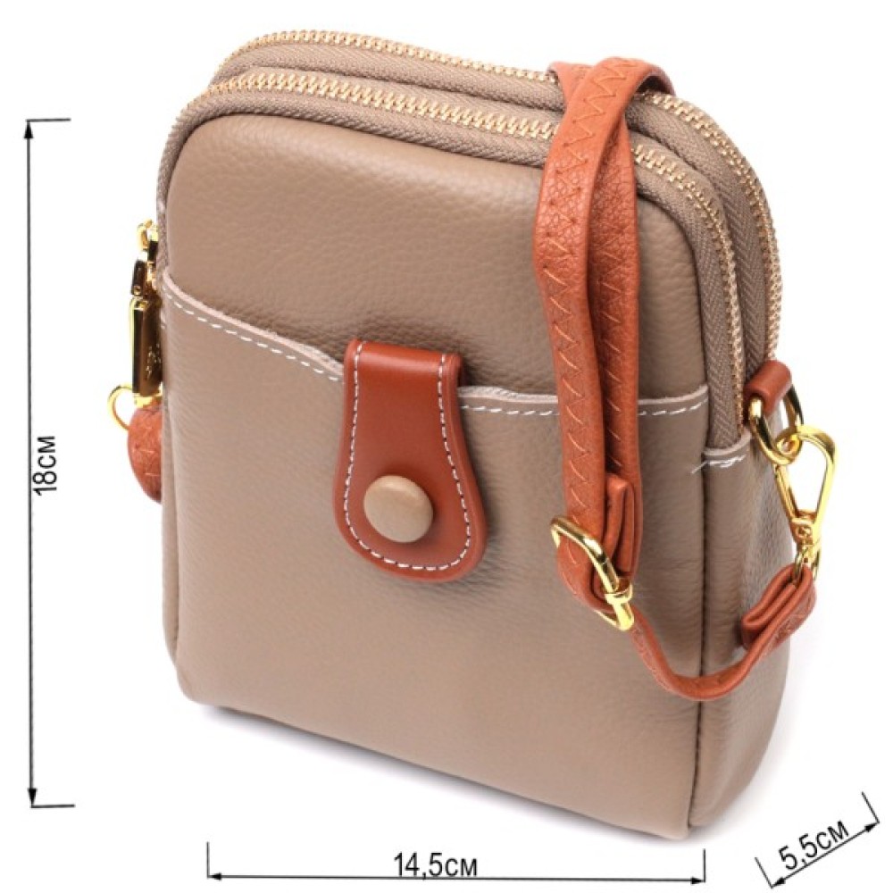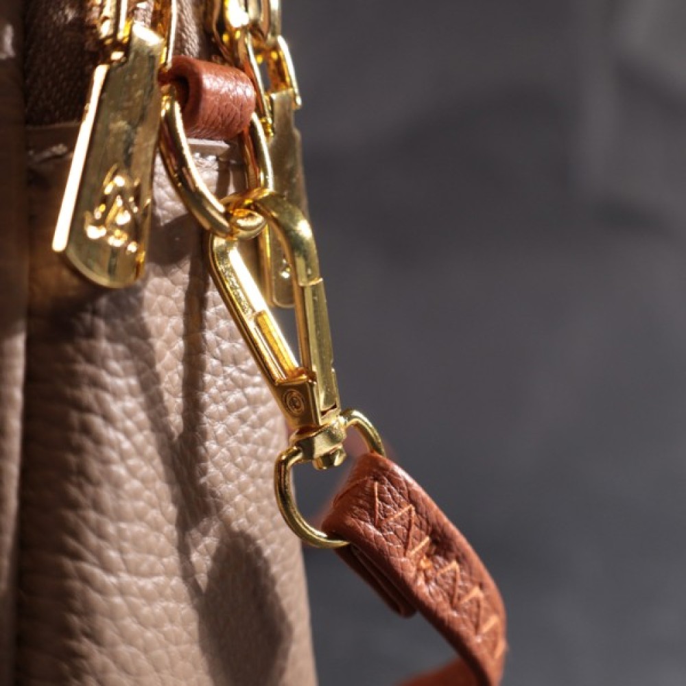На лицьовій стороні розташована накладна кишеня, що закривається хлястиком на магніт, хлястик і знімний плечовий ремінь коричневого кольору, що надає сумці стилю. Аксесуар складається з двох відділень, що закриваються на блискавки, всередині яких знаходиться потайна кишеня на блискавці та кишеня відкритого типу. Носити сумку можна на плечі і через плече, для цього є шкіряний ремінь, що знімається. У виробі використано якісну фурнітуру кольору жовтого золота. Універсальний варіант сумки як на вечір так і як сумочка на кожен день.