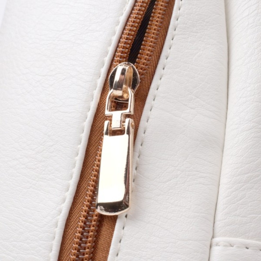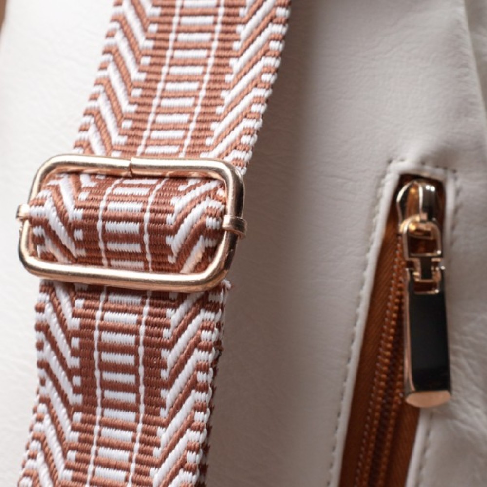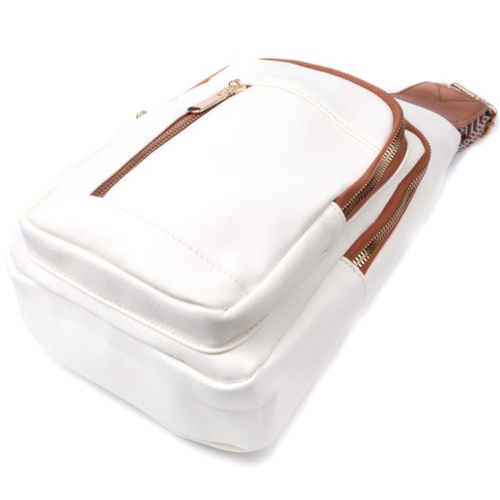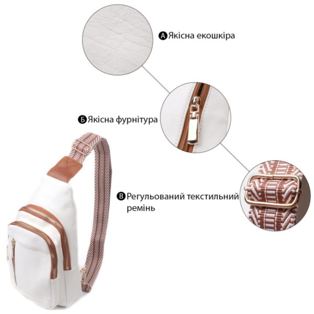 Красива слінг-сумка з якісної екошкіри у білому кольорі з коричневими акцентами. Екошкіра — стійкий до зношування матеріал, що добре переносить холод і має гіпоалергенний склад. Модель має одне основне відділення з блискавкою, потайну кишеню, а також три зовнішні кишені і отвір для навушників або зарядного кабелю. Головною фішкою моделі є регульований текстильний ремінець зі стильним візерунком. Ідеально підходить як щоденна сумка на будь-яку пору року.