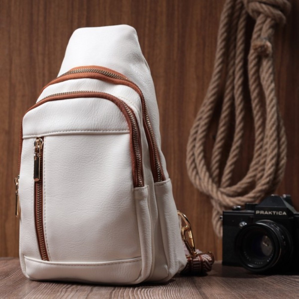Жіноча слінг-сумка з екошкіри білого кольору з коричневими акцентами