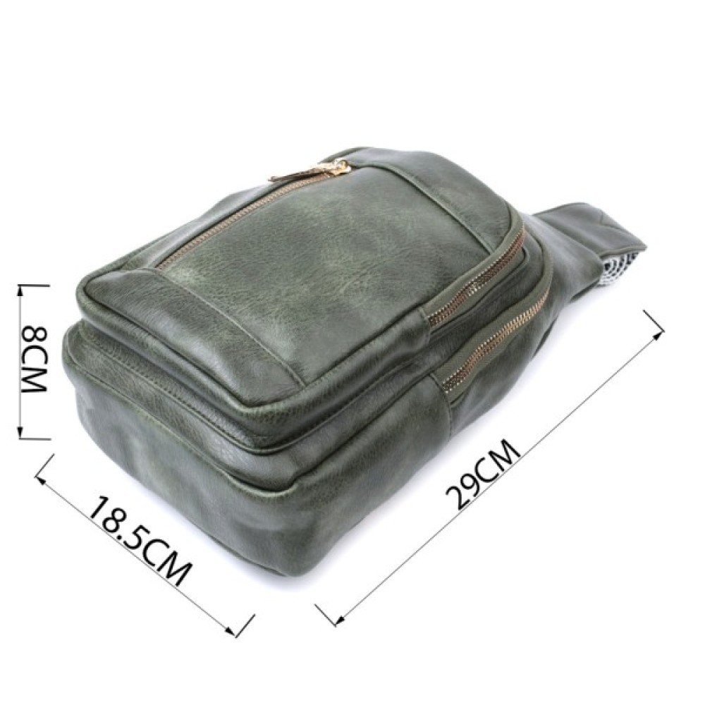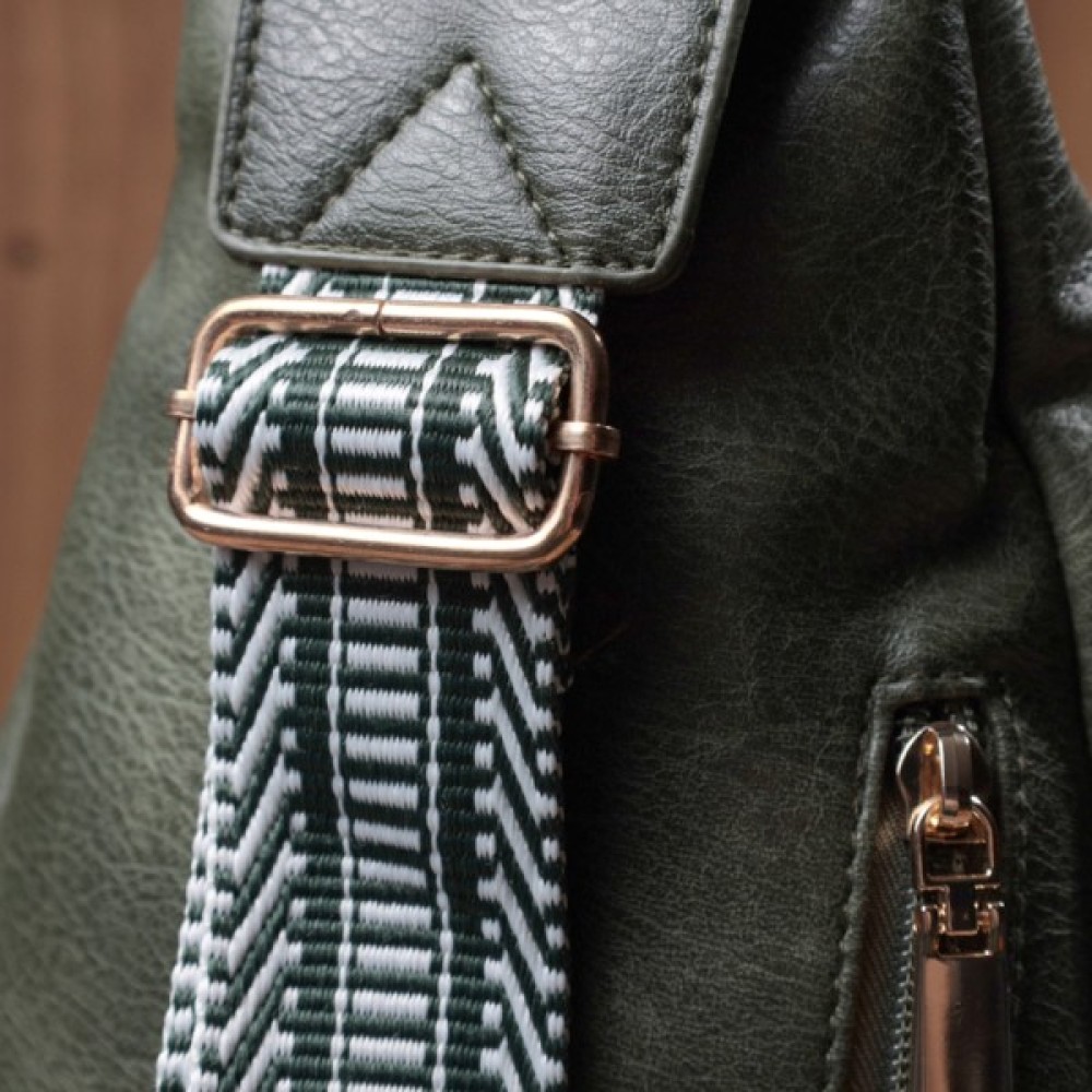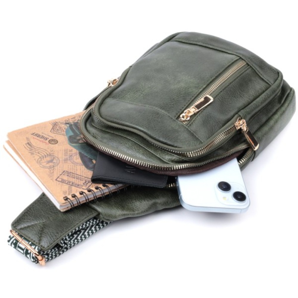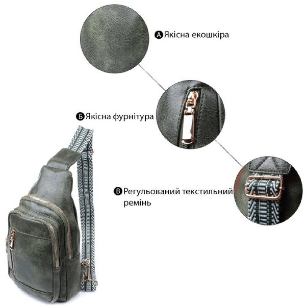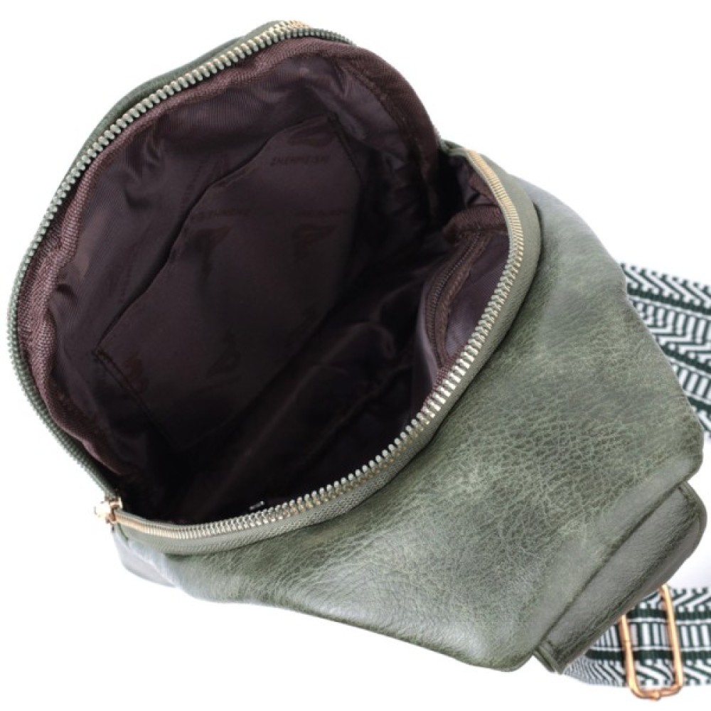 Стильна та зручна слінг сумка з якісної екошкіри. Екошкіра – високоякісна альтернатива натуральному матеріалу, яка дуже стійка до тертя, до низьких температур, відмінно носиться на відміну від інших штучних матеріалів, а також має гіпоалергенний склад на відміну від натуральної шкіри. Дана модель складається з одного основного відділення, яке закривається на блискавку і в якому знаходиться потаємна кишеня, а також трьох кишень зовні та одного отвору для кабелю або навушників, що дуже зручно в сучасному світі. Основною фішкою моделі є зручний регульований плечовий ремінець із стильним візерунком. Відмінний варіант сумки на кожен день та у будь-який сезон.