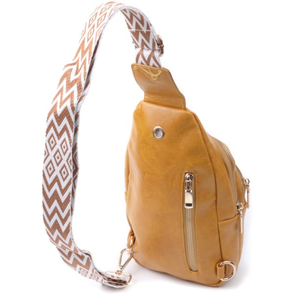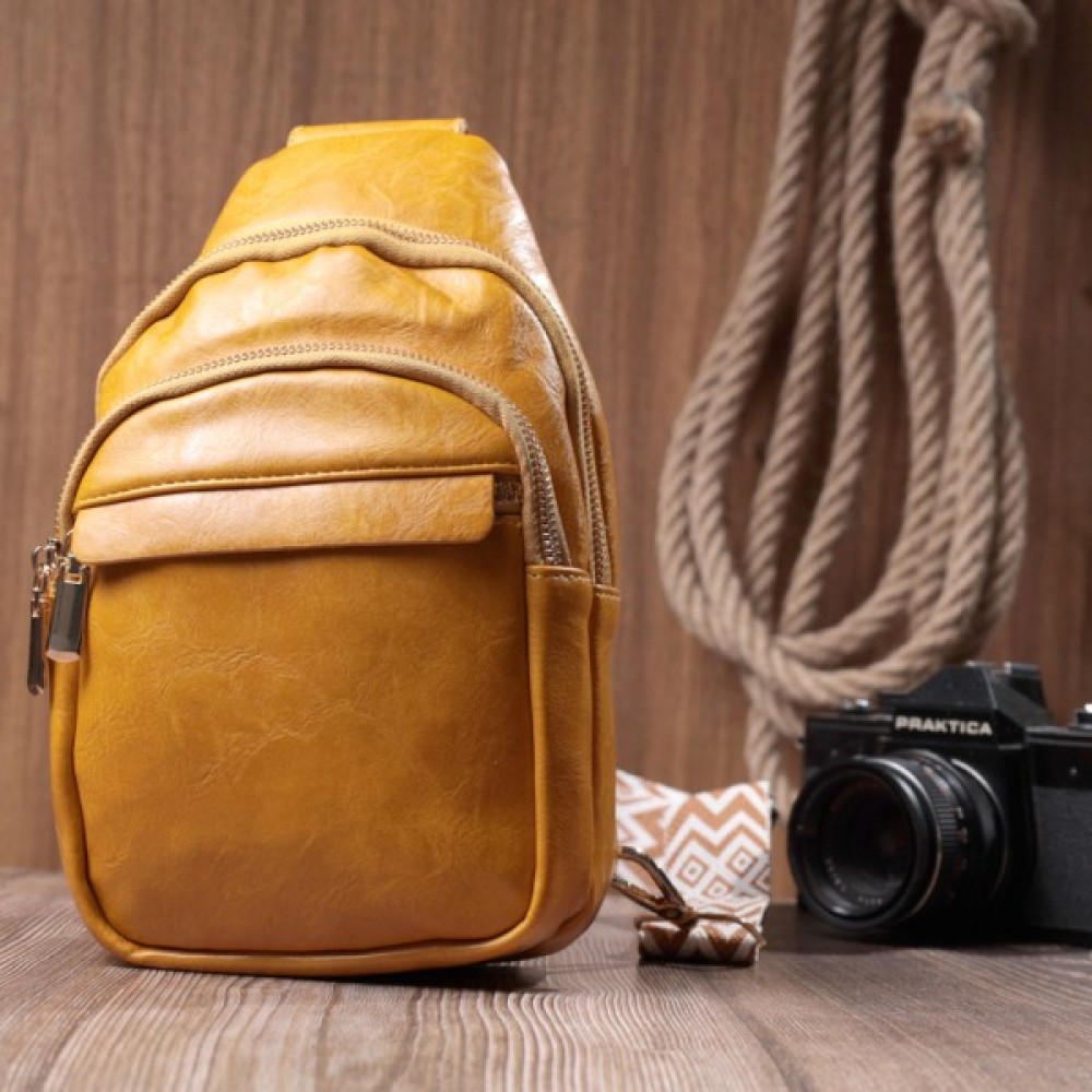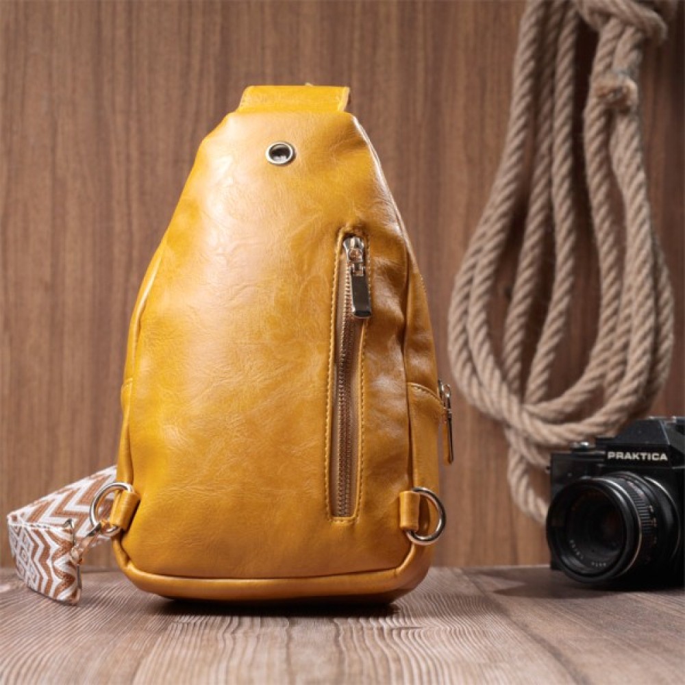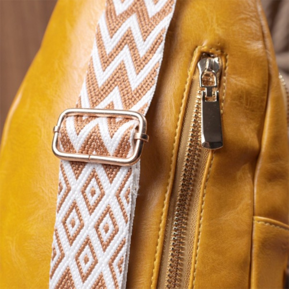 Функціональна слінг сумка для жінок з гладкої екошкіри. Дана модель складається з одного основного відділення, яке закривається на блискавку і в якому знаходиться кишеня на блискавці і три кишені для кредитних карток усередині, а також трьох кишень зовні та одного отвору для кабелю або навушників, що дуже зручно в сучасному світі. Акцентом даної моделі є зручний регульований плечовий ремінець у етнічному стилі, що дуже модно вже кілька сезонів. Екошкіра - високоякісна альтернатива натуральному матеріалу, яка дуже стійка до тертя, до низьких температур, відмінно носиться на відміну від інших штучних матеріалів, а також має гіпоалергенний склад на відміну від натуральної шкіри.