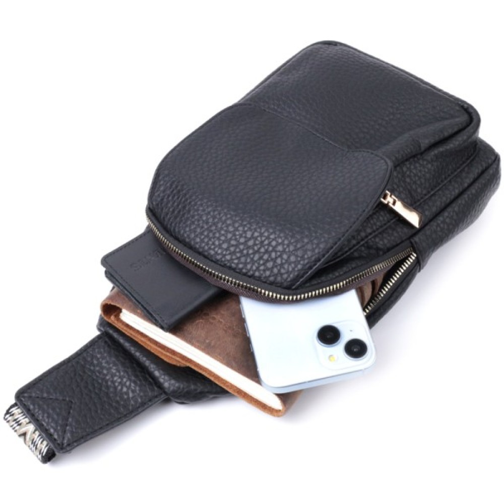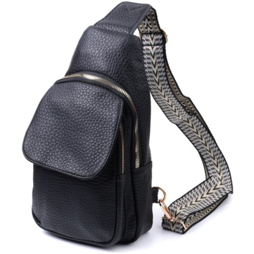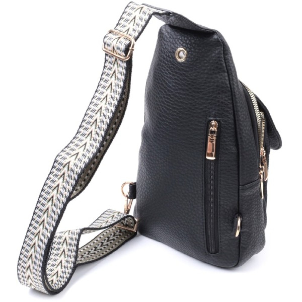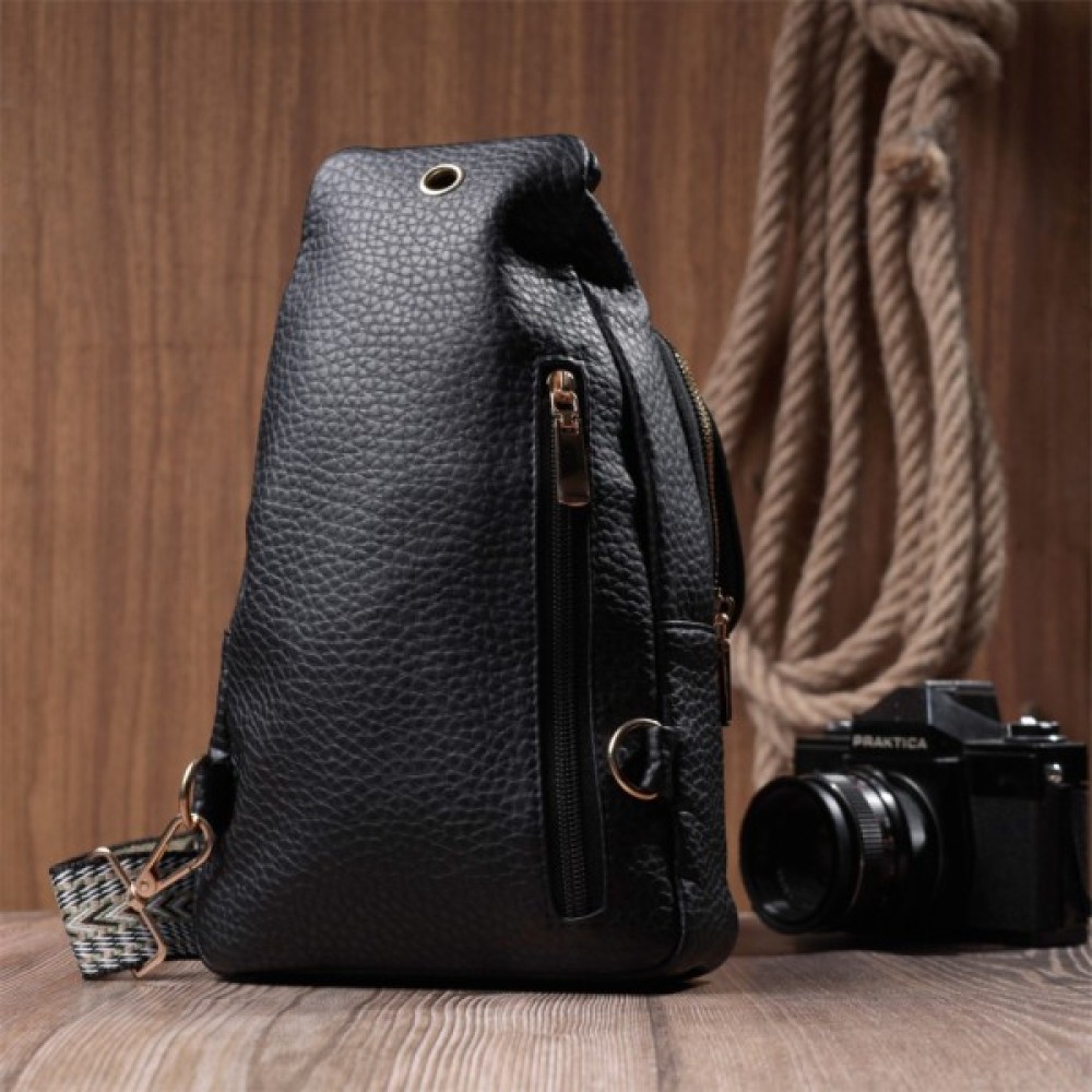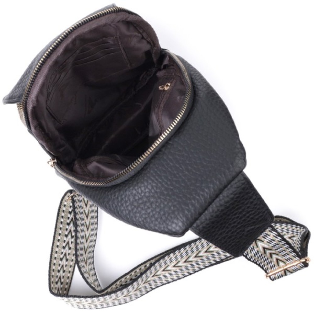 Зручна жіноча слінг сумка із зернистої екошкіри в цікавому чорному кольорі. Ця модель складається з одного основного відділення, яке закривається на блискавку і в якому знаходиться кишеня на блискавці і чотири кишені для кредитних карток усередині, а також двох кишень зовні та одного отвору для кабелю або навушників, що дуже зручно в сучасному світі. Акцентом даної моделі є зручний регульований плечовий ремінець у етнічному стилі, що дуже модно вже кілька сезонів. Екошкіра - високоякісна альтернатива натуральному матеріалу, яка дуже стійка до тертя, до низьких температур, відмінно носиться на відміну від інших штучних матеріалів, а також має гіпоалергенний склад на відміну від натуральної шкіри.