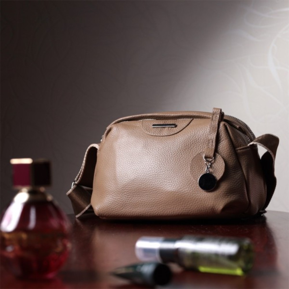 Жіноча сумка з натуральної шкіри флотар, яка має зернисту фактуру. У виробі використано шкіру бежевого кольору. Аксесуар складається з двох відділень, які закриваються на блискавки, потайної кишені на блискавці та кишені відкритого типу, а також кишені зовні на тильній стороні. Виріб має тверде дно, що дозволяє зберігати форму. Носити сумку можна в руці, під рукою, на плечі і через плече, для цього є текстильний ремінь, що не знімається. В аксесуарі використано якісну фурнітуру кольору срібла. Відмінний варіант для подарунка близьким та дорогим дівчатам та жінкам.